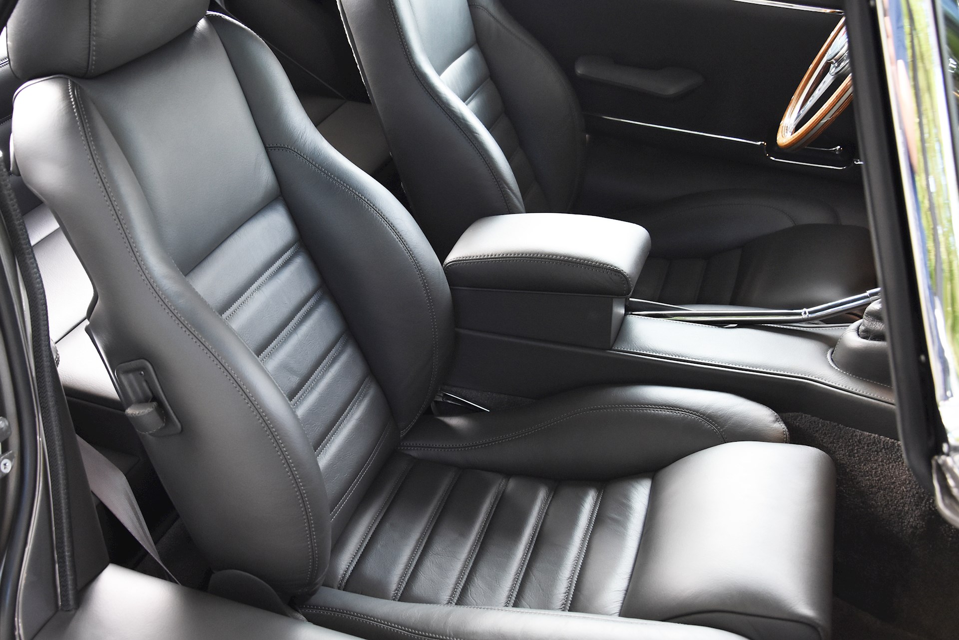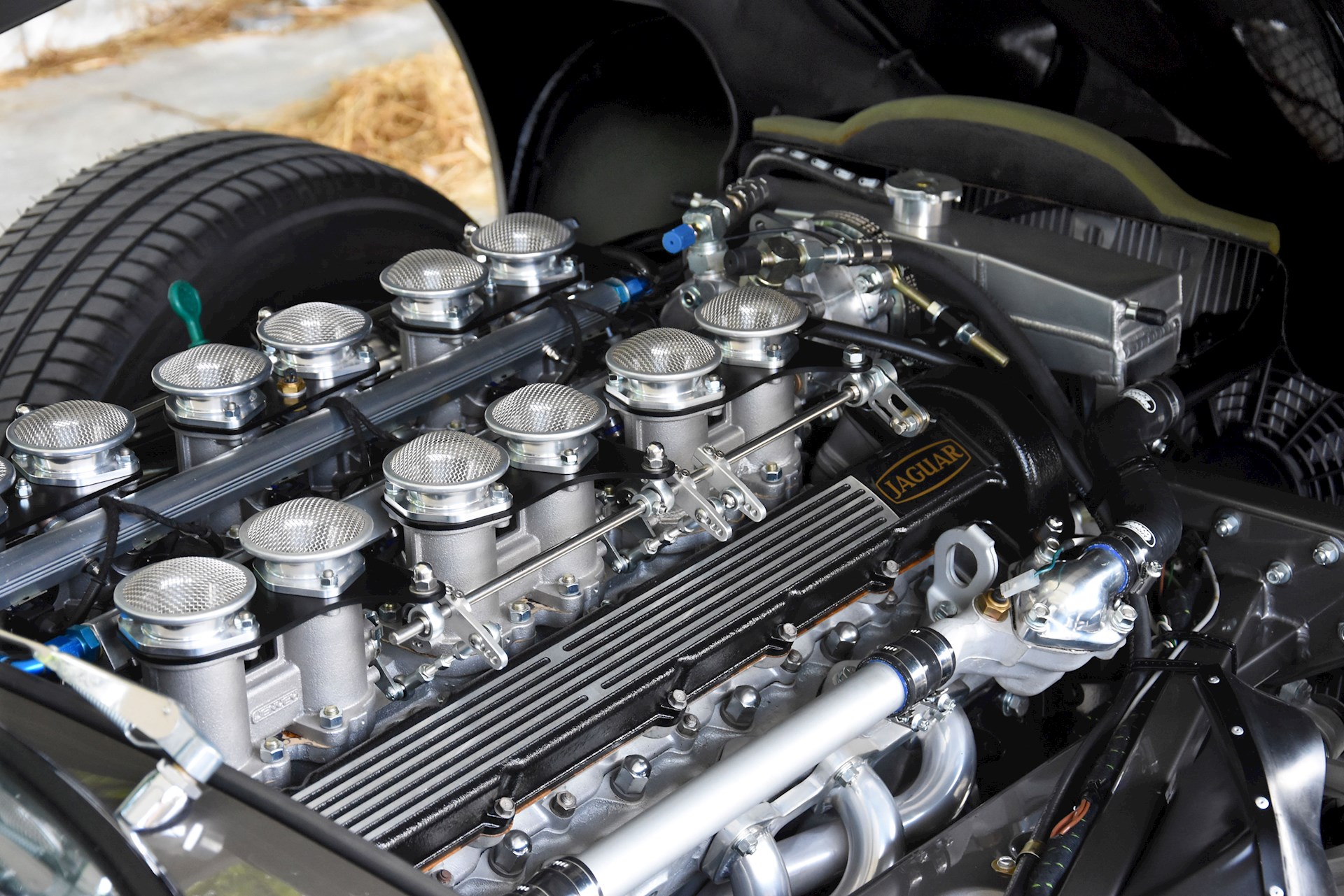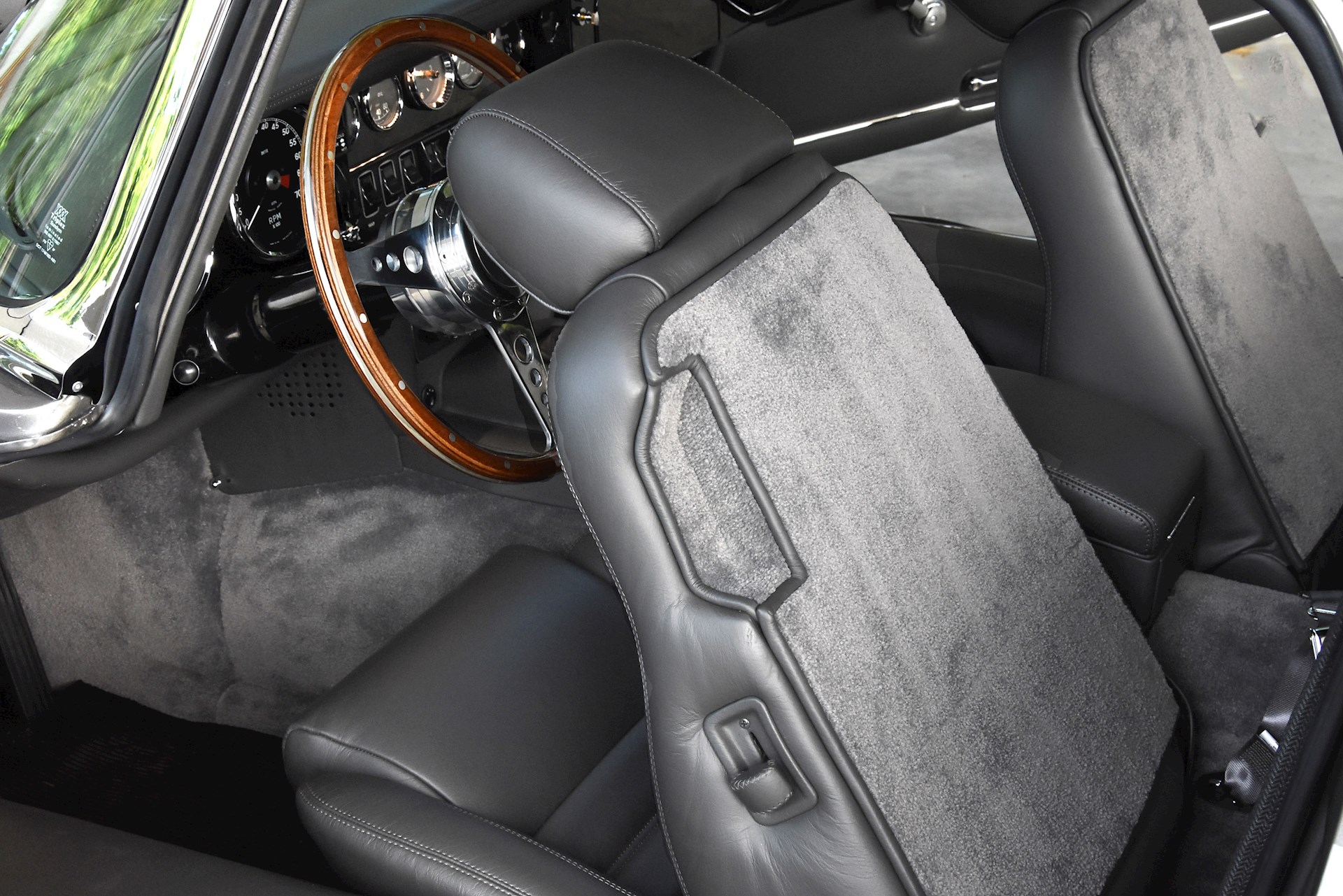 The V12 engine, originally 5.3 litres in capacity and utilising Stromberg carburetors, was fully rebuilt and reworked. As specialists in fuel-injecting E-Types, the team created a totally bespoke downdraft fuel injection system for the car with Jenvy throttle bodies, Emerald ECU and full custom wiring loom. The capacity of the engine was increased to 6.1 litres and now produces a dyno-proven 284bhp at the rear wheels. Topped with stunning custom made velocity stacks, the engine produces an exceptional tone through a 12-branch stainless steel exhaust system.