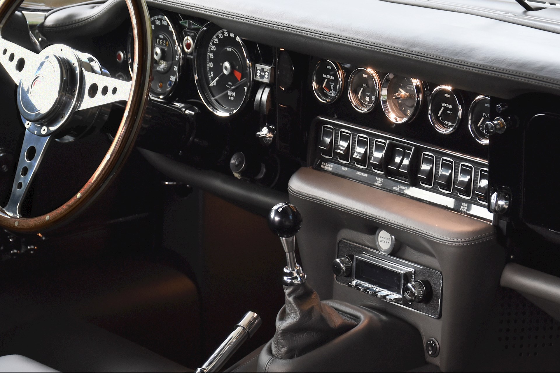 Inside the car, a fully bespoke leather interior was created. The seat bases were lowered for a better driving position, with custom created seats complete with seat heating. Beneath the interior lies Dynamat sound deadening, adding to the audio experience of the iPod and Bluetooth connected surround sound. Something of a motif throughout the car is the subtle use of LED lighting, with the interior benefitting from custom footwell lighting, door floodlighting and boot lighting. With a full external light conversion to LEDs, including Daytime Running Lights, this E-Type is the perfect mix of modern practicality and classic style. Complete with glowing red start button sitting beneath the piano black dash, the interior also benefits from a custom air conditioning system.