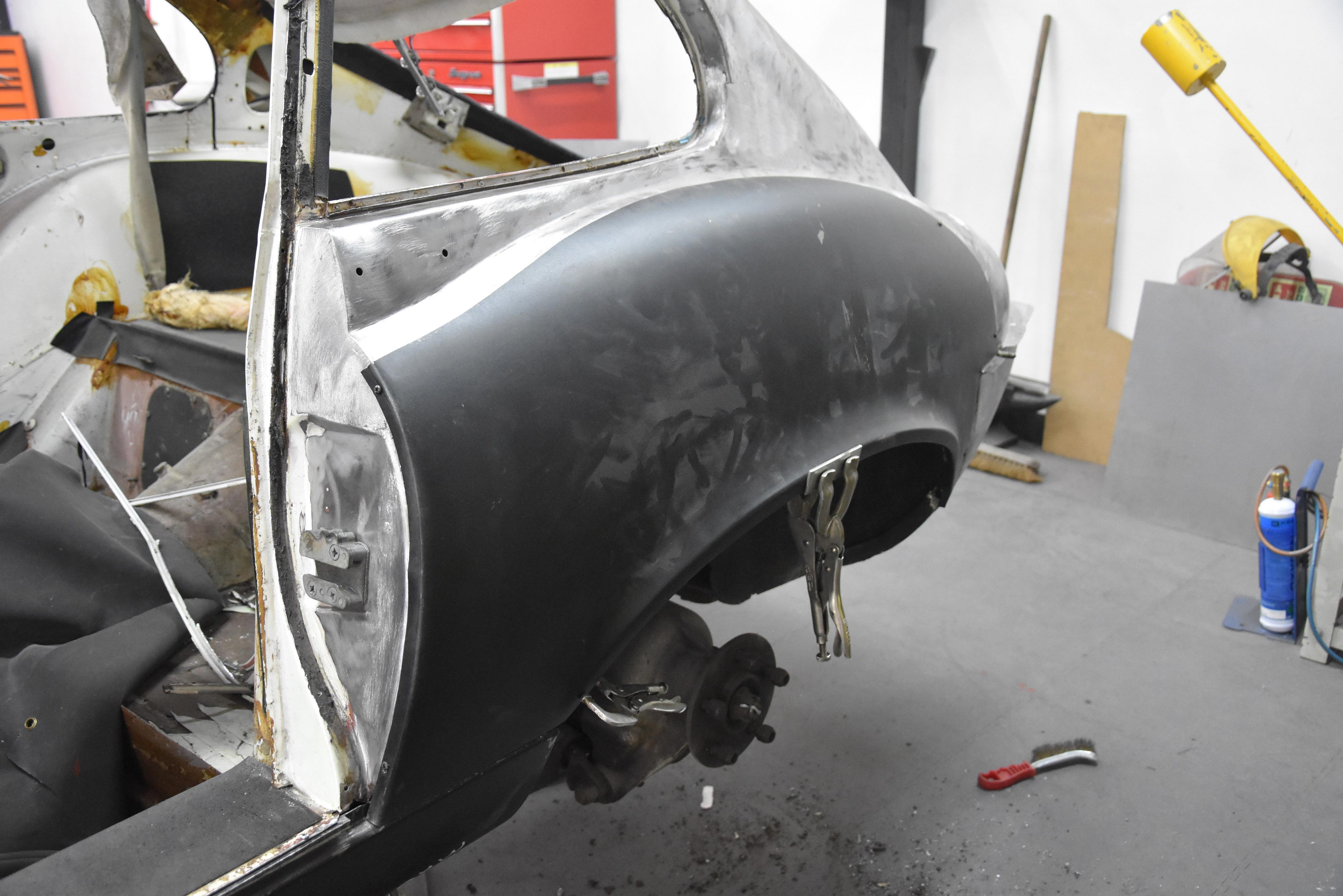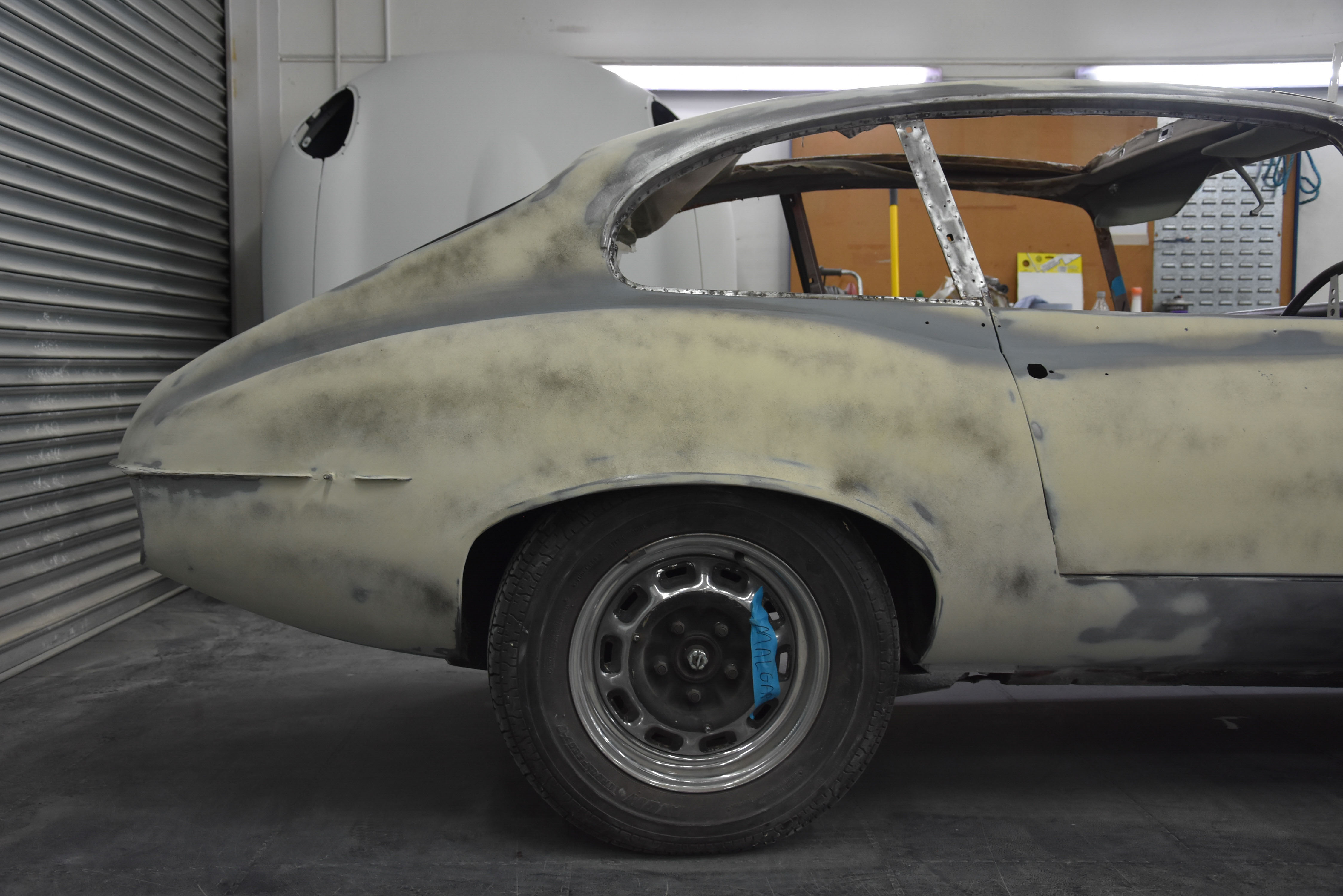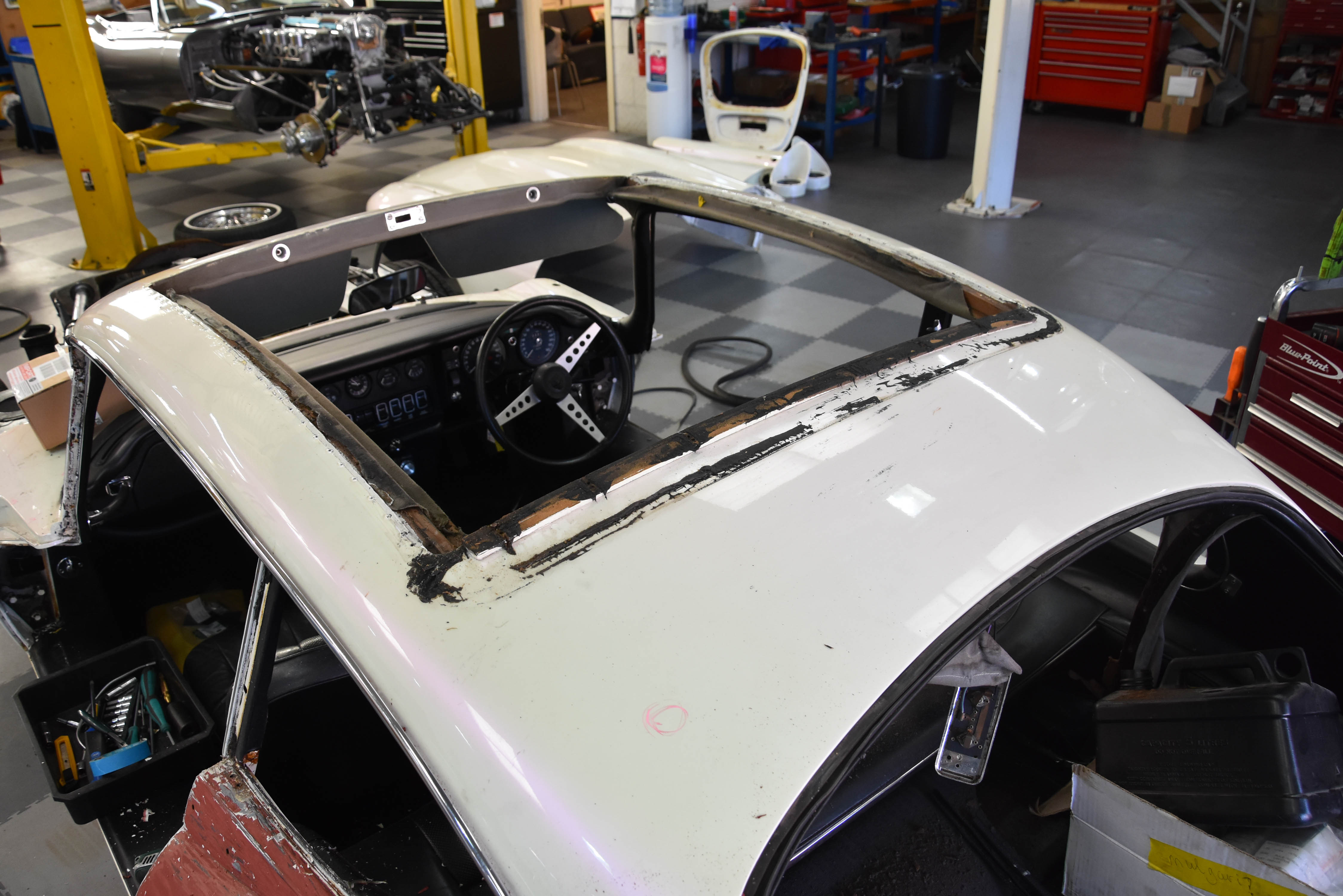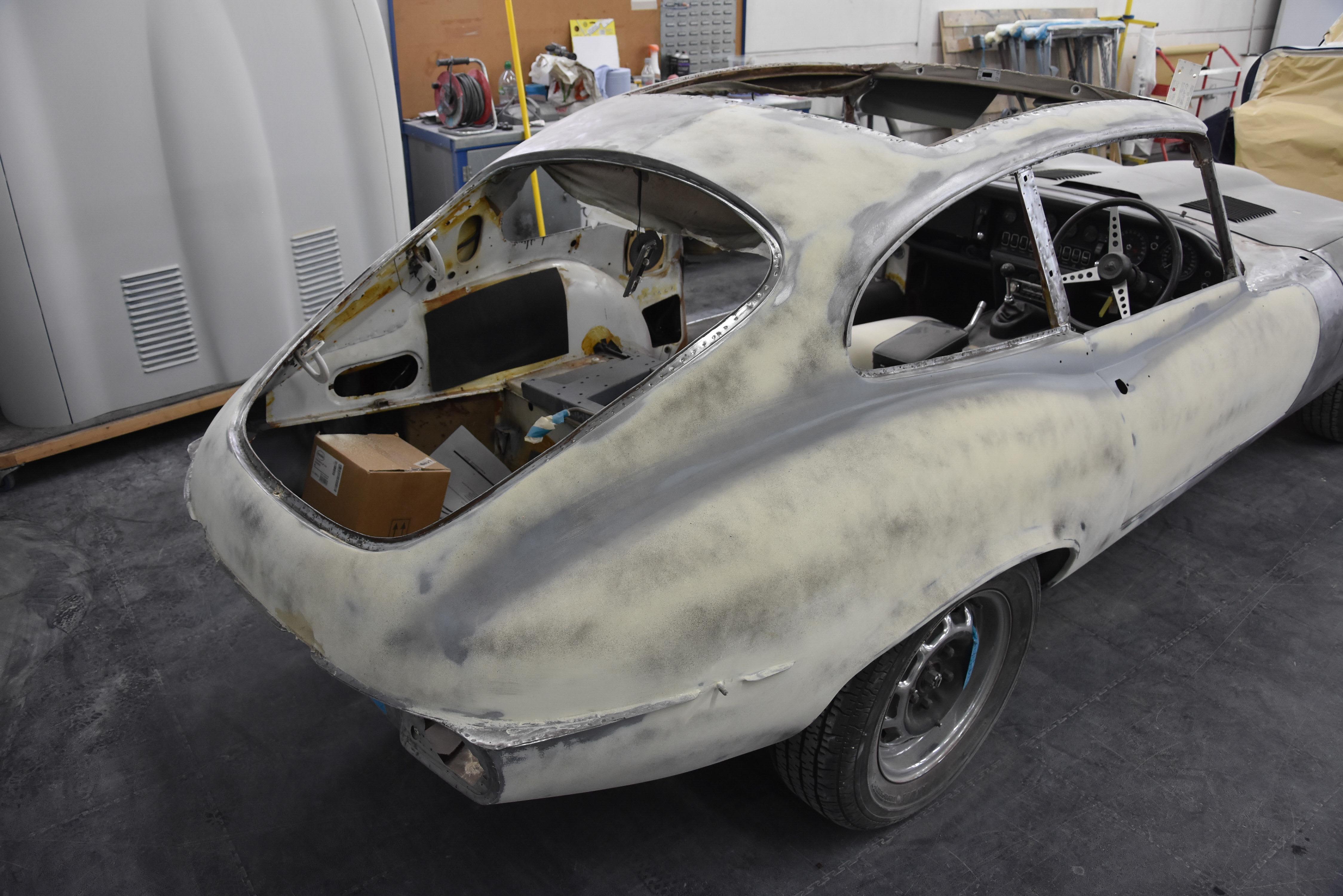 With media blasting not required for this particular project, the Series 3 2+2 headed straight into the Bodyshop after having all necessary interior/exterior components removed, leaving a running shell. The team began the lengthy process of removing the existing Old English White and other underlining material from the shell, finally exposing the metalwork.