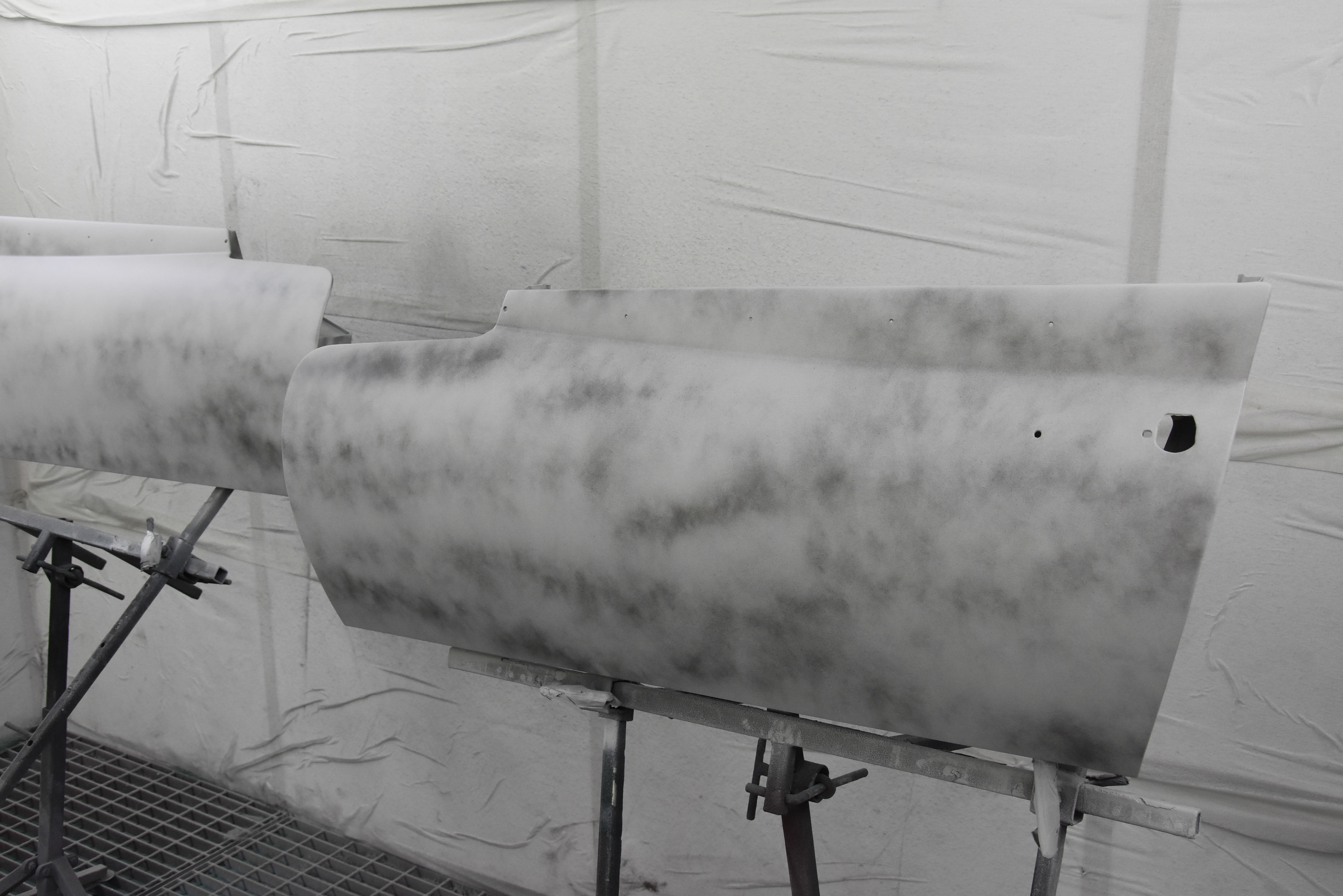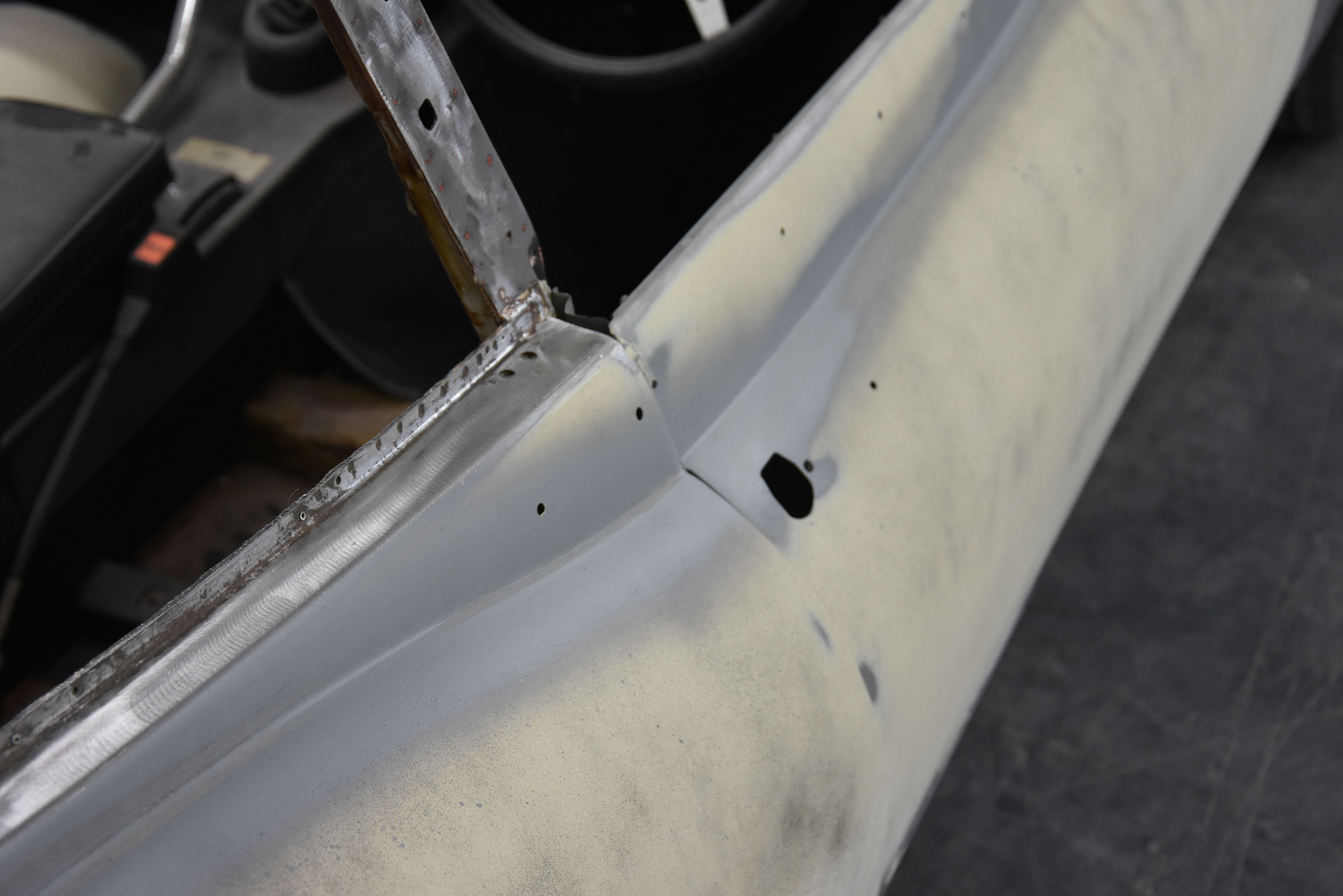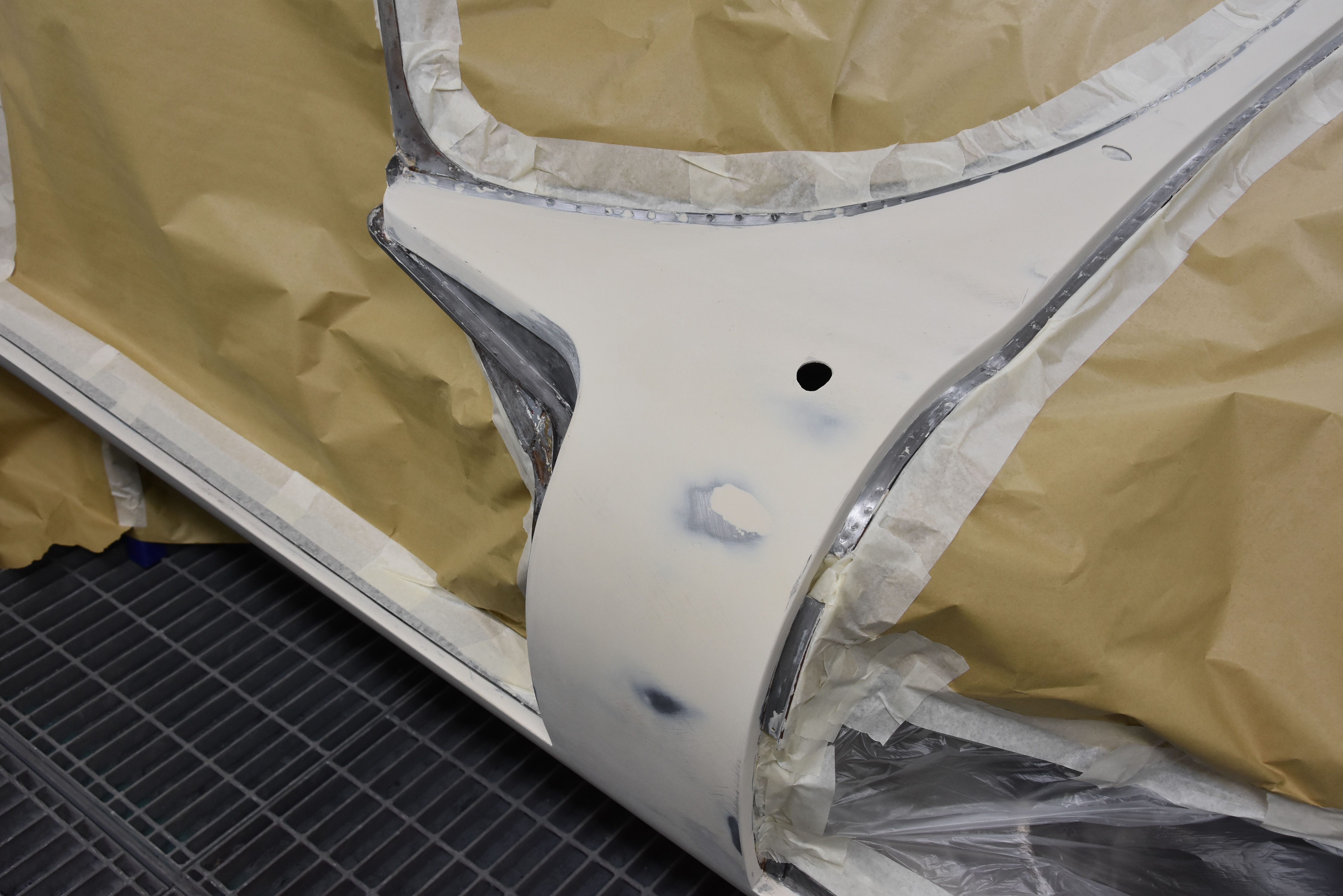 With media blasting not required for this particular project, the Series 3 2+2 headed straight into the Bodyshop after having all necessary interior/exterior components removed, leaving a running shell. The team began the lengthy process of removing the existing Old English White and other underlining material from the shell, finally exposing the metalwork.