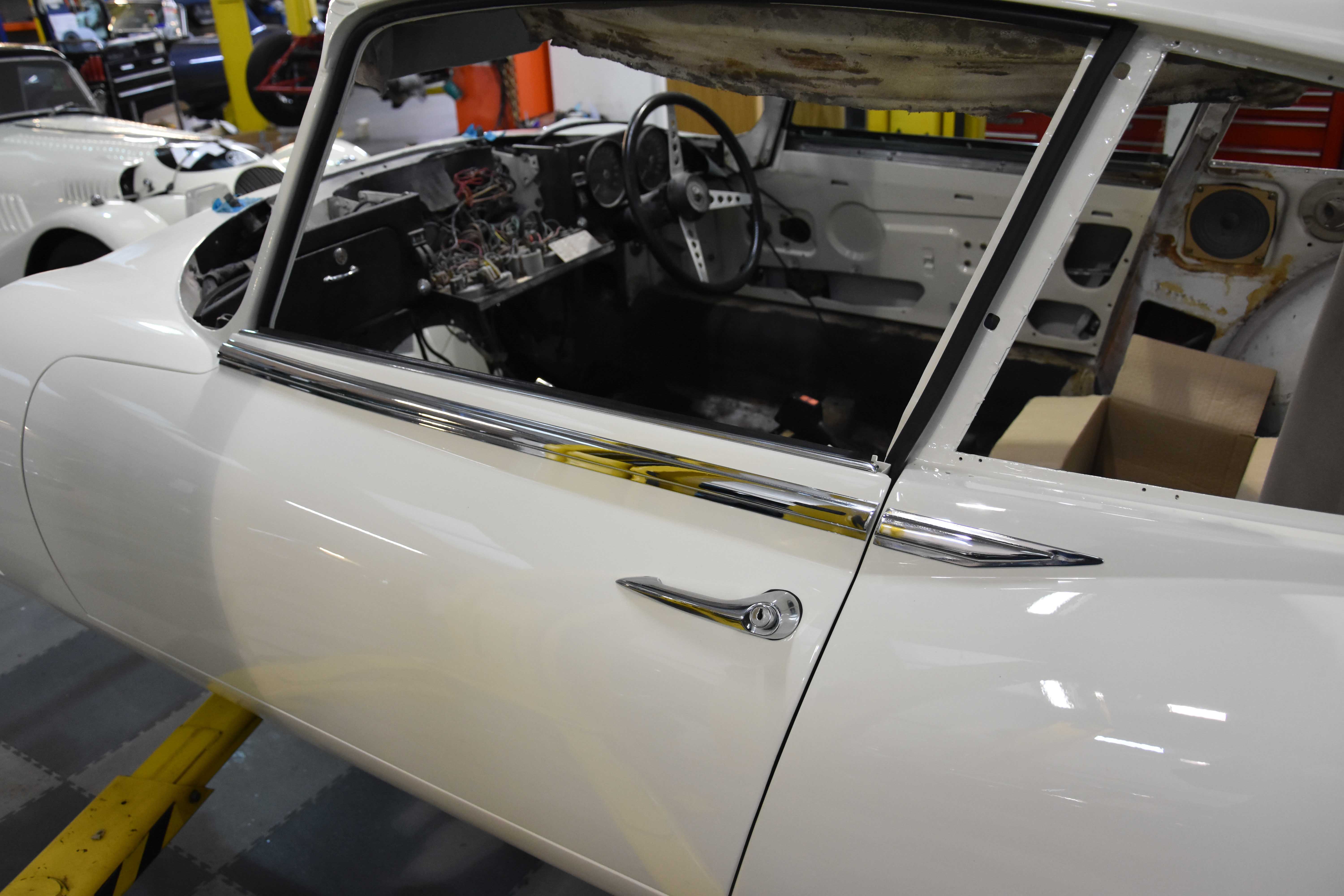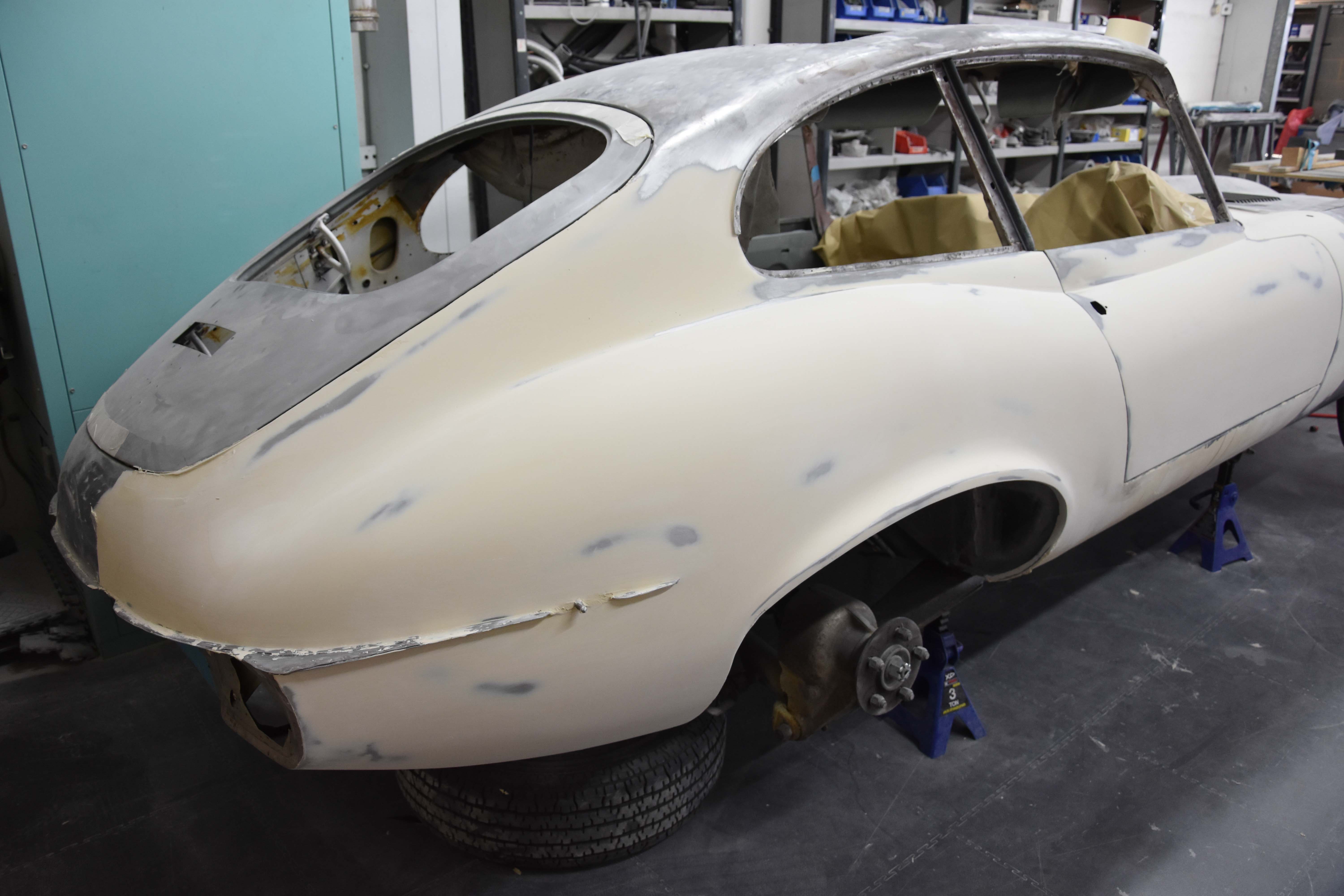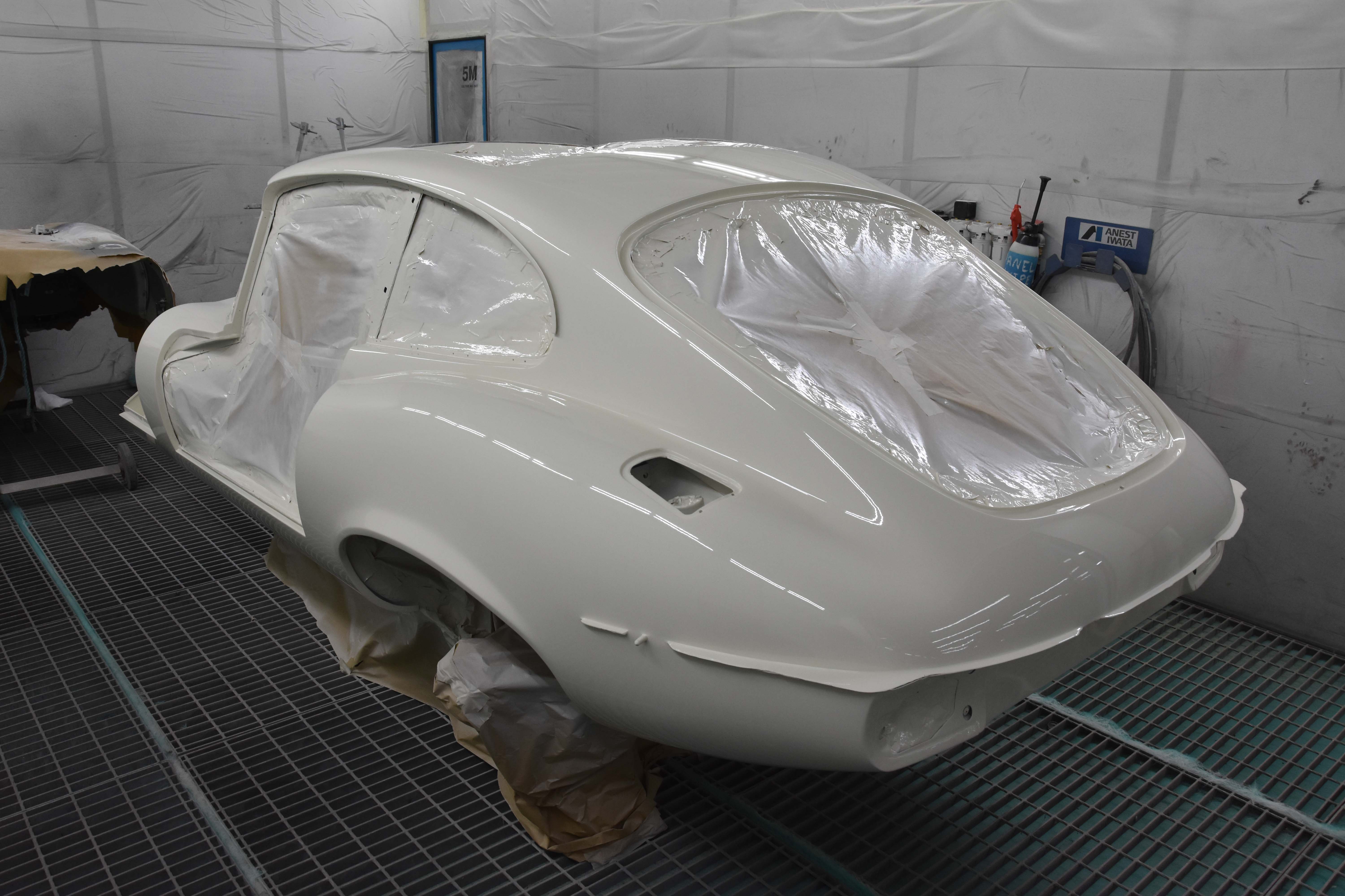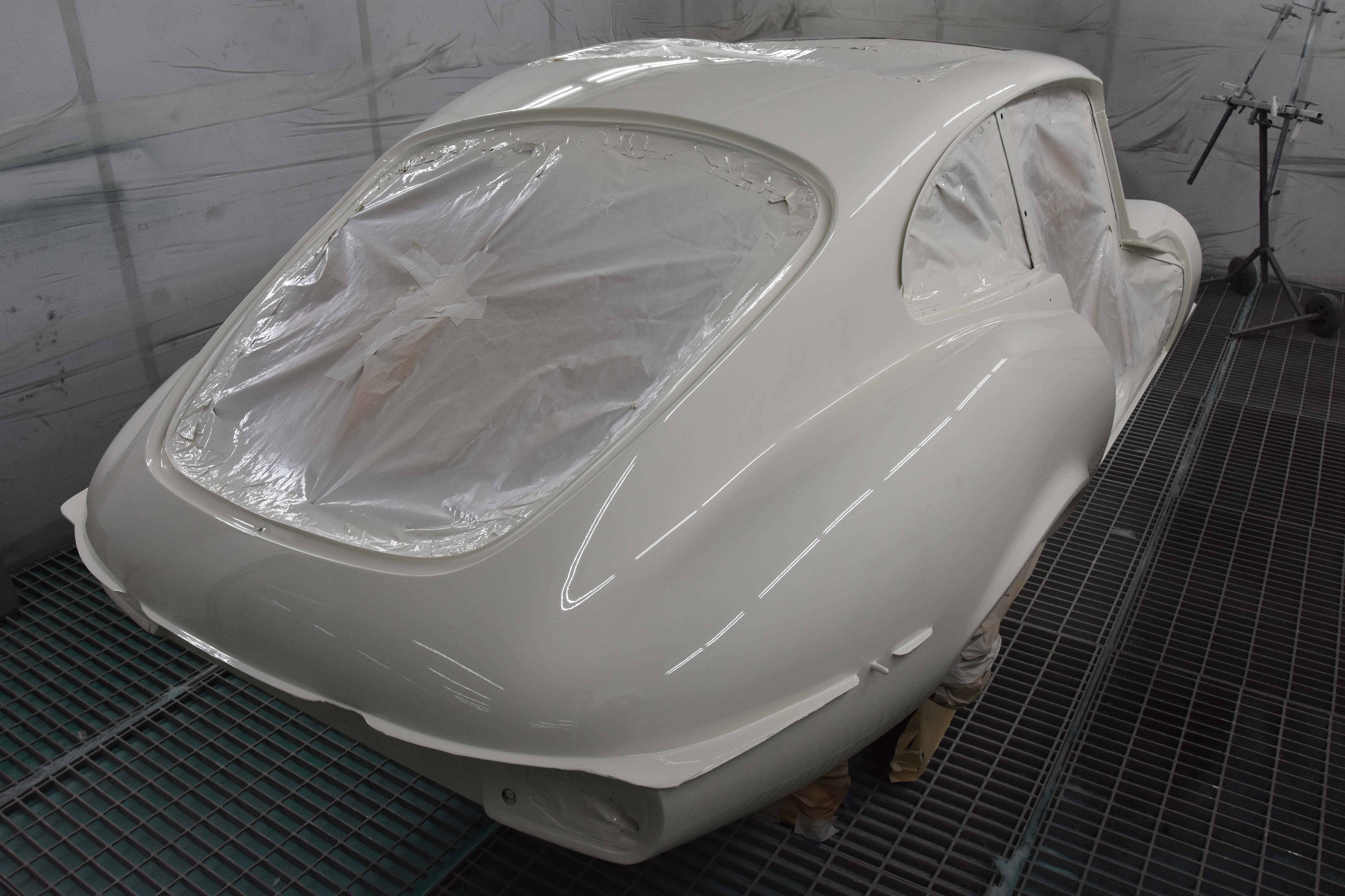 Each E-Type UK restoration project is subjected to a high level of bodywork, ensuring each example is presented with the finest bodylines and gaps. With these crucial elements restored, the shell and panels enter through several cycle of primer, hardening and rub down. This phase creates the ideal surface for that all-important finish to be applied to. Now ready for paint, the E-type is given a round of colour to the cabin and underneath, once done, these areas of masked up and the first solid coat of Jaguar Old English White is applied. Following a further 3 more coats of solid colour and then 2 rounds of high-quality lacquer, the shell is left to bake.