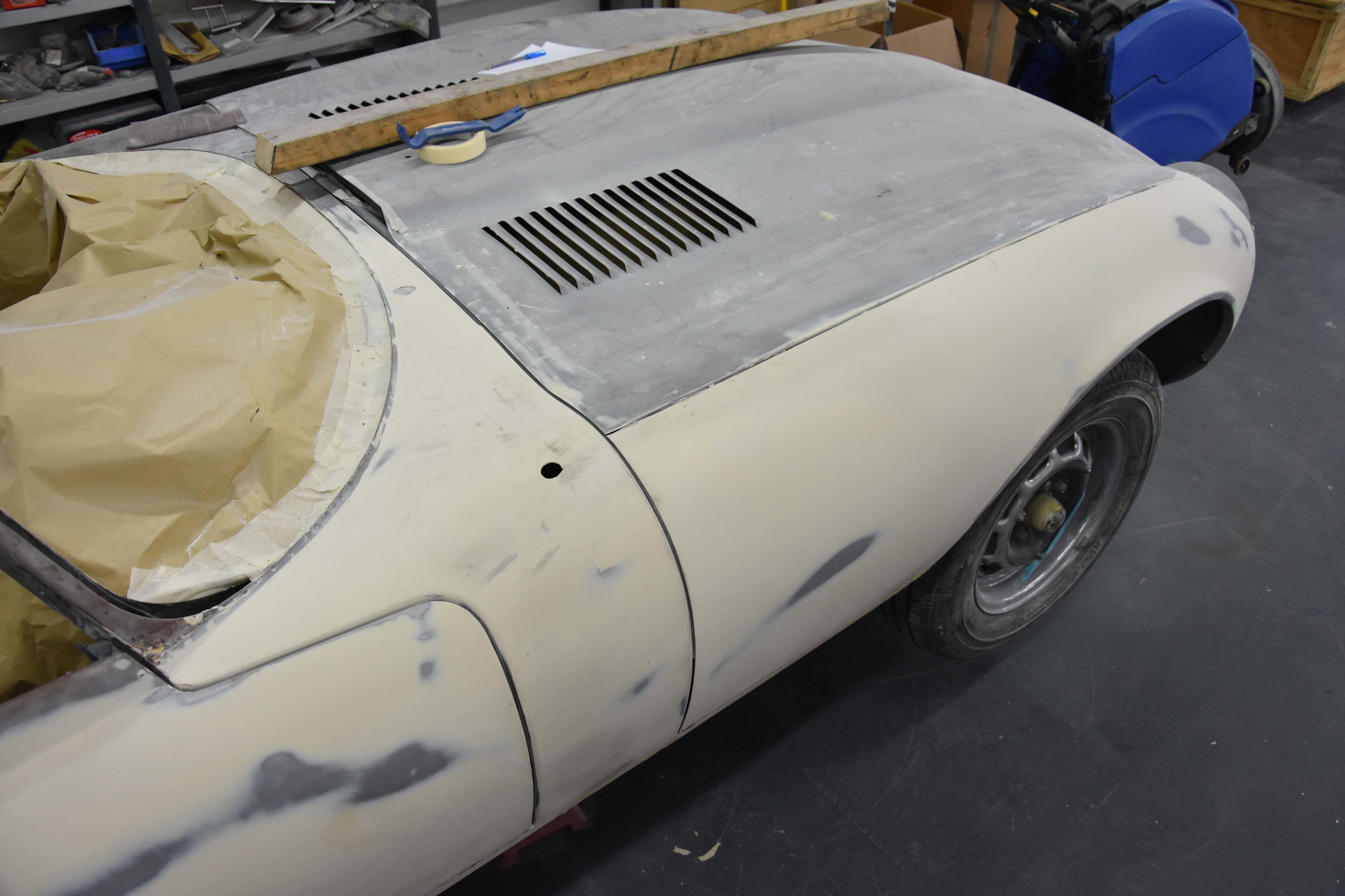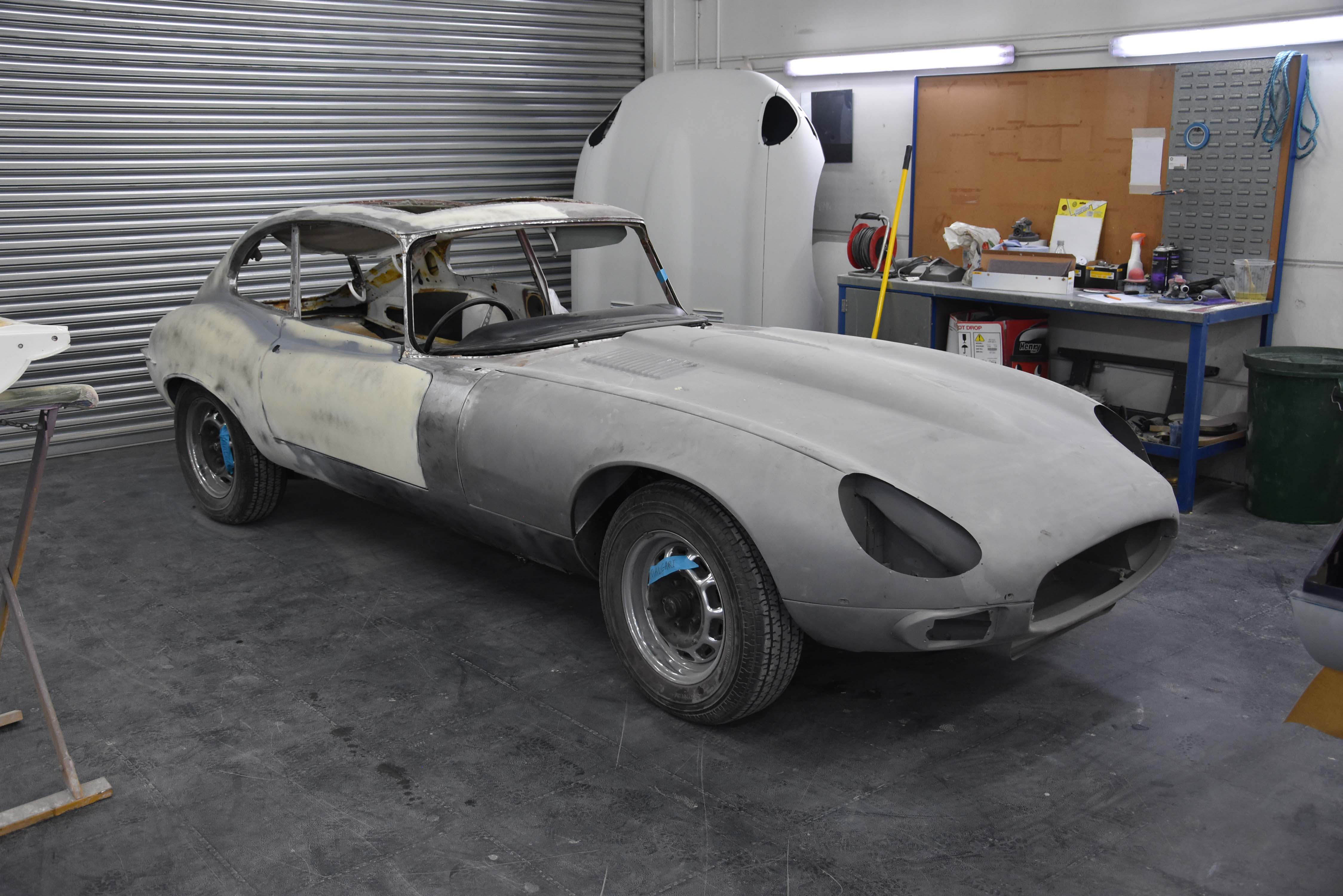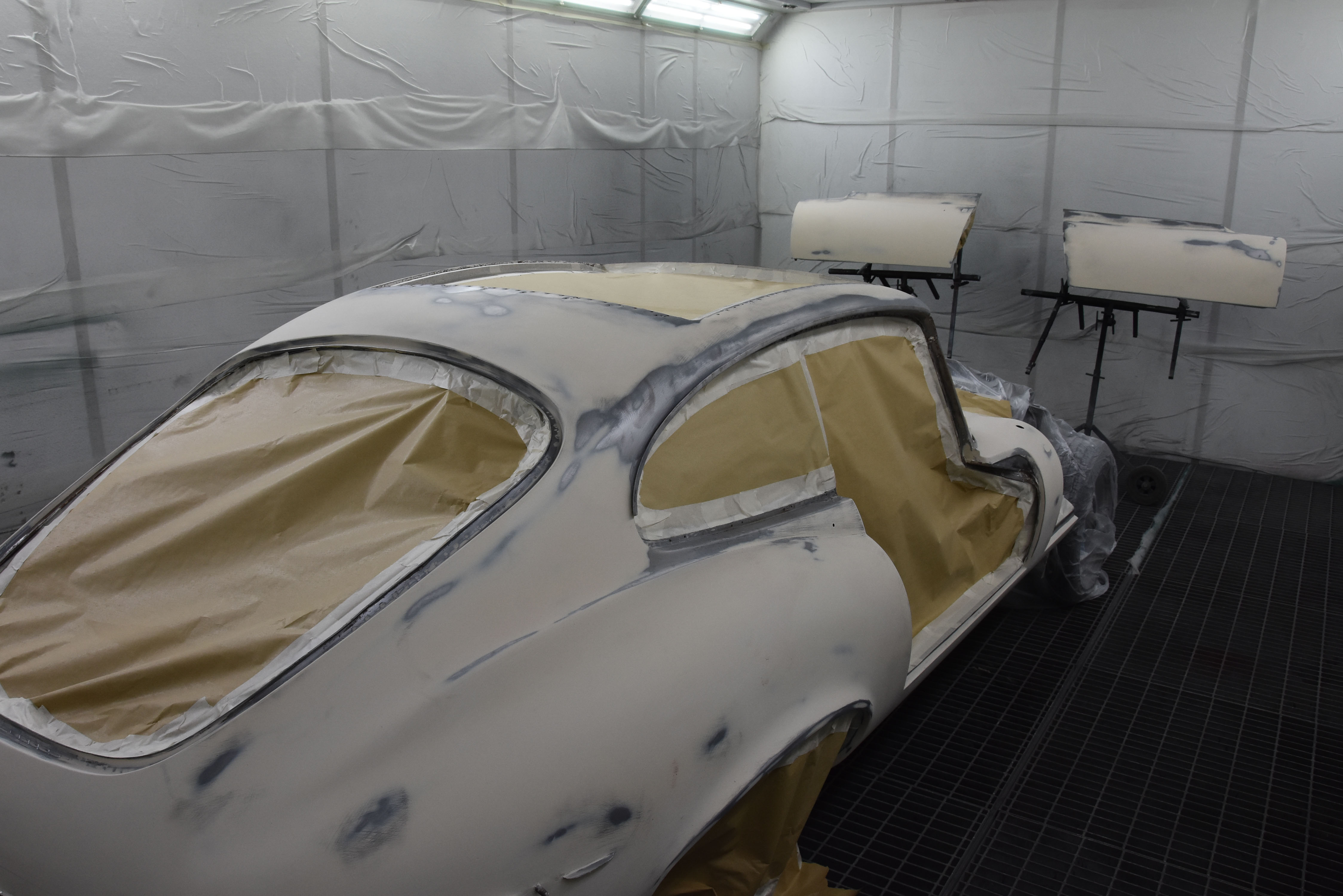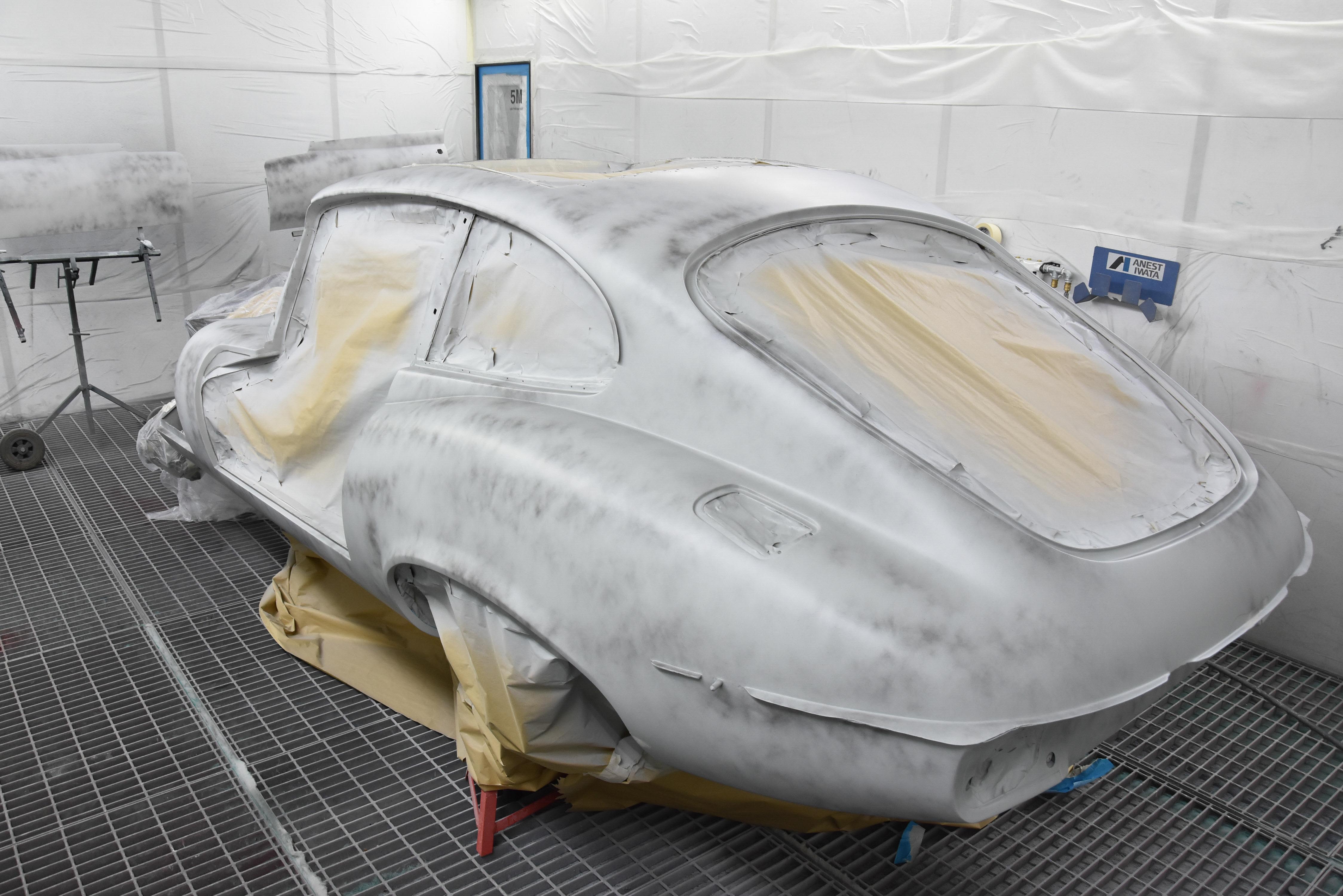 Each E-Type UK restoration project is subjected to a high level of bodywork, ensuring each example is presented with the finest bodylines and gaps. With these crucial elements restored, the shell and panels enter through several cycle of primer, hardening and rub down. This phase creates the ideal surface for that all-important finish to be applied to. Now ready for paint, the E-type is given a round of colour to the cabin and underneath, once done, these areas of masked up and the first solid coat of Jaguar Old English White is applied. Following a further 3 more coats of solid colour and then 2 rounds of high-quality lacquer, the shell is left to bake.