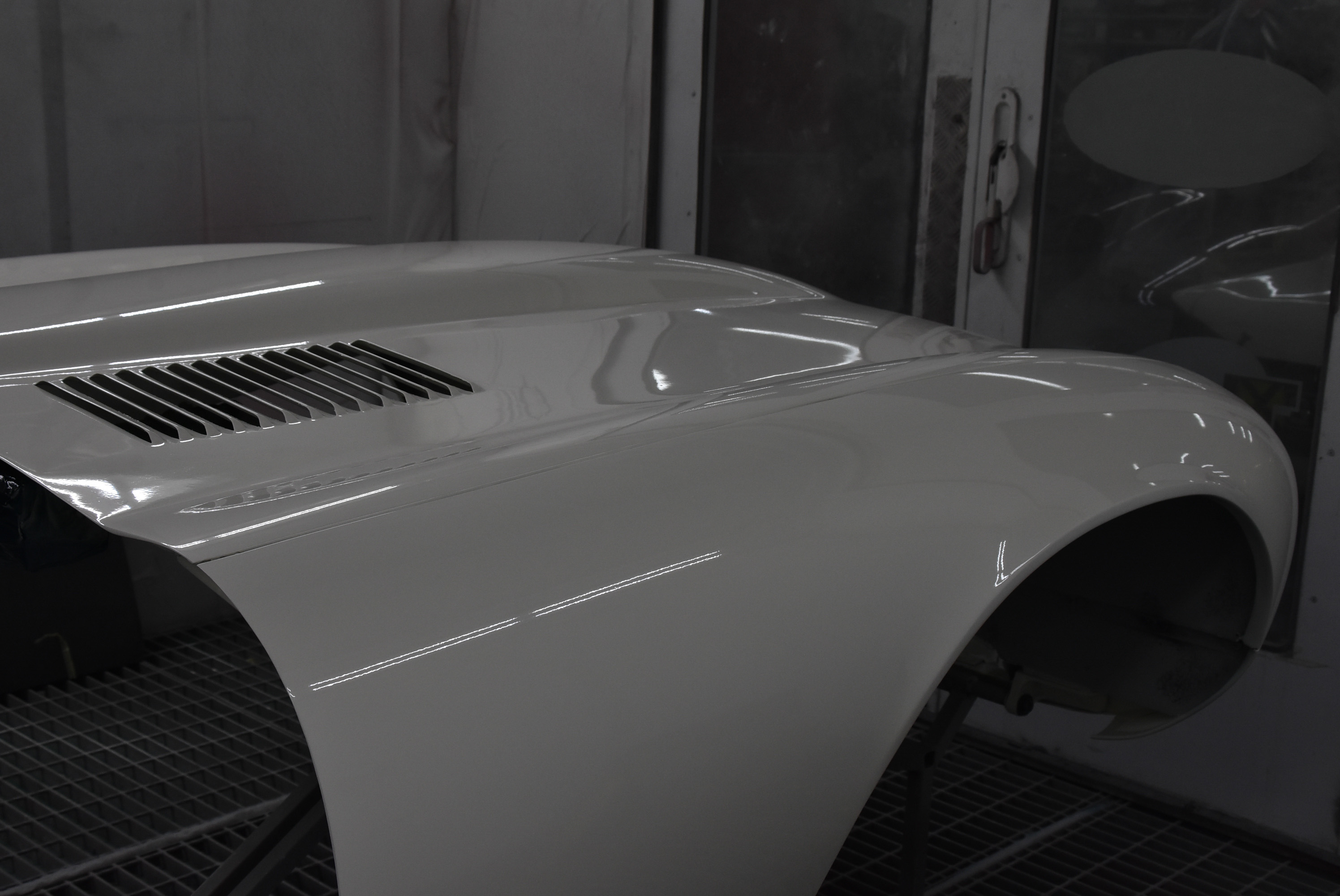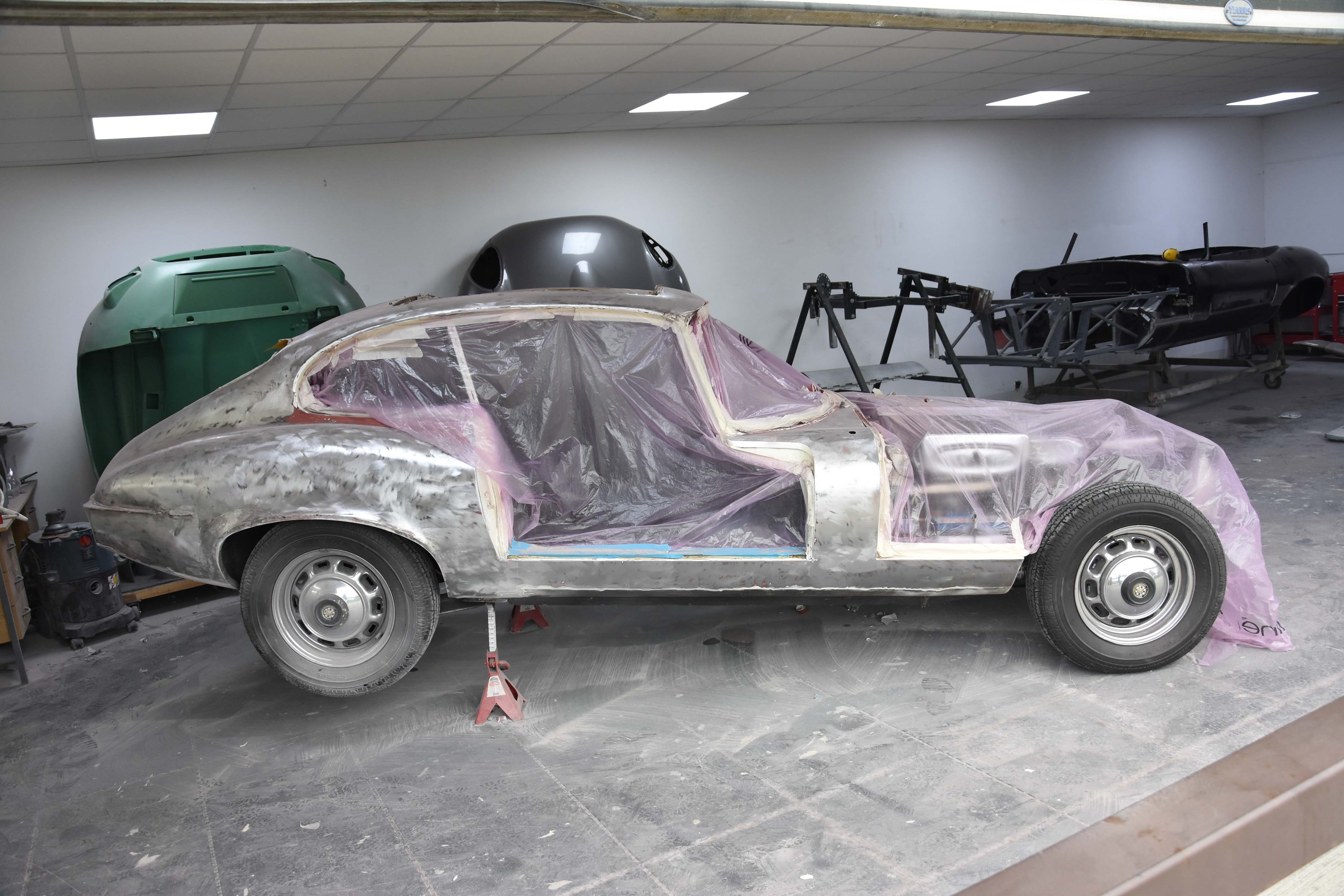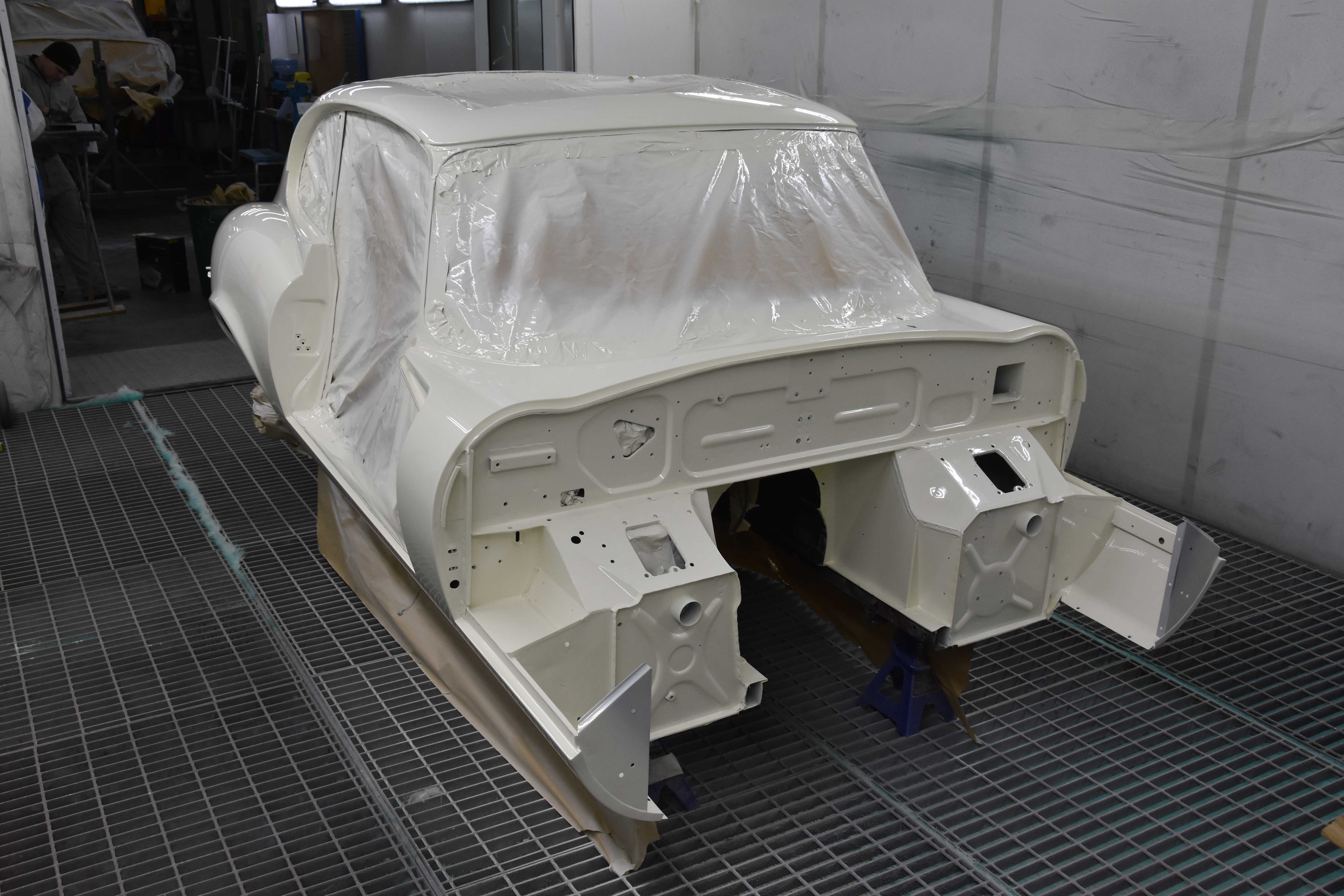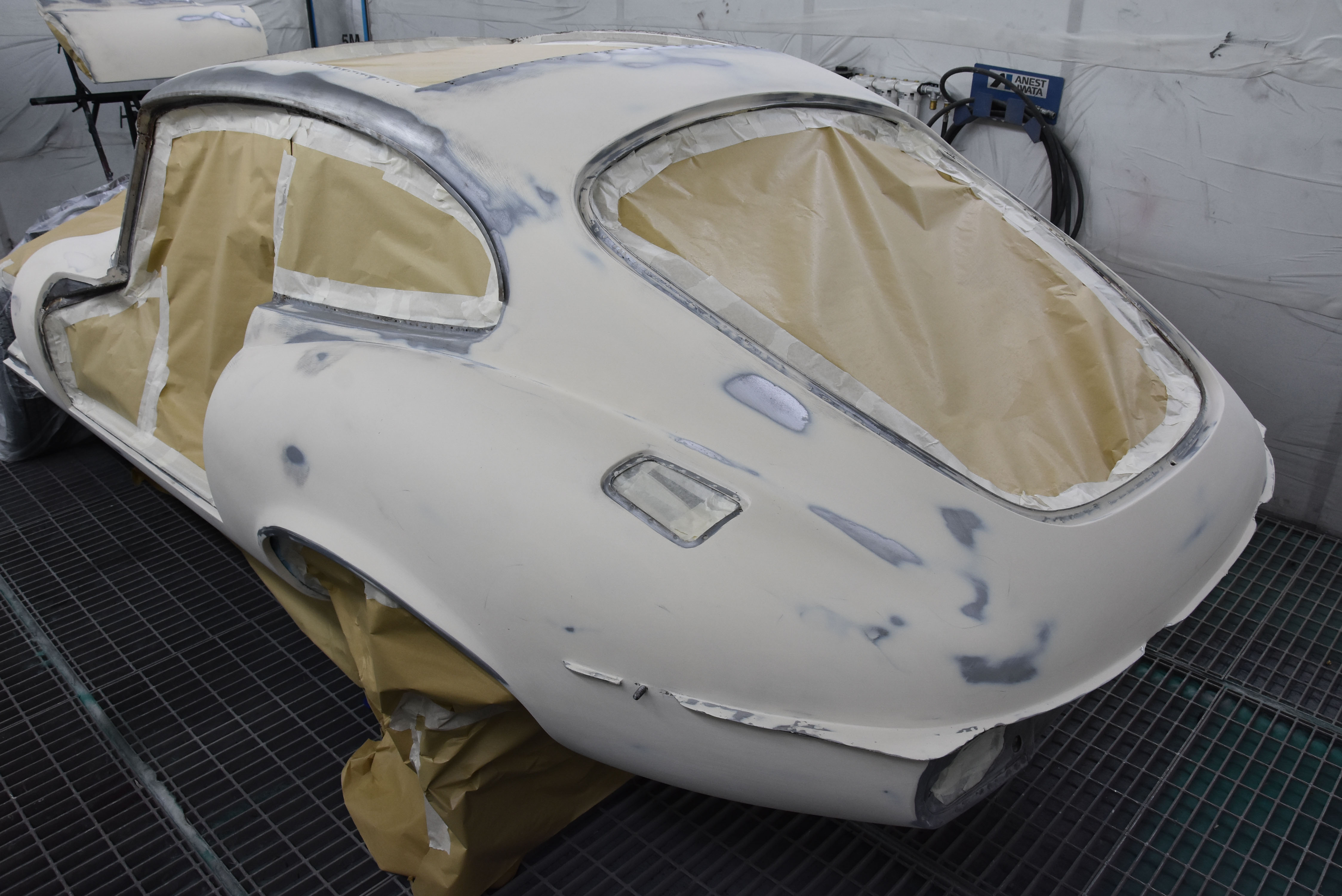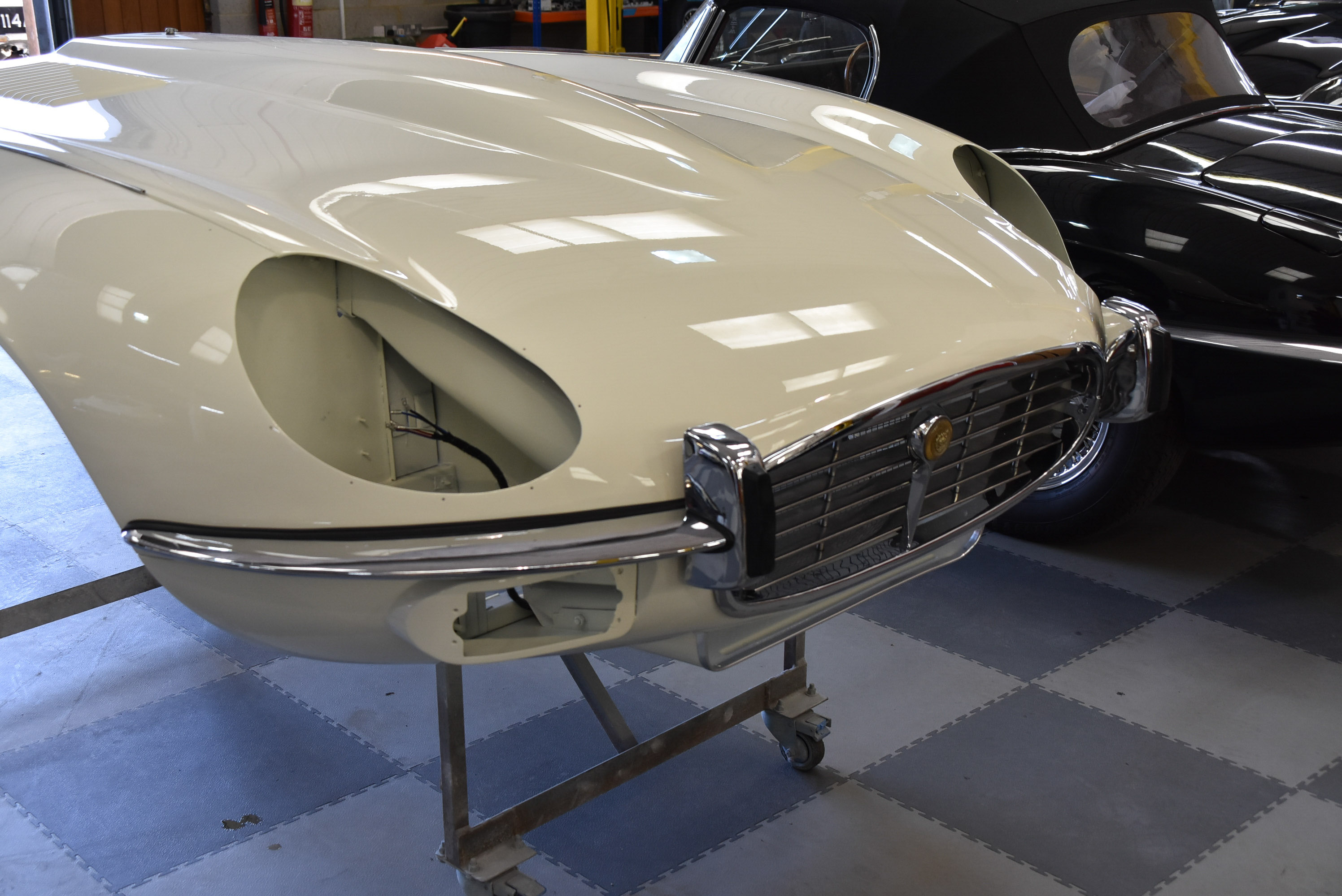 Each E-Type UK restoration project is subjected to a high level of bodywork, ensuring each example is presented with the finest bodylines and gaps. With these crucial elements restored, the shell and panels enter through several cycle of primer, hardening and rub down. This phase creates the ideal surface for that all-important finish to be applied to. Now ready for paint, the E-type is given a round of colour to the cabin and underneath, once done, these areas of masked up and the first solid coat of Jaguar Old English White is applied. Following a further 3 more coats of solid colour and then 2 rounds of high-quality lacquer, the shell is left to bake.