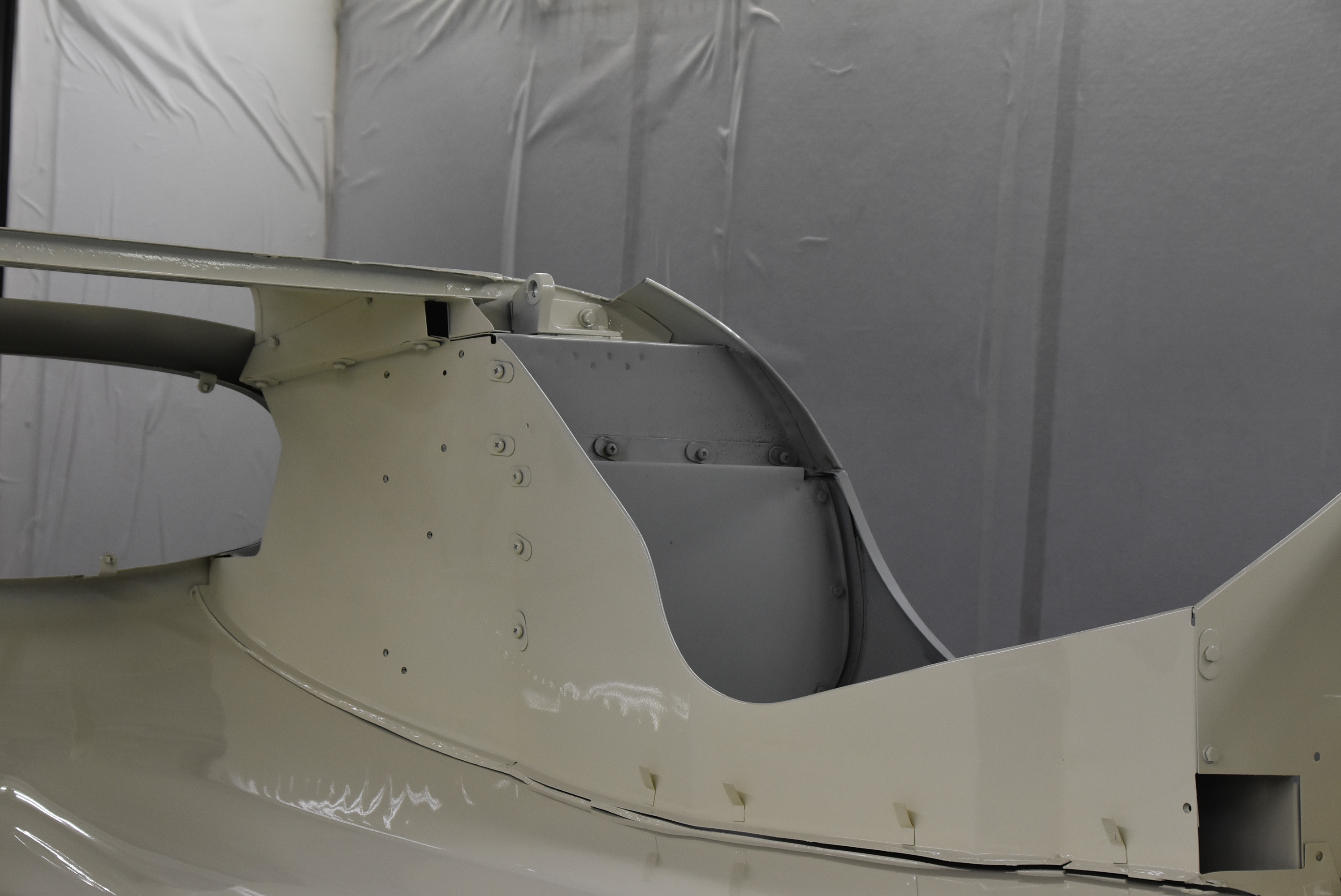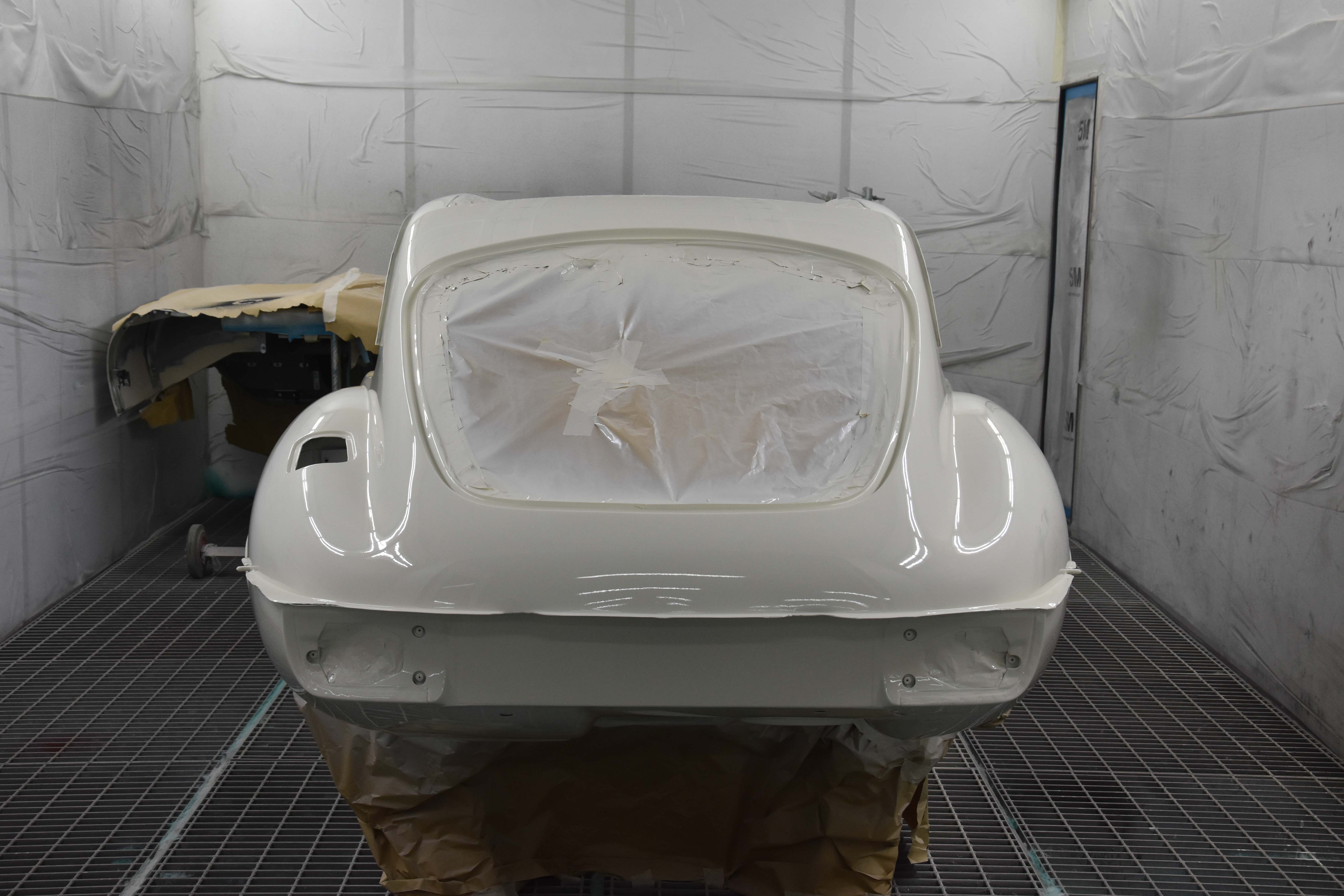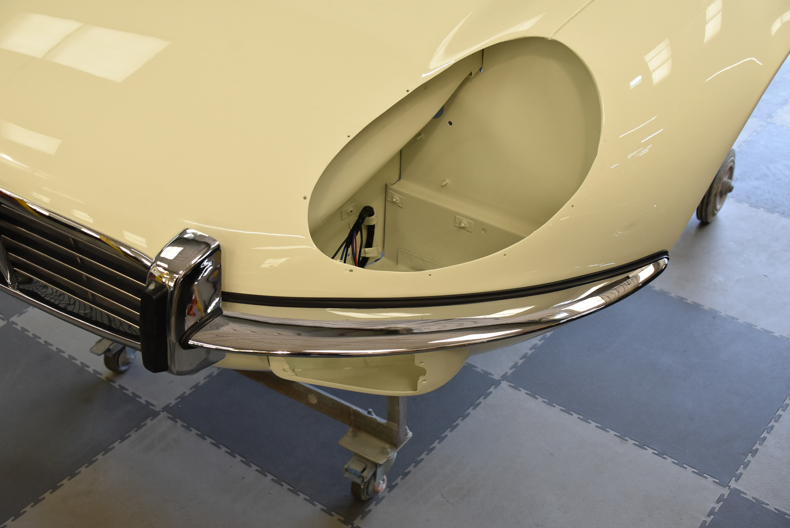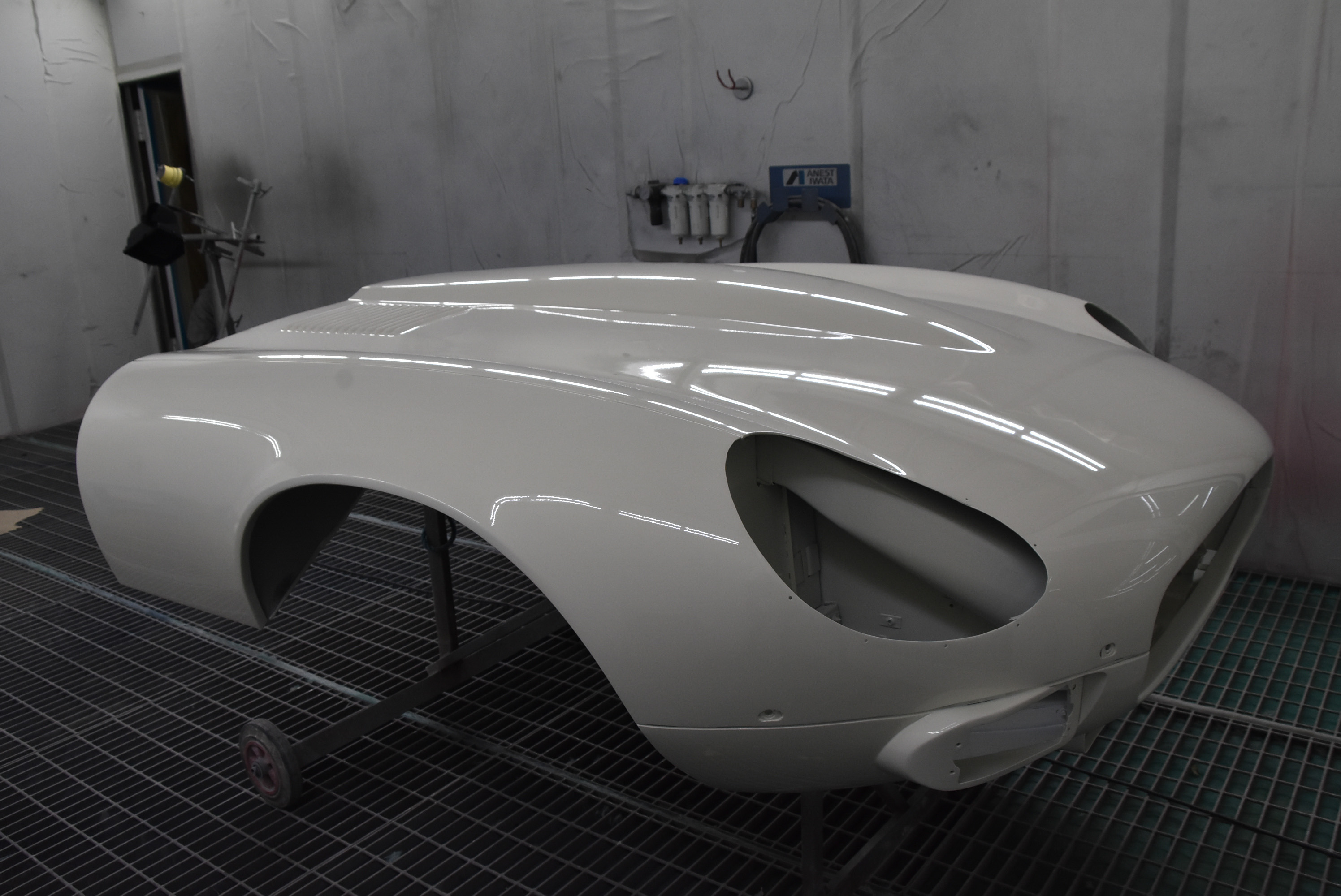 Each E-Type UK restoration project is subjected to a high level of bodywork, ensuring each example is presented with the finest bodylines and gaps. With these crucial elements restored, the shell and panels enter through several cycle of primer, hardening and rub down. This phase creates the ideal surface for that all-important finish to be applied to. Now ready for paint, the E-type is given a round of colour to the cabin and underneath, once done, these areas of masked up and the first solid coat of Jaguar Old English White is applied. Following a further 3 more coats of solid colour and then 2 rounds of high-quality lacquer, the shell is left to bake.
