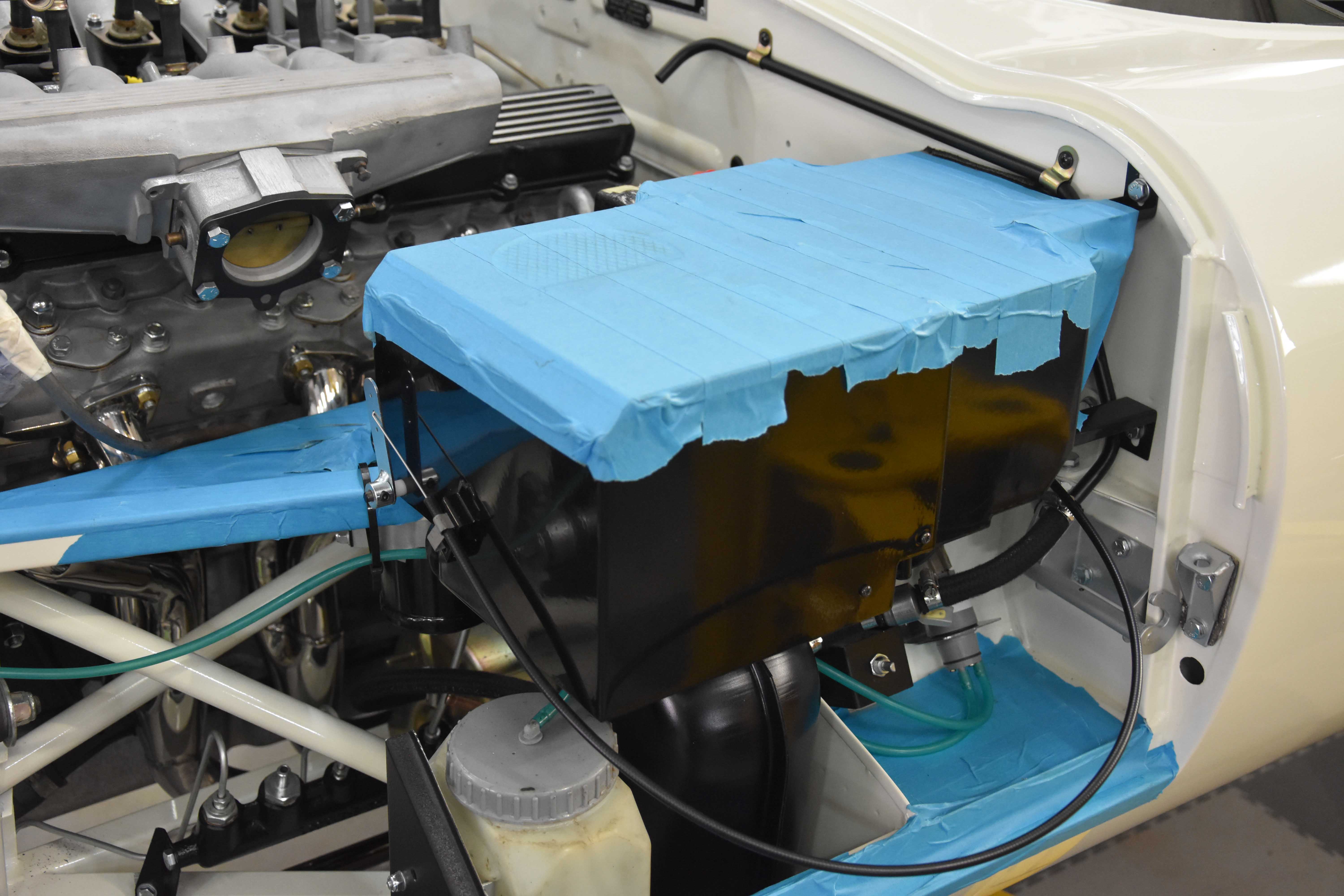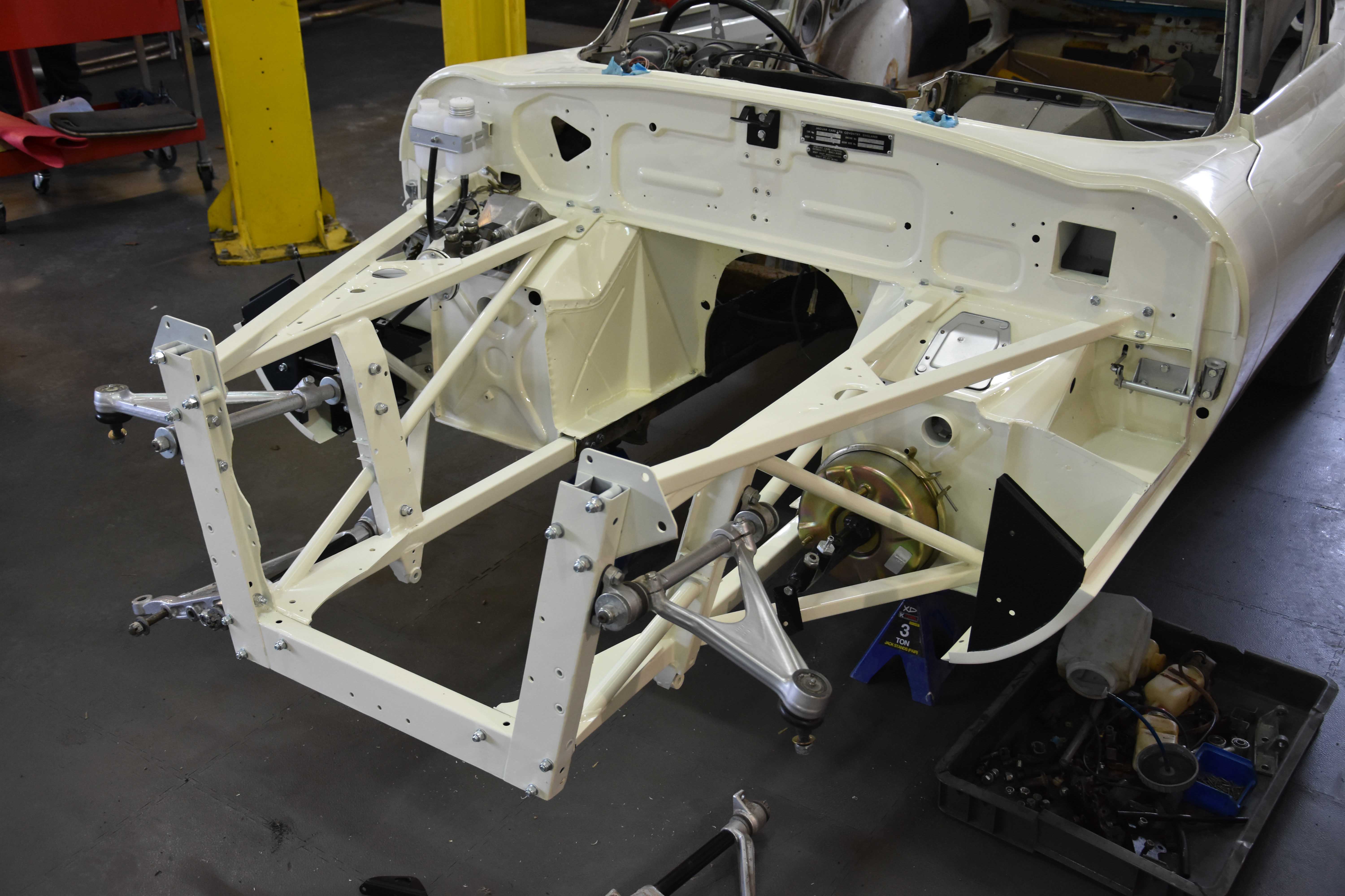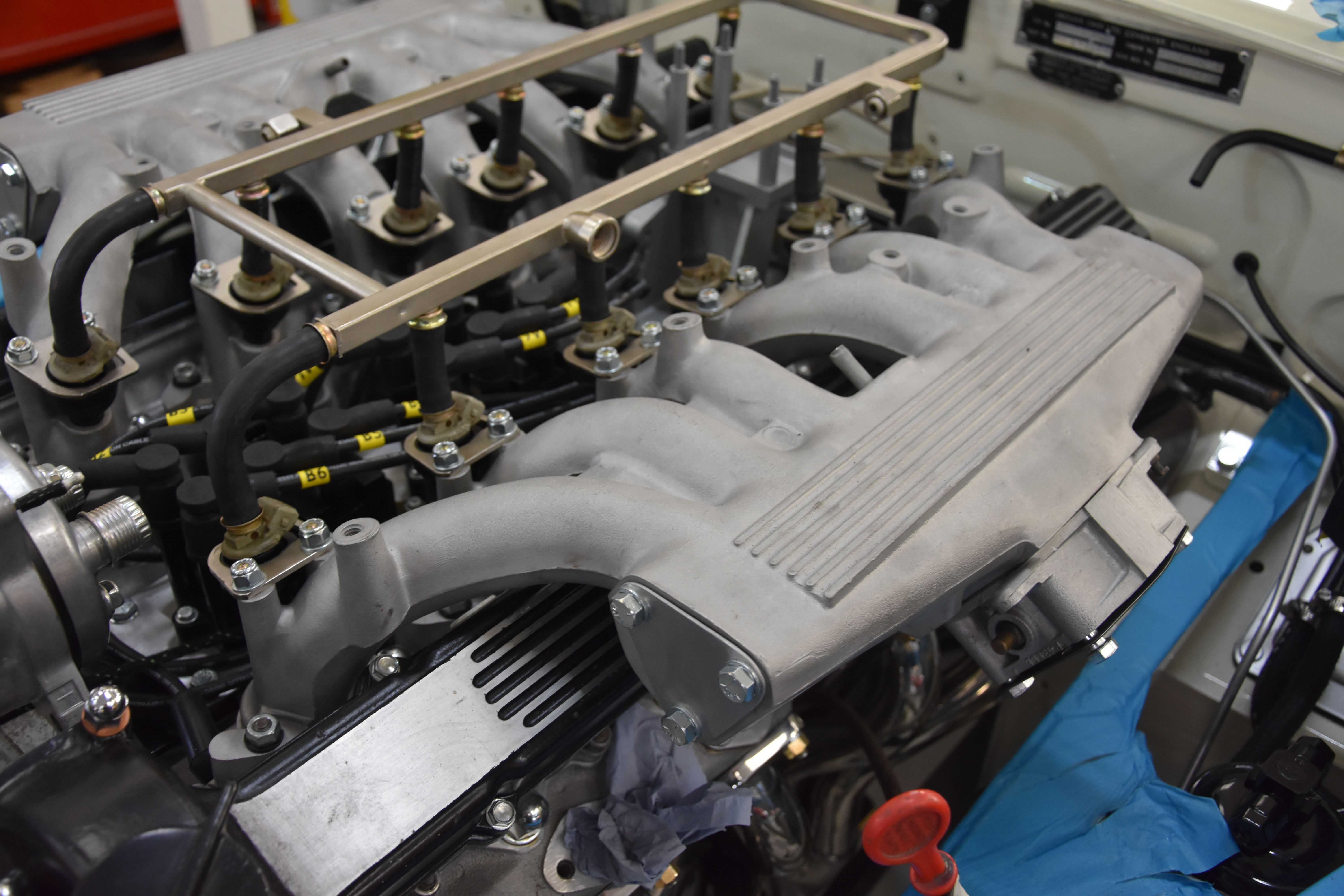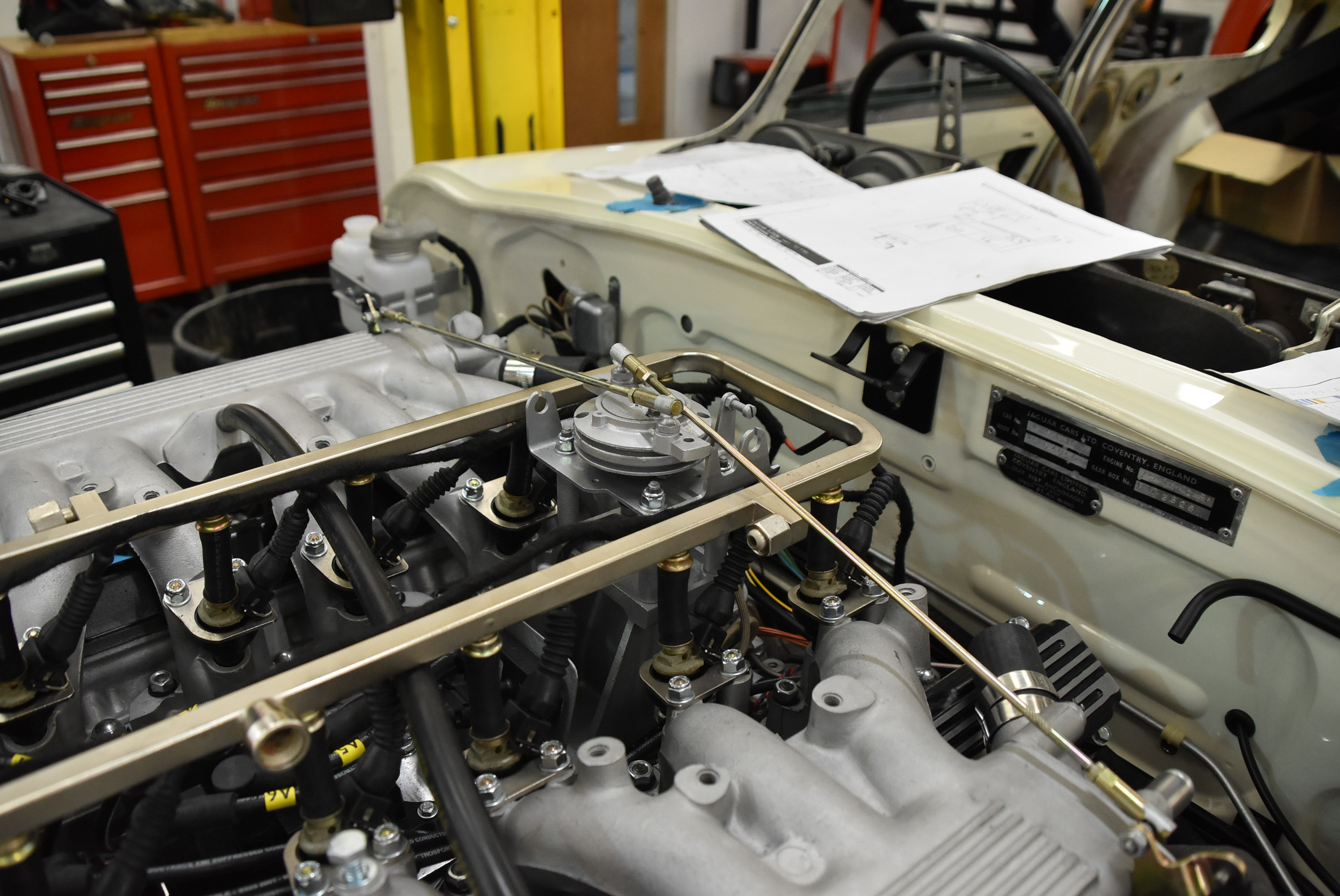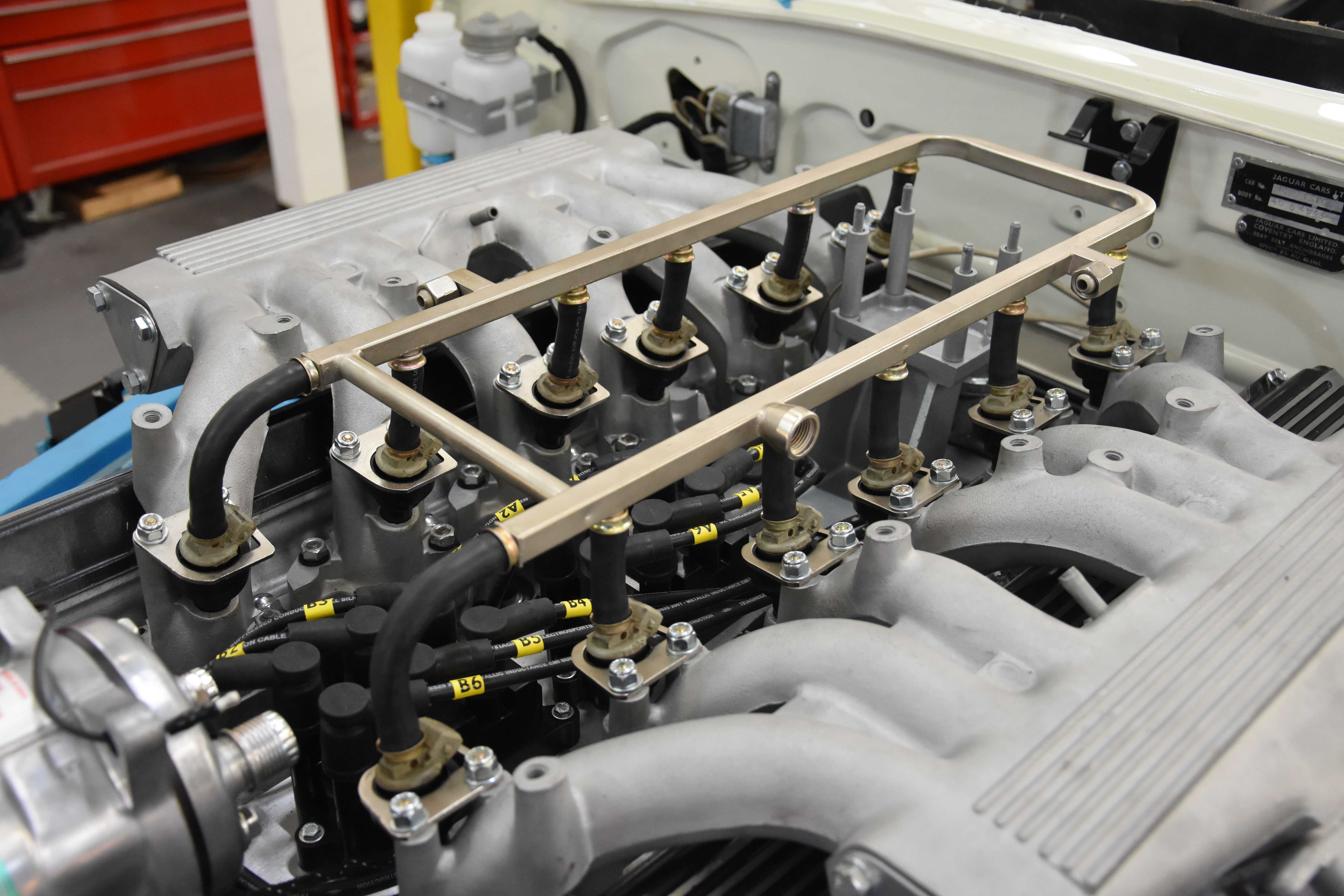 With the rebuild steaming forward, all major engine auxiliaries are installed, alongside the steering and suspension (front and back), now boasting its fully rebuilt and uprated IRS. With these components present the rebuilt 5.3L V12 and uprated transmission is installed, further progressing the build for the installation of electronic fuel injection (EFI). Using a trusted and reliable set-up, alongside a fully bespoke E-Type UK loom, the EFI system is built up, seeing the removal of the period Stromberg carburettors and modified airboxes. Notoriously difficult to tune and suffering from fuel evaporation, the V12 greatly benefits from our EFI system, upgrading and leveraging a modern ECU to relieve these issues. Running off modern coil packs and an ECU programmed for a Jaguar V12 E-type, the system ensures greater reliability and less tuning than the factory original set up while bringing the V12 engine up to the level it was tended to be at.