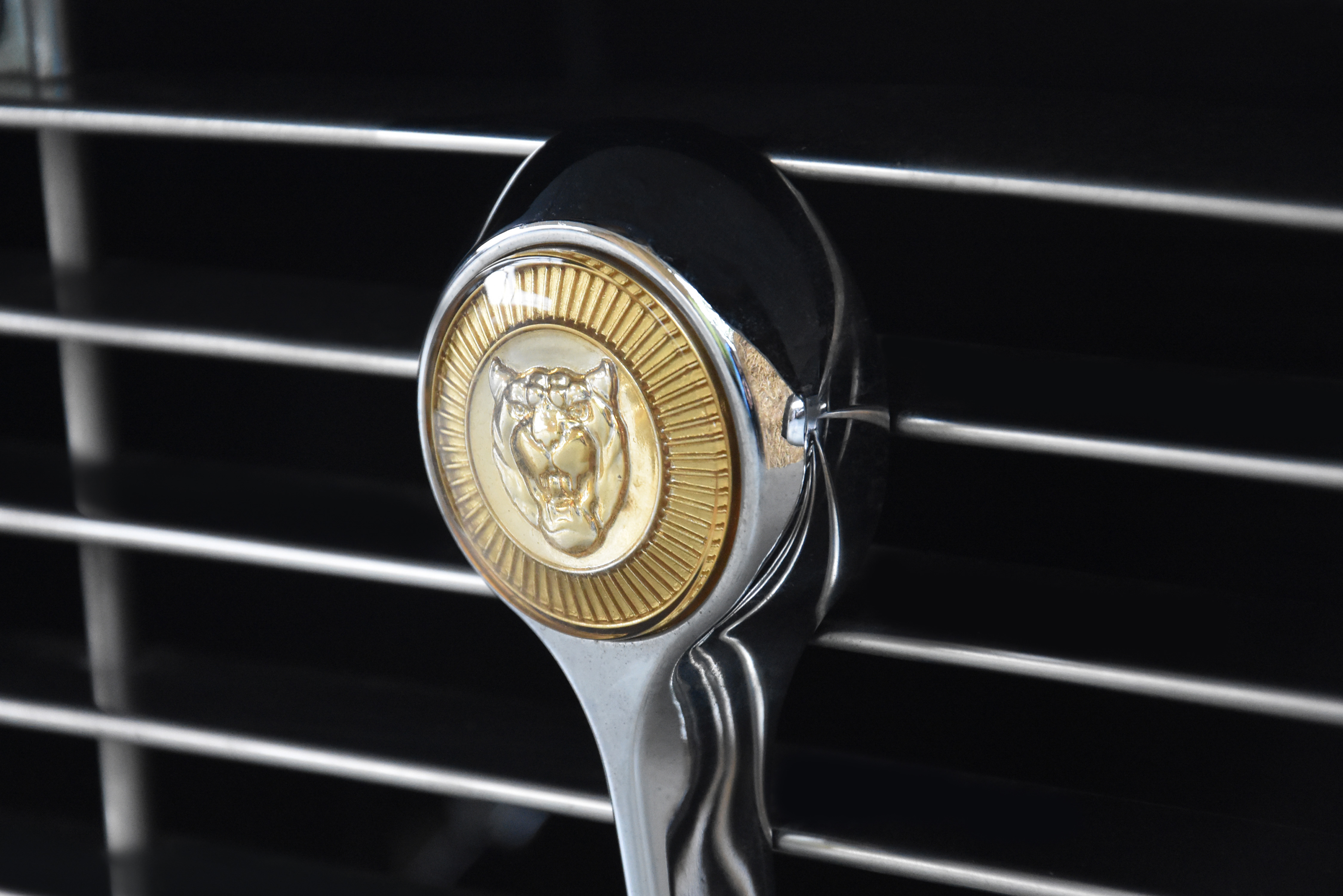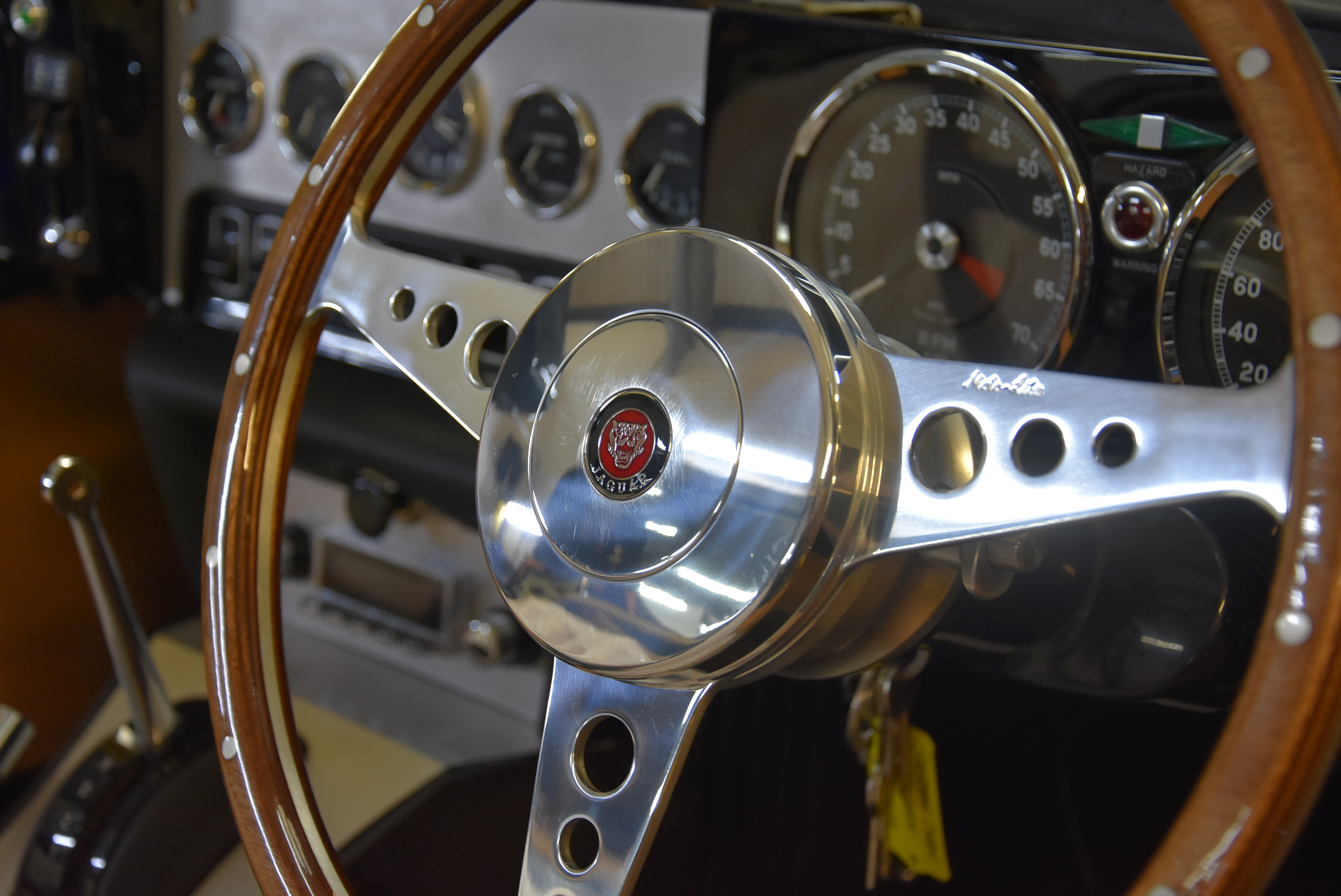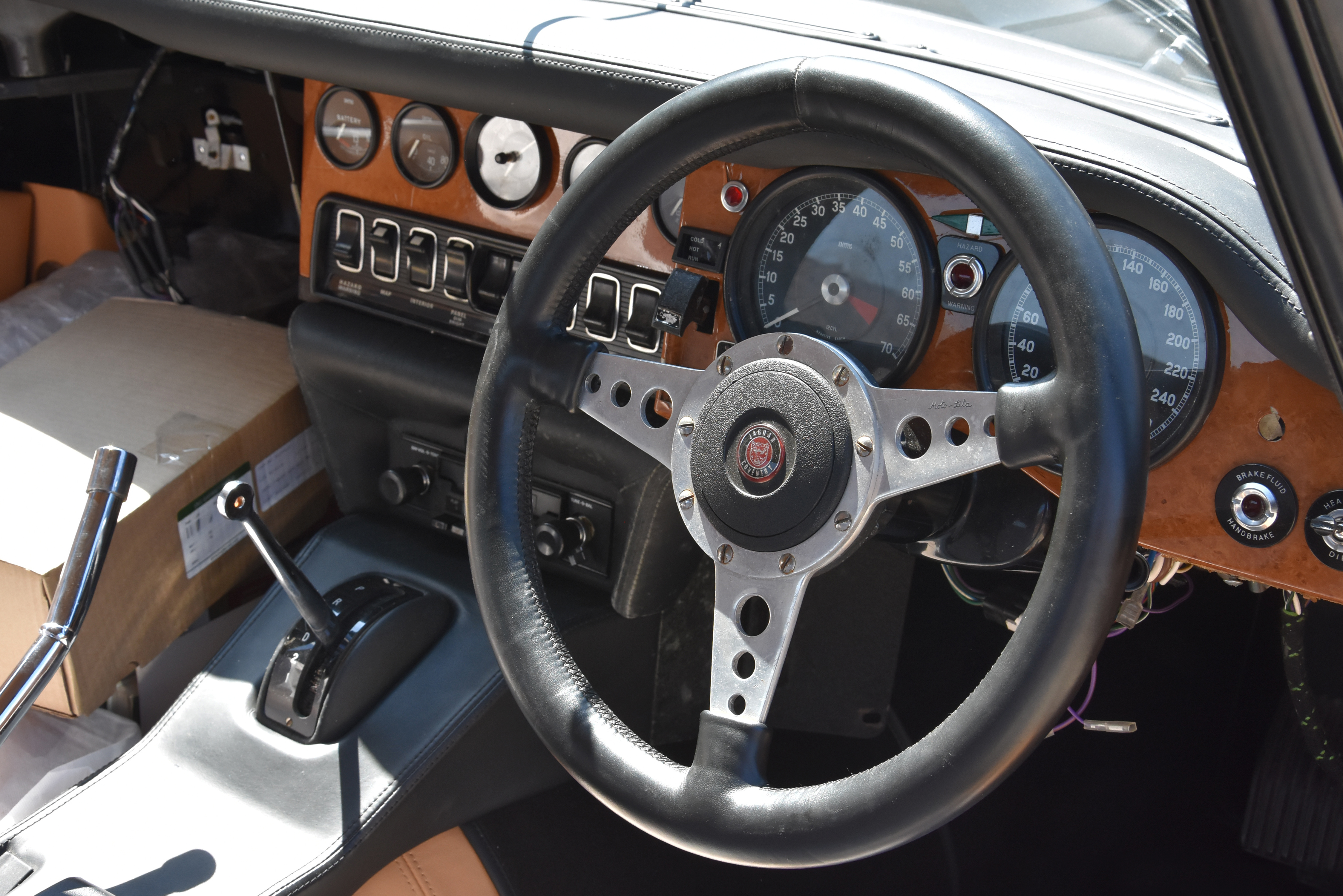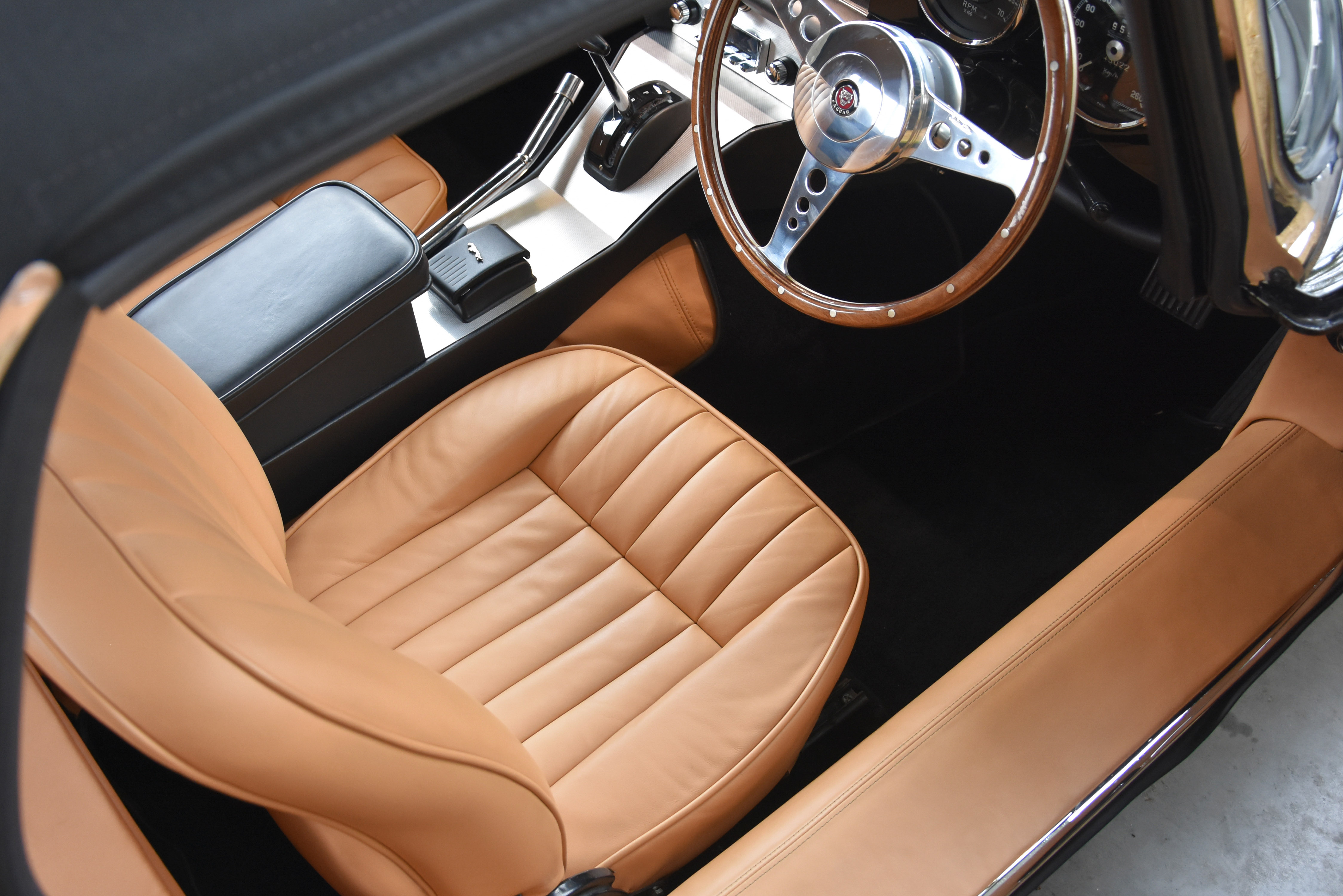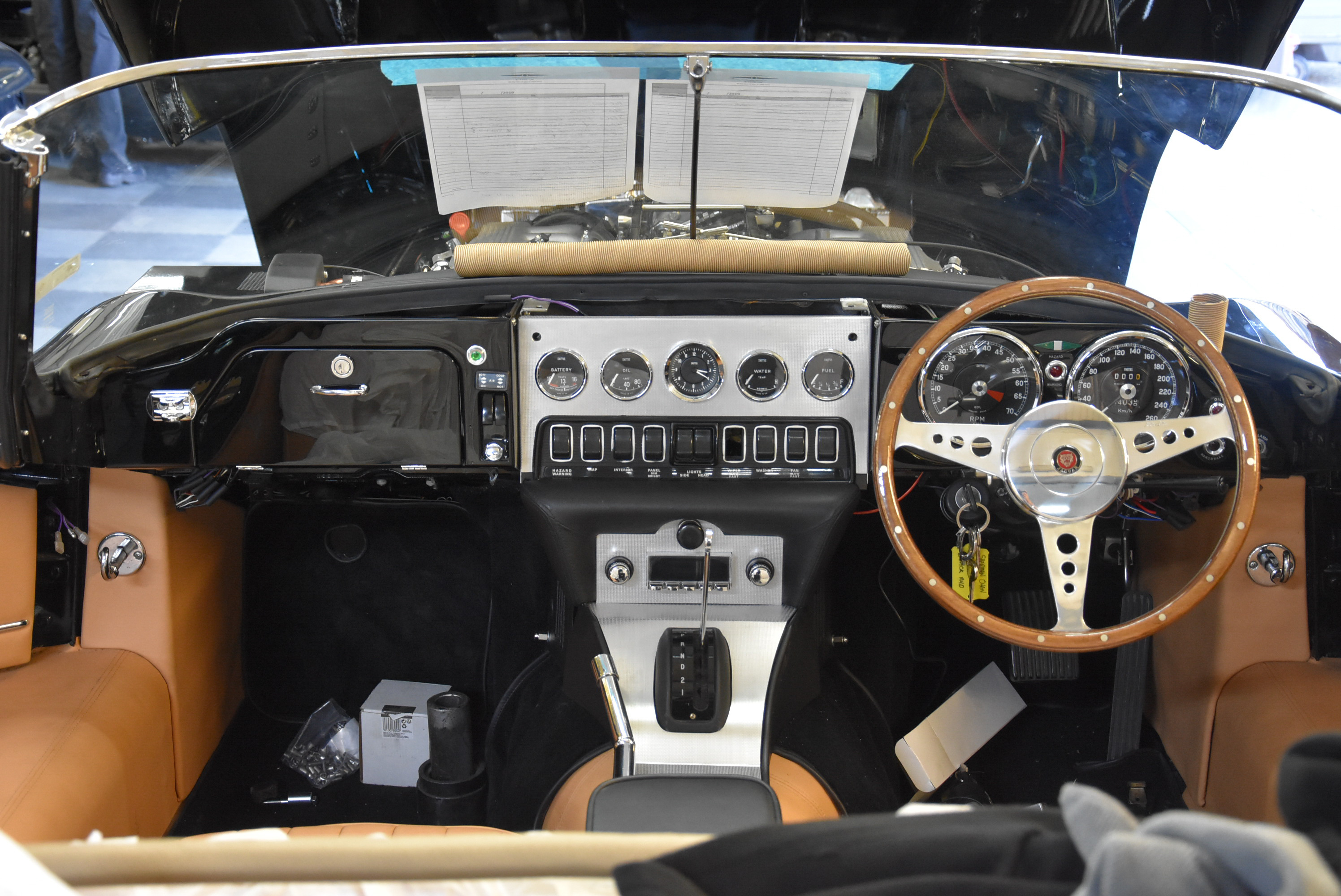 Since the E-type arrived at E-Type UK, retrimmed in full Tan leather, the roadster was treated to further bespoke touches to create a unique cabin appearance. Being a Jaguar lover, the client decided to include a nod to the early original E-type models via the installation of a bespoke built aluminium centre console and dash. The design was paired with painted Piano Black dash fascias with chrome gauge bezels, finally fitting an integrated retrofit radio system with Bluetooth and USB connectivity, quick release sports Moto-Lita steering wheel and all-new retrimmed black soft top.