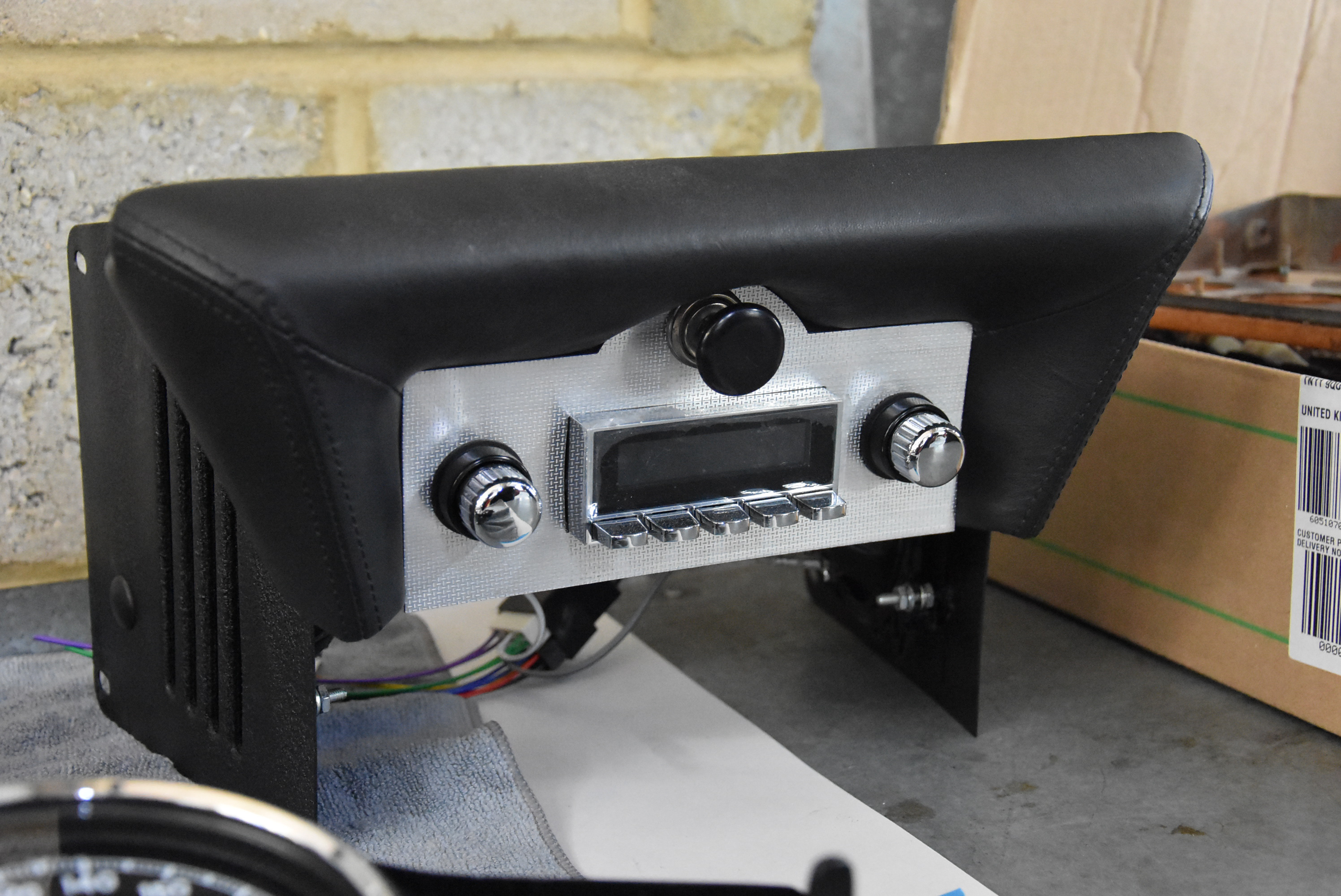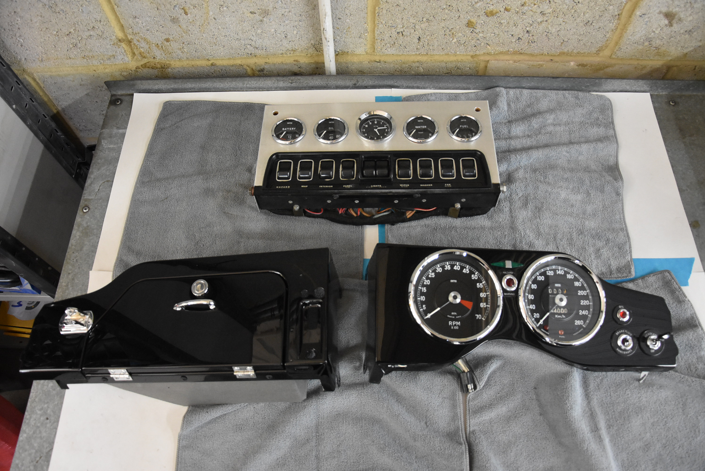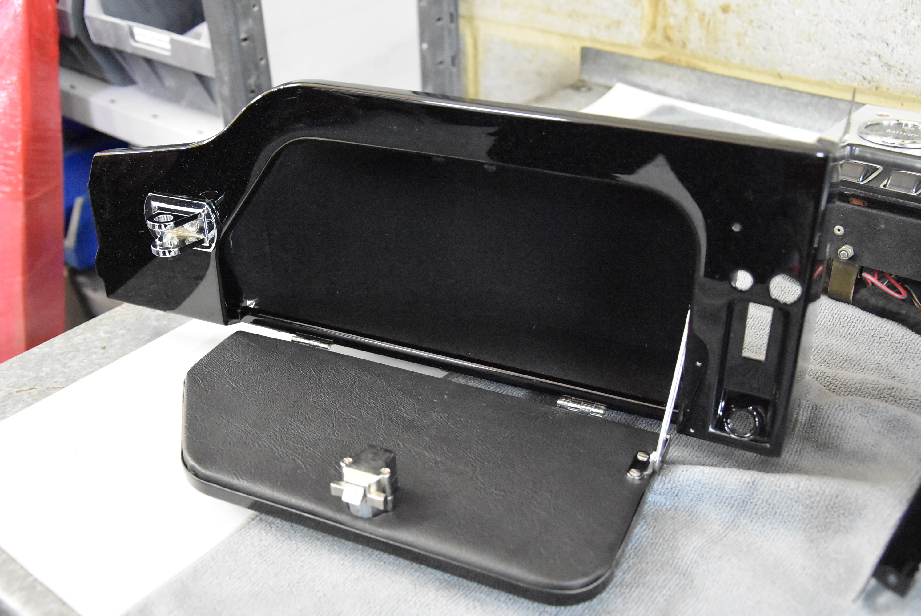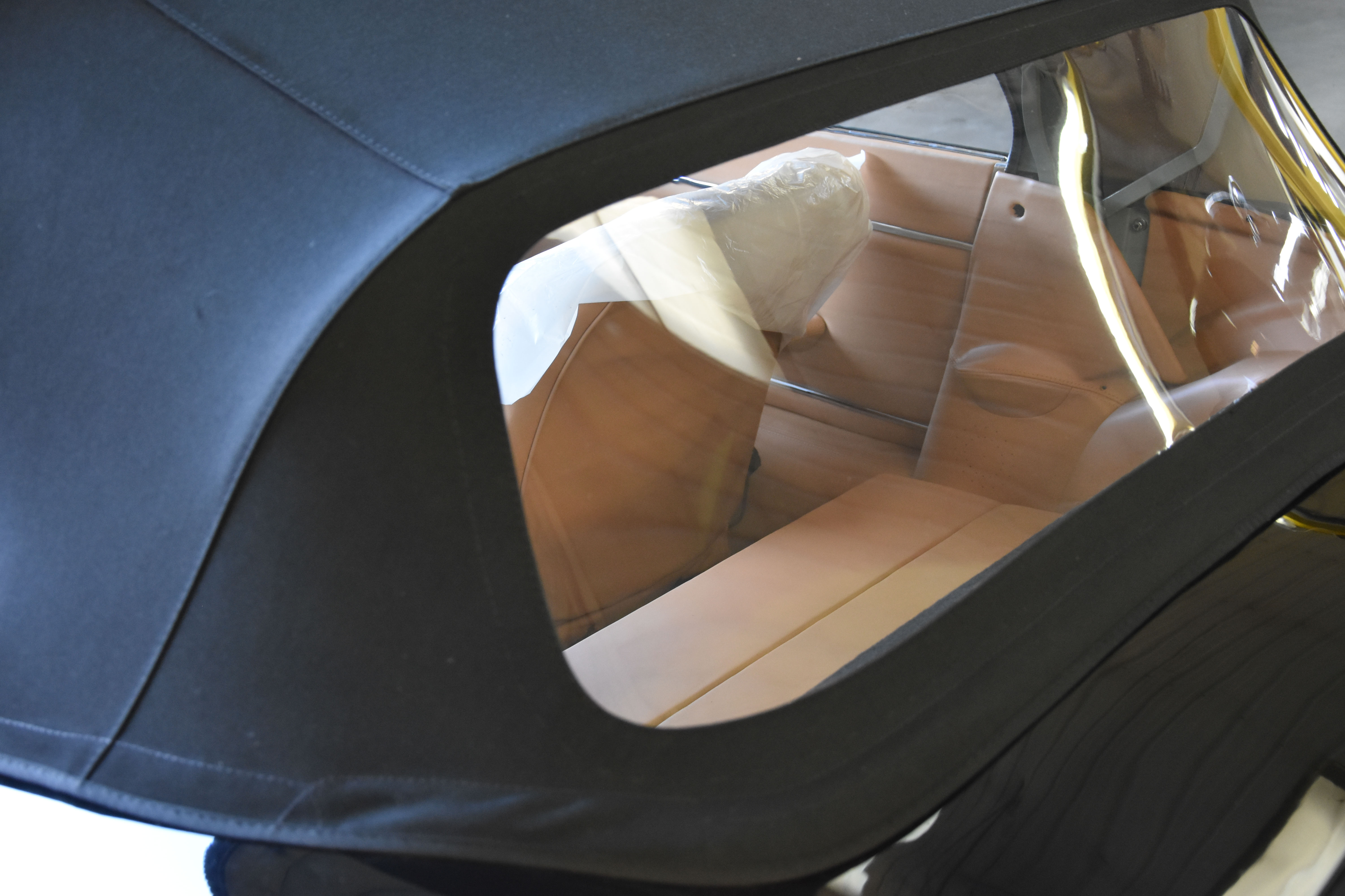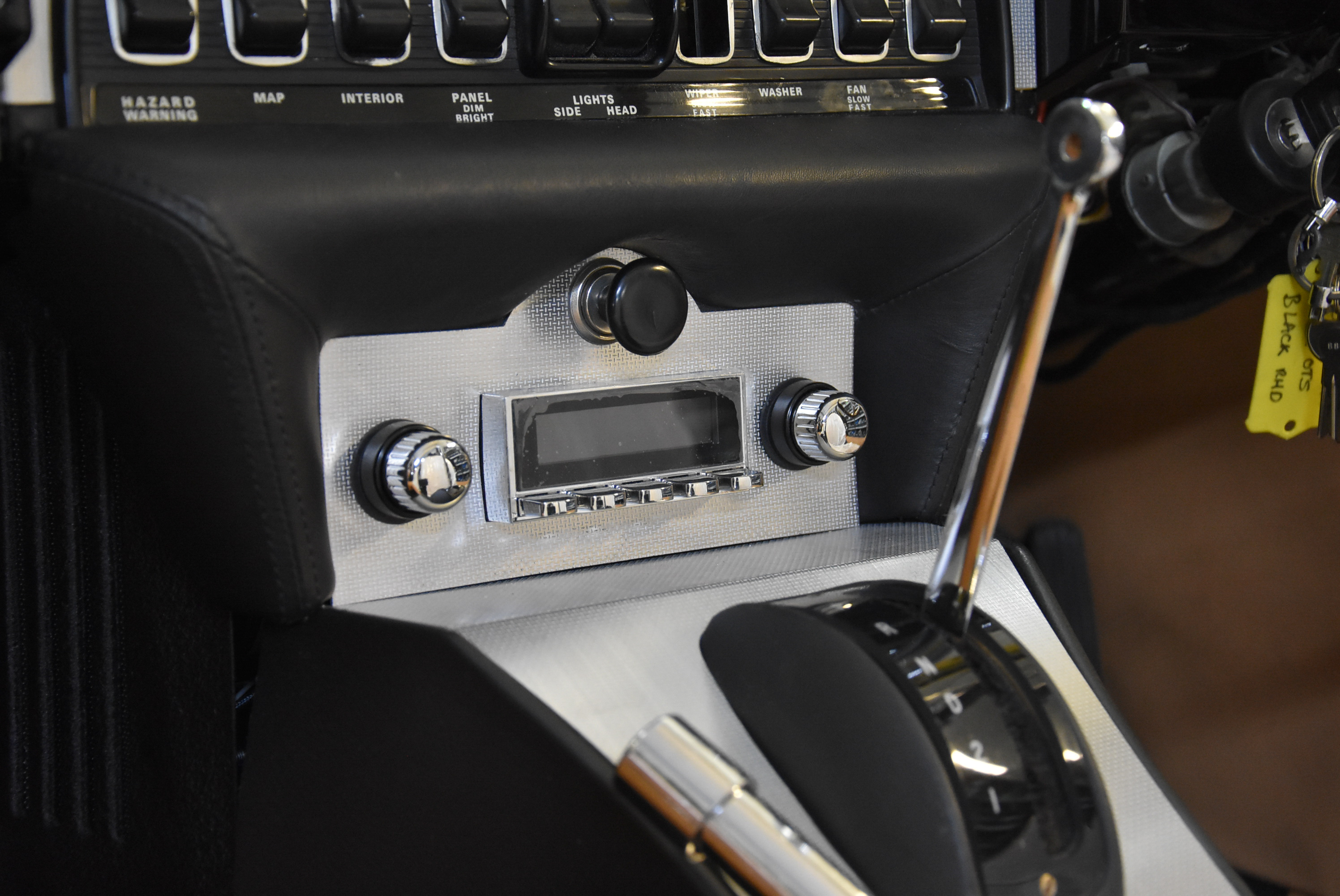 Since the E-type arrived at E-Type UK, retrimmed in full Tan leather, the roadster was treated to further bespoke touches to create a unique cabin appearance. Being a Jaguar lover, the client decided to include a nod to the early original E-type models via the installation of a bespoke built aluminium centre console and dash. The design was paired with painted Piano Black dash fascias with chrome gauge bezels, finally fitting an integrated retrofit radio system with Bluetooth and USB connectivity, quick release sports Moto-Lita steering wheel and all-new retrimmed black soft top.