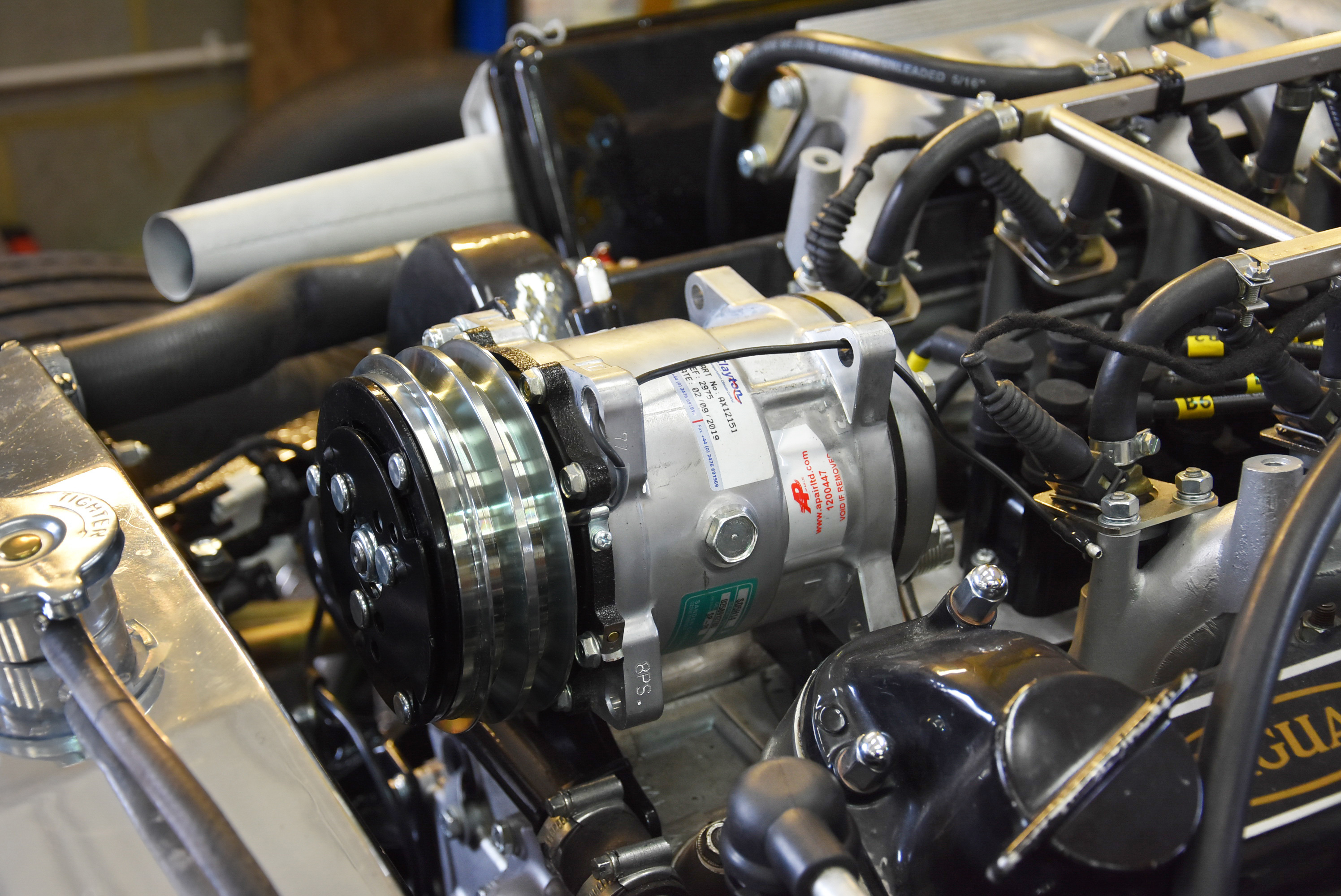 With the E-types running now on par with modern sports car performance, the project progresses to the interior and cabin comfort. As the E-type is destined to return to the high humidity climate of Hong Kong, driver comfort needs to be addressed, resulting in the installation of air conditioning. Through our custom-fitted fresh air system, we are able to offer a reliable AC system that supplies fresh cold air to the cabin via the original air ducts, all from an AC unit installed in the engine bay replacing the existing heater box. The AC condenser, compressor and alternator are neatly and subtly installed to ensure no visual disruption to the freshly restored engine bay.