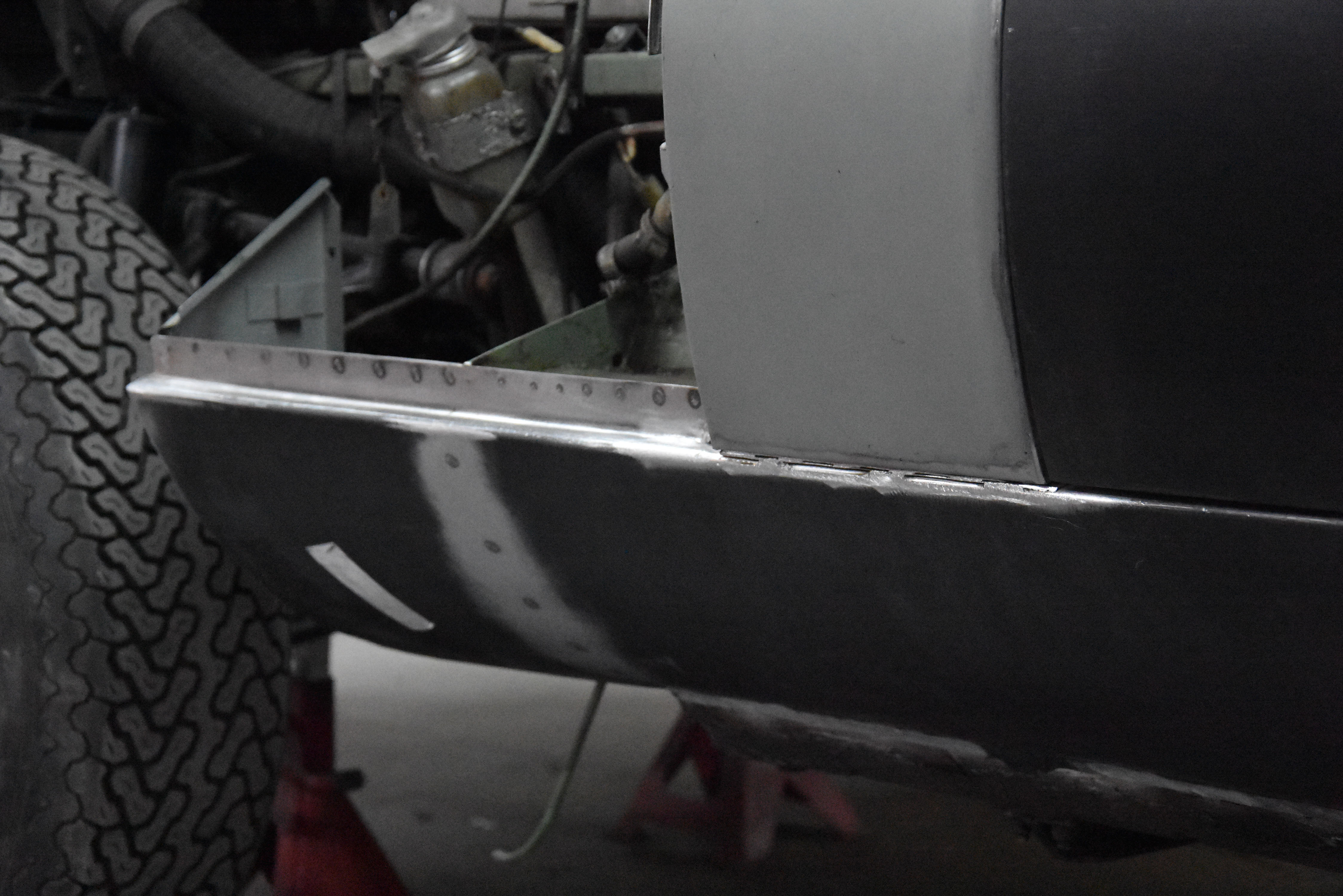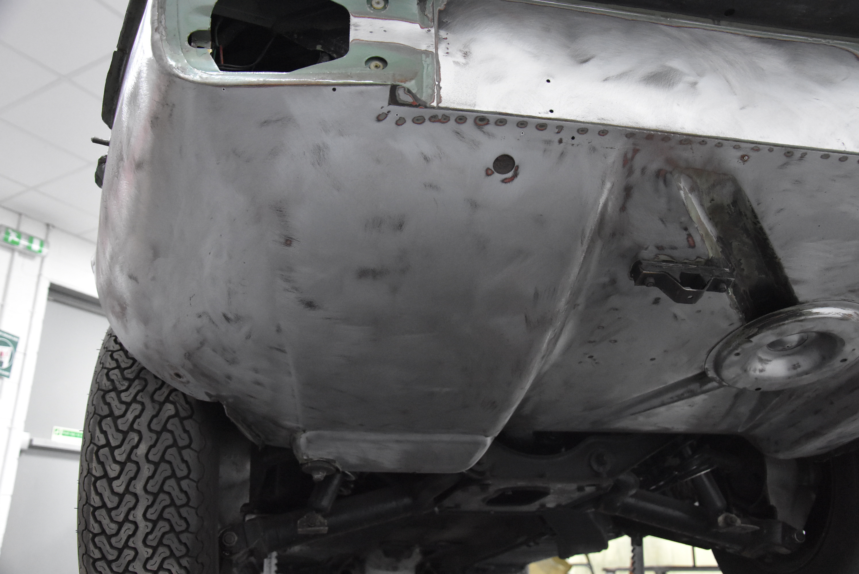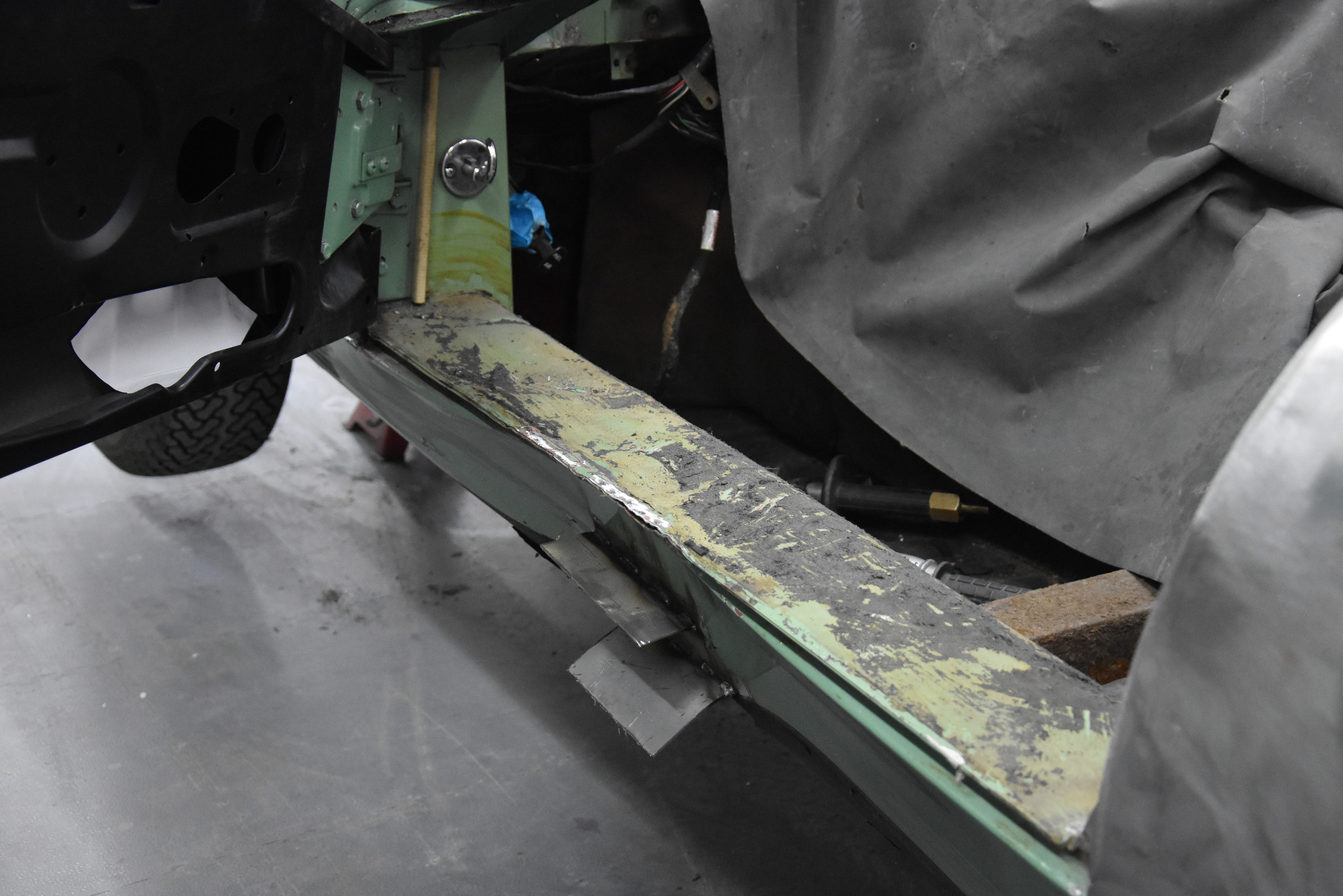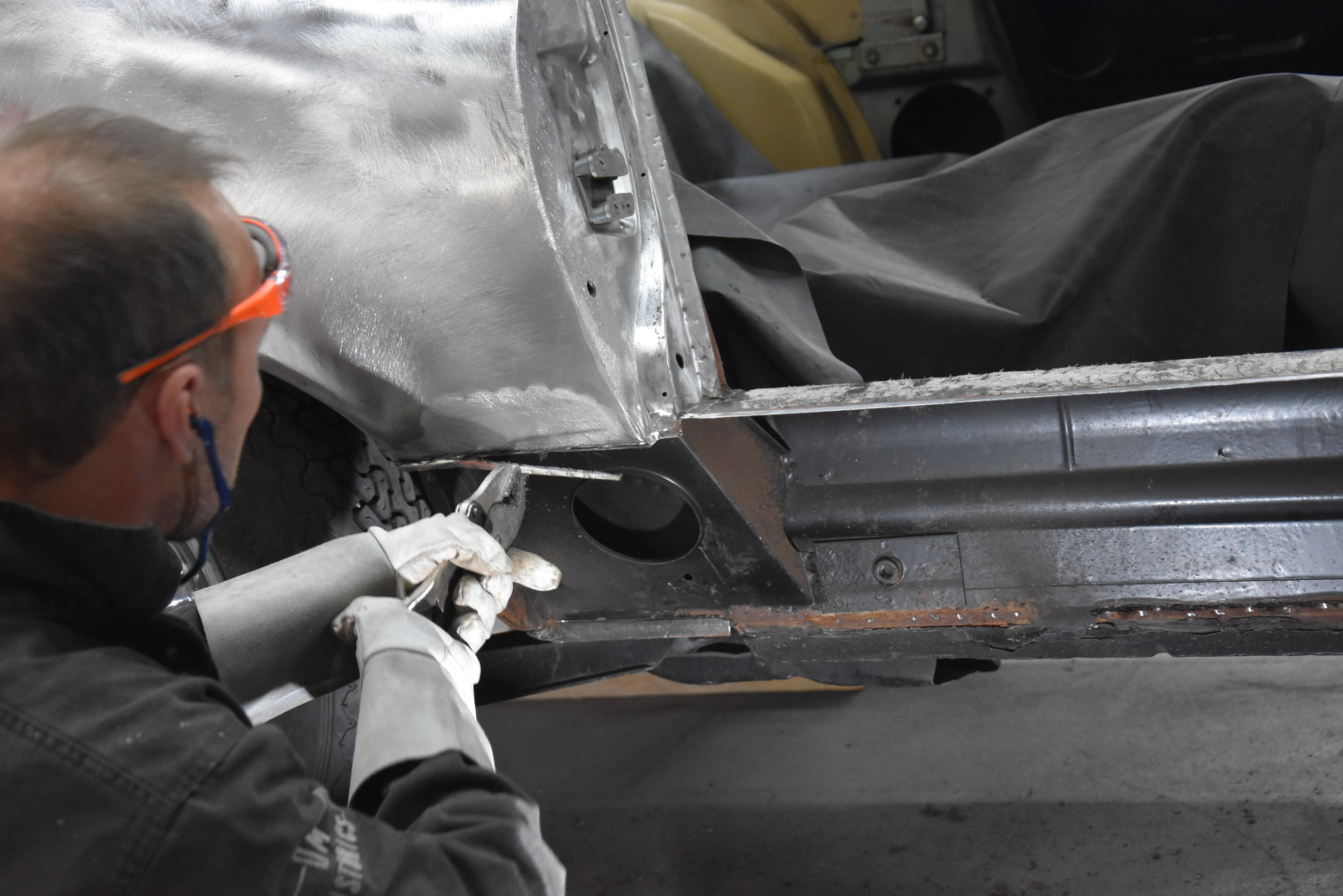 Now taken back to bare metal the Series 3 is ready to undertake this crash repair process. With all external paint removed the metal work team can view the extent of the damage in its entirety. The next step is to use the dozer tool, metal tags were welded to the existing panels to allow the Dozer to straighten the majority of the crash damage. Further fine alteration are made using heat and planishing tools to carry out the final repairs. The new door is trial fitted followed by the removal and replacement of the nearside sill.