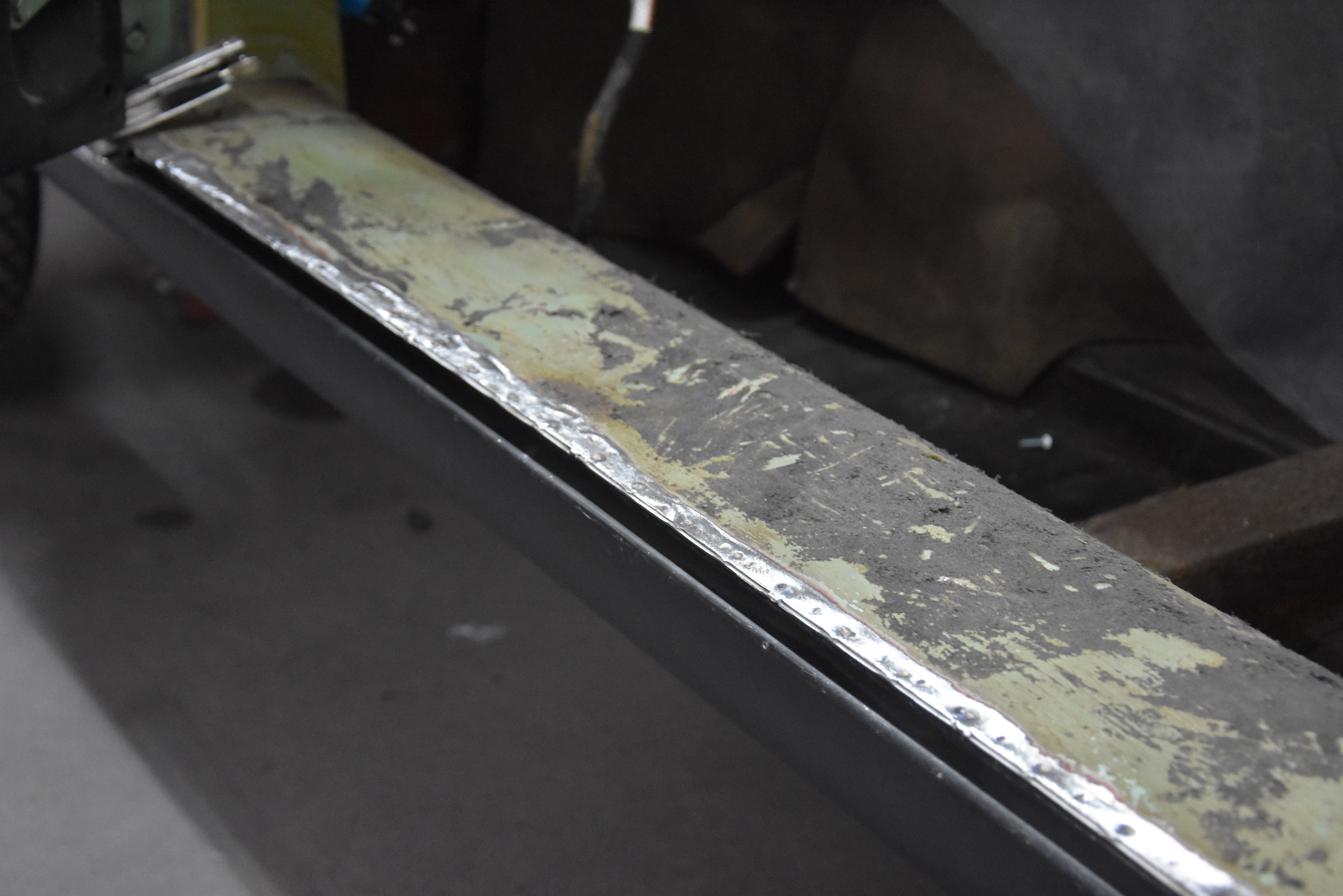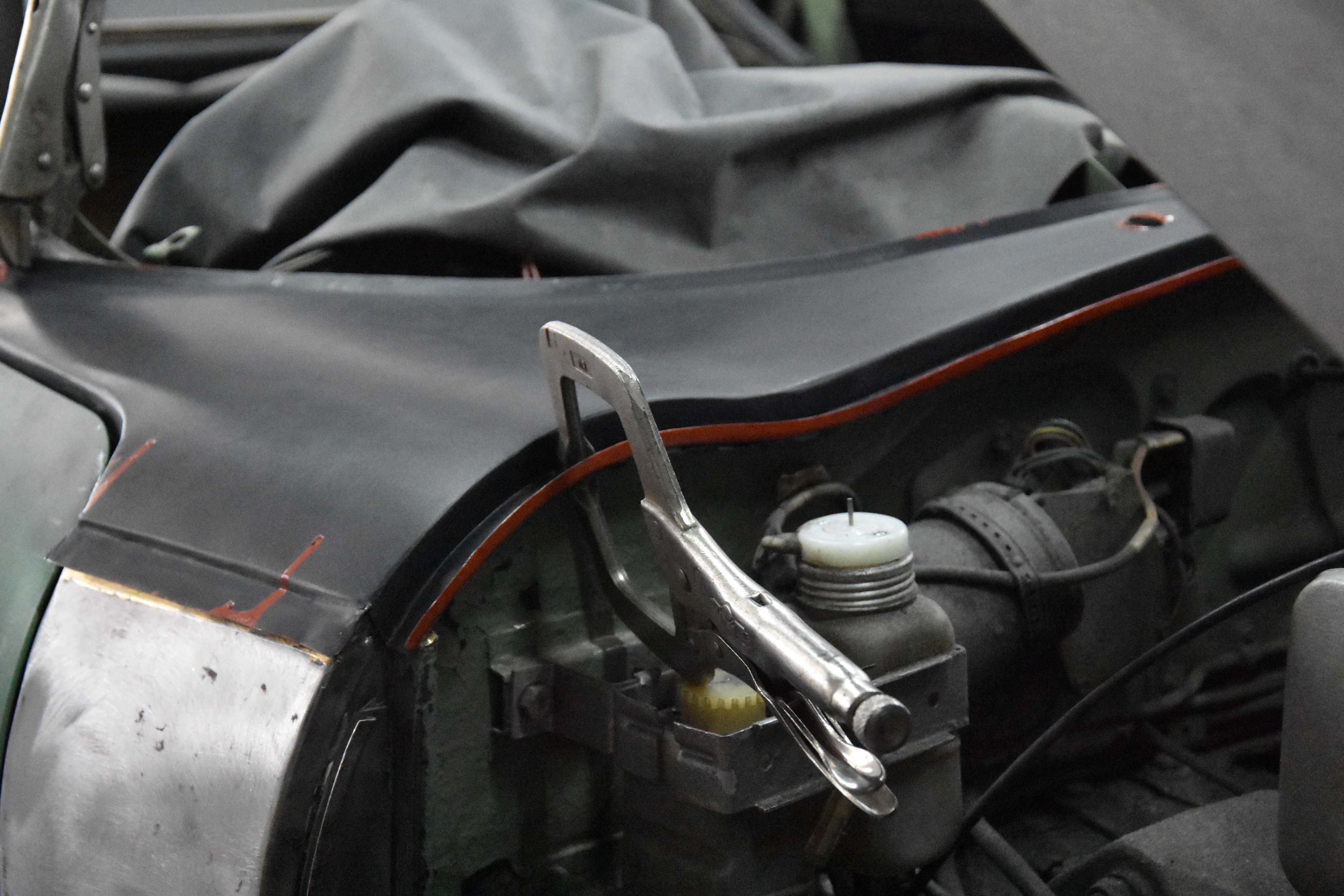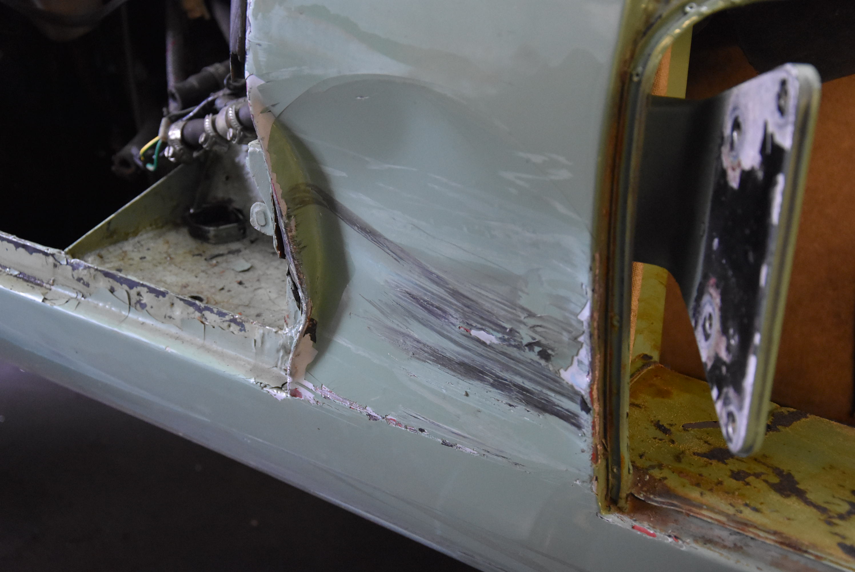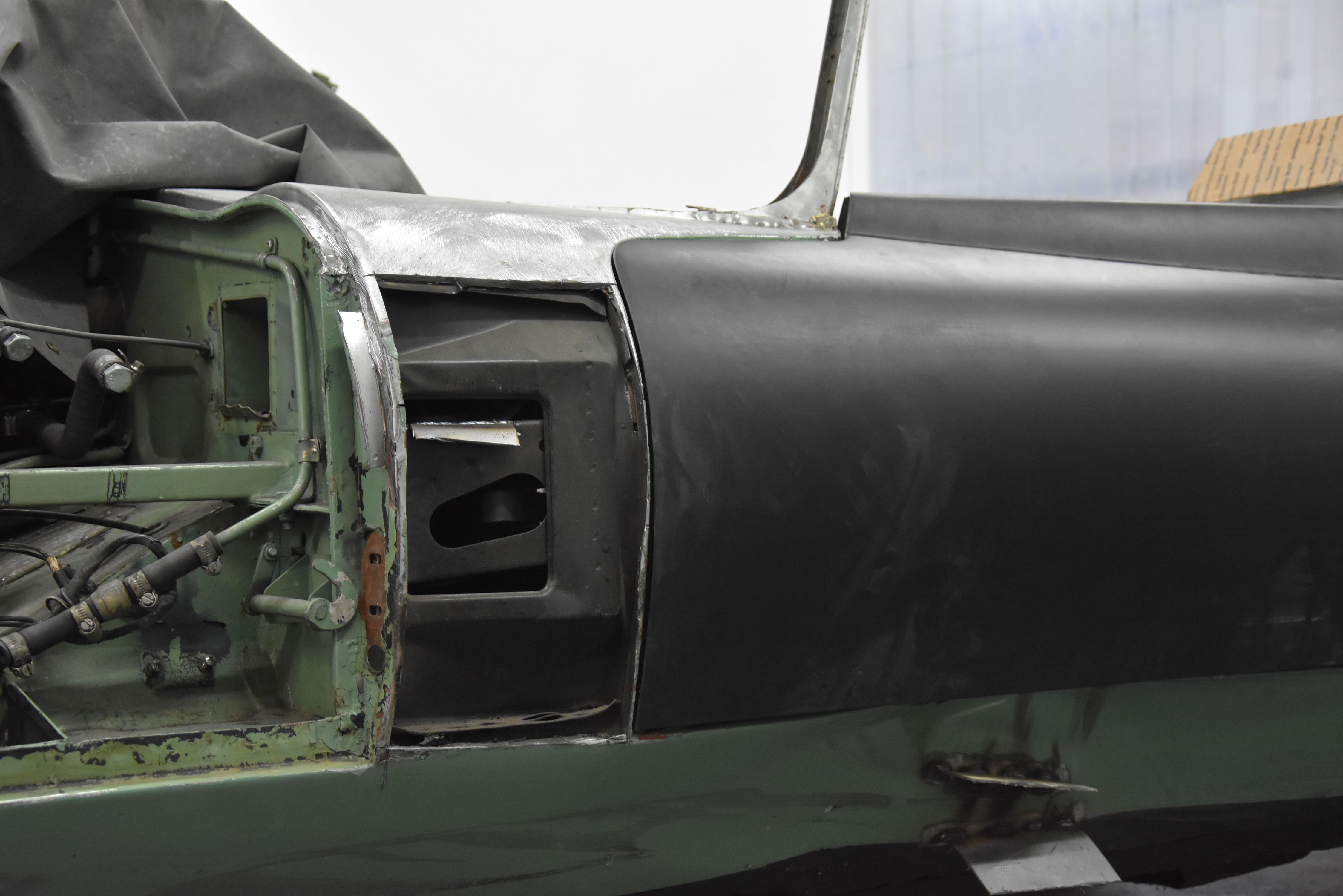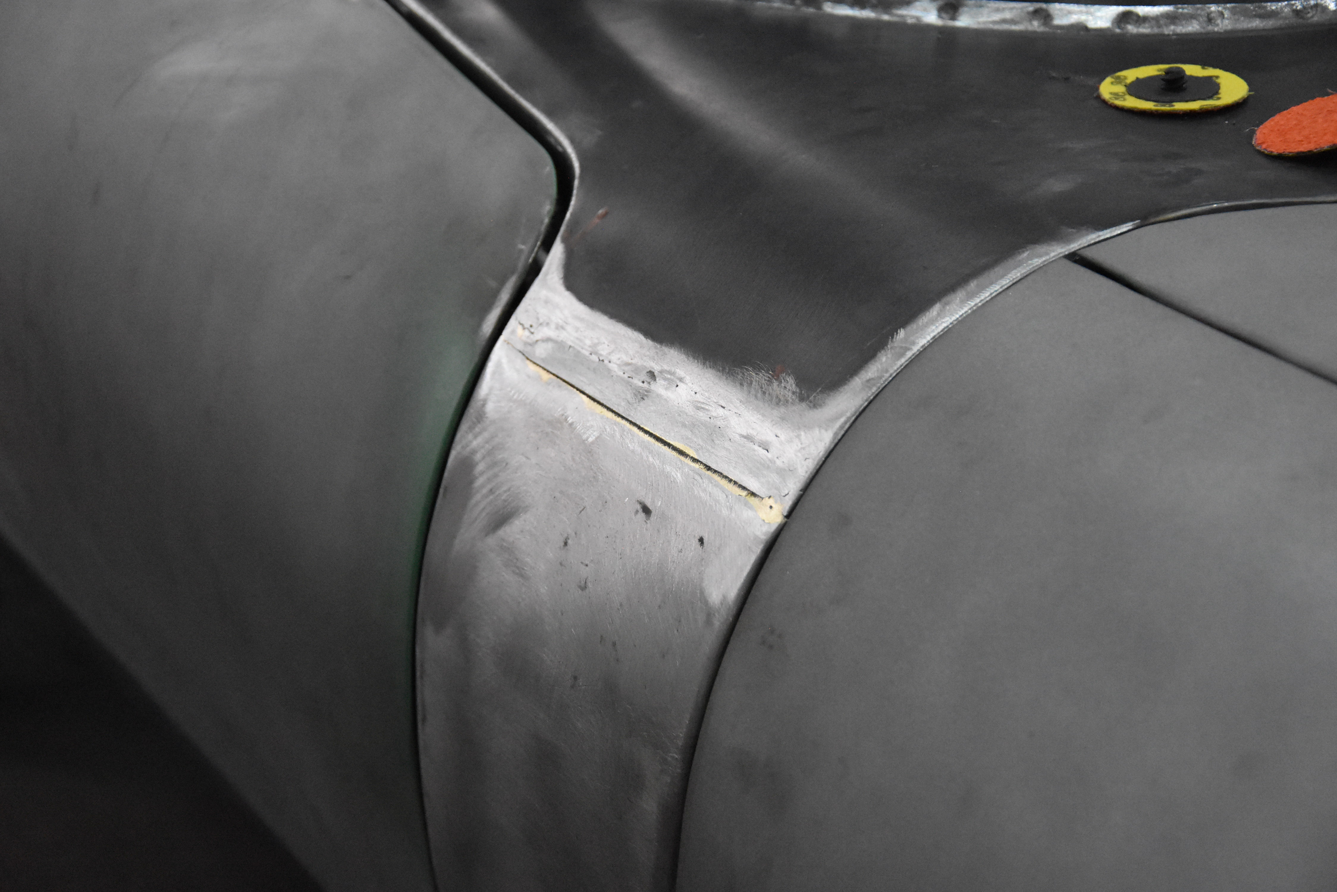 Now taken back to bare metal the Series 3 is ready to undertake this crash repair process. With all external paint removed the metal work team can view the extent of the damage in its entirety. The next step is to use the dozer tool, metal tags were welded to the existing panels to allow the Dozer to straighten the majority of the crash damage. Further fine alteration are made using heat and planishing tools to carry out the final repairs. The new door is trial fitted followed by the removal and replacement of the nearside sill.