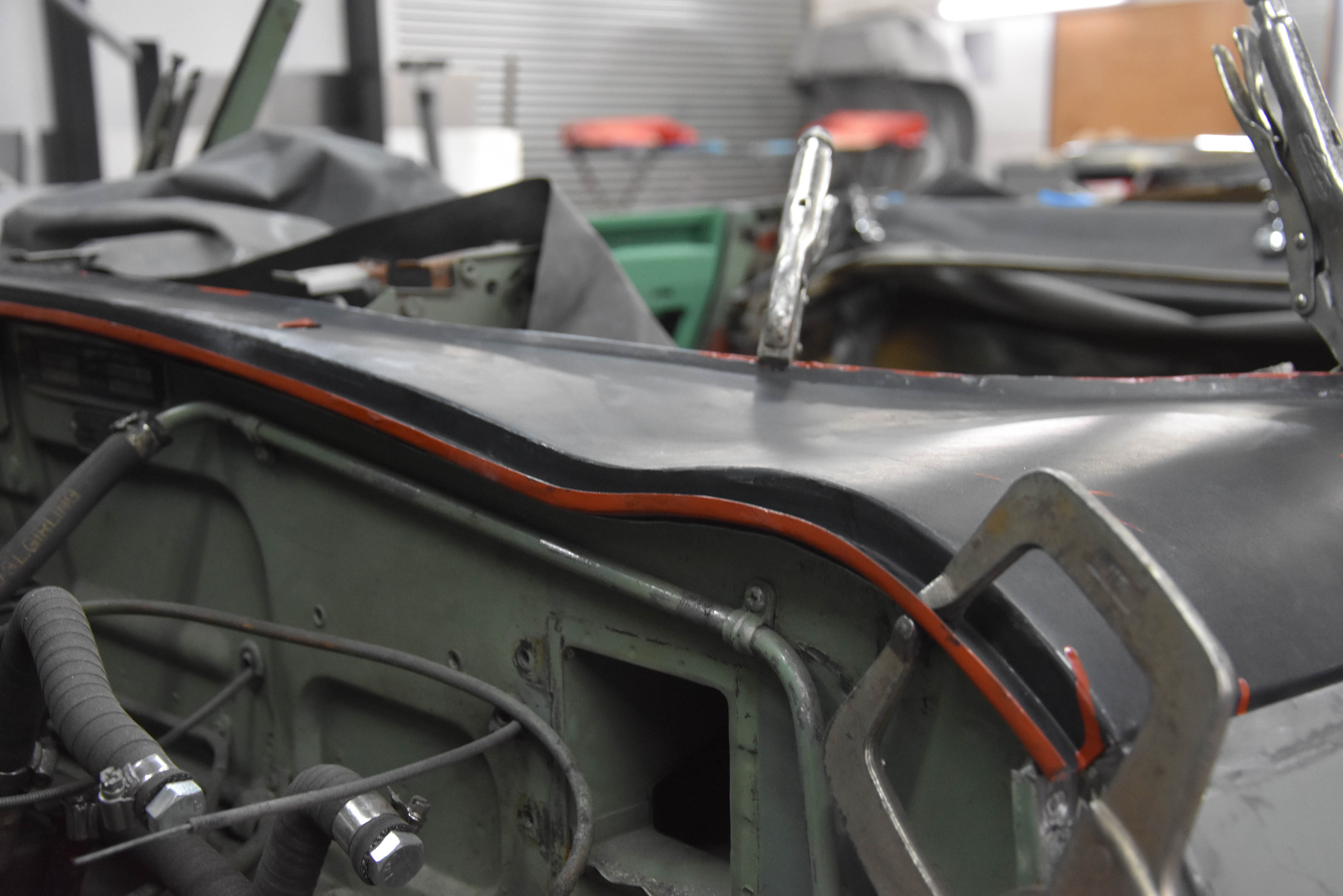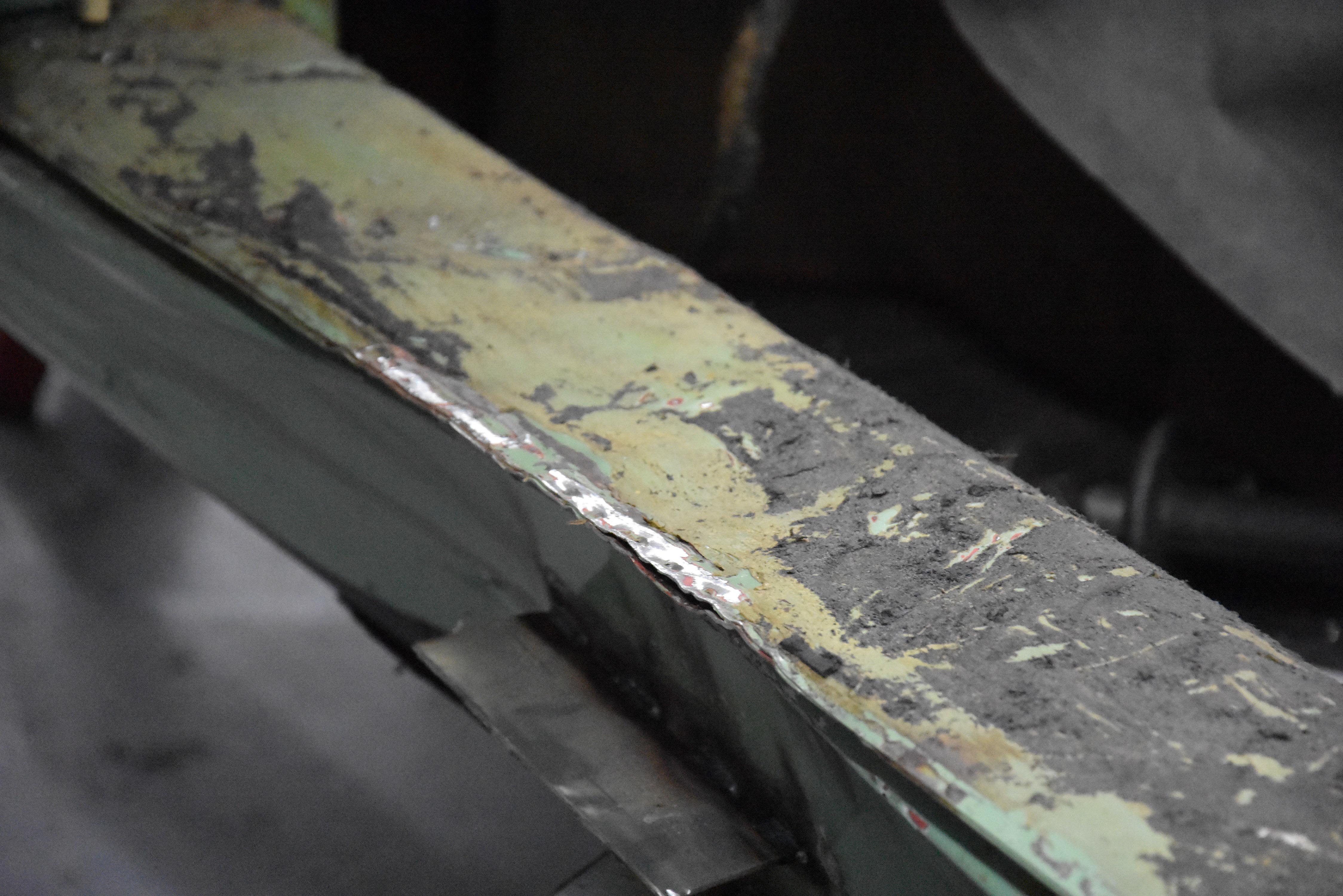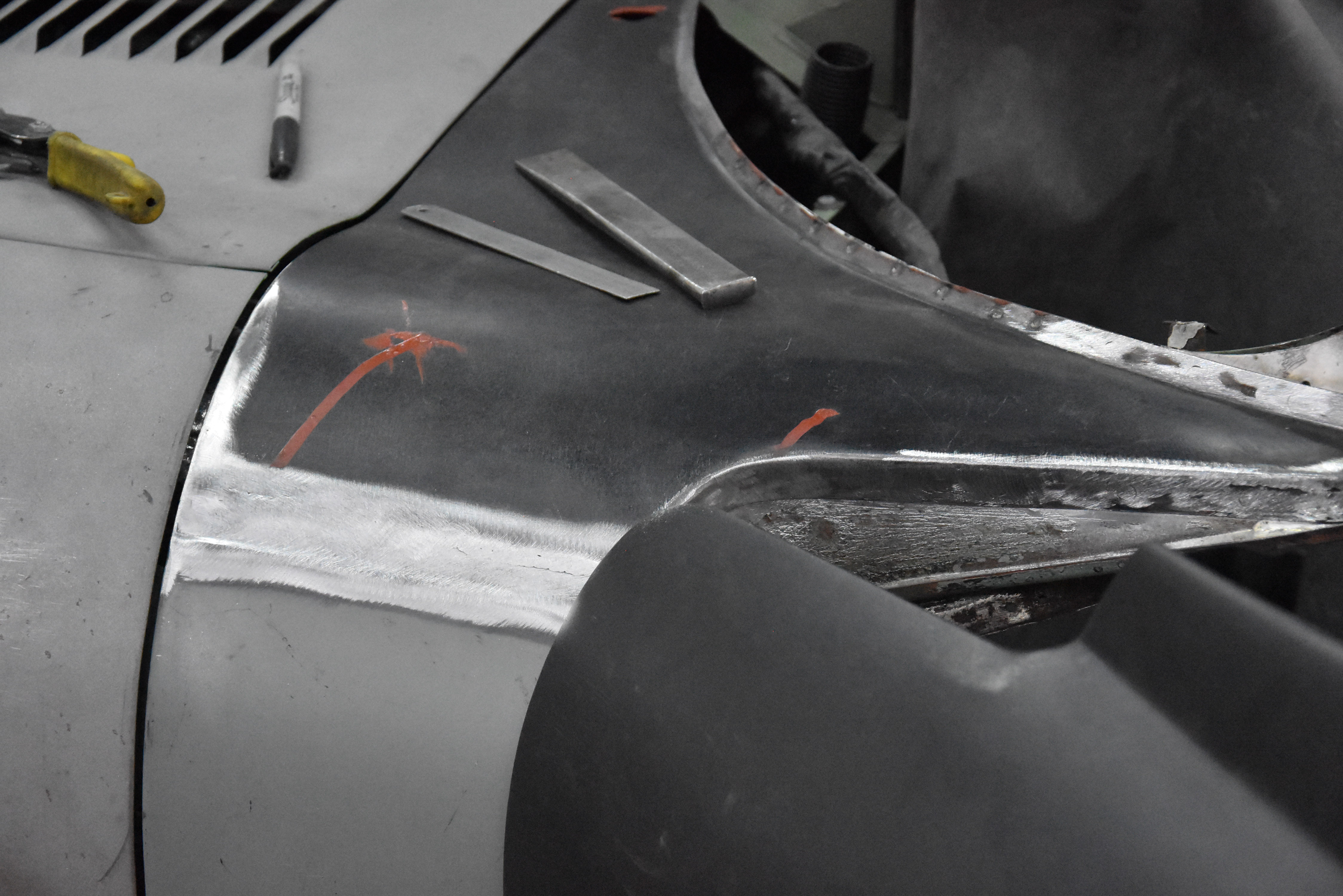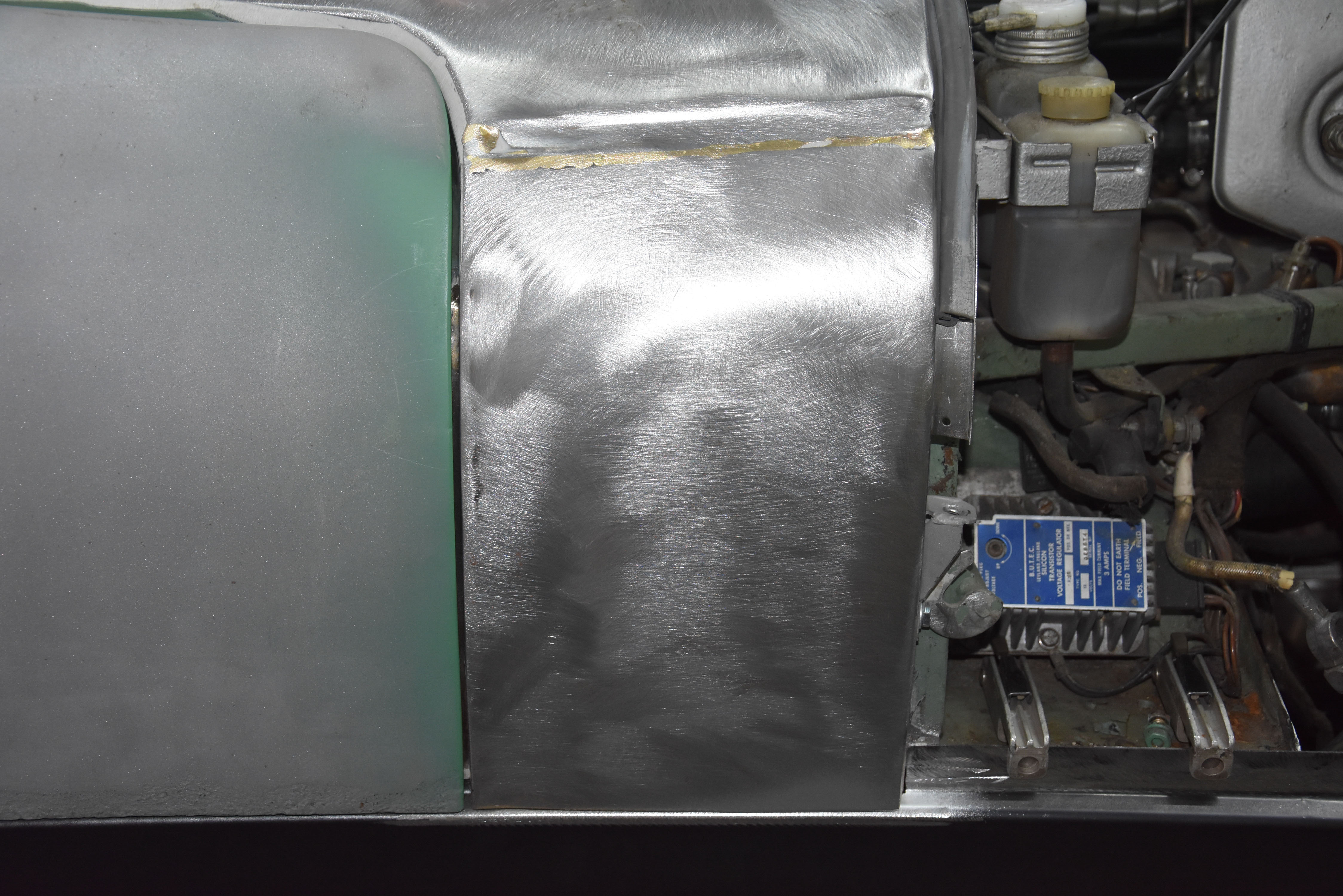 Now taken back to bare metal the Series 3 is ready to undertake this crash repair process. With all external paint removed the metal work team can view the extent of the damage in its entirety. The next step is to use the dozer tool, metal tags were welded to the existing panels to allow the Dozer to straighten the majority of the crash damage. Further fine alteration are made using heat and planishing tools to carry out the final repairs. The new door is trial fitted followed by the removal and replacement of the nearside sill.