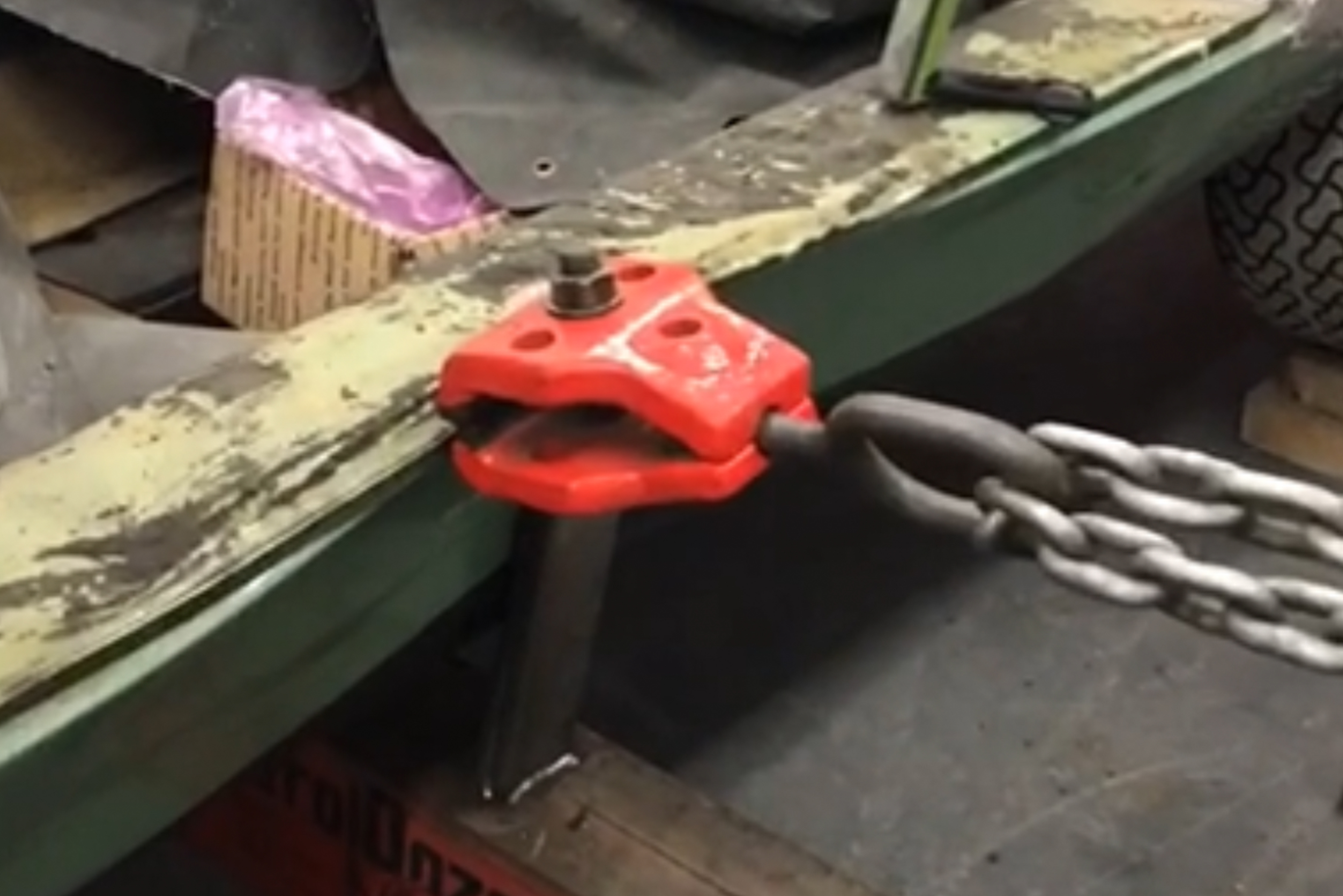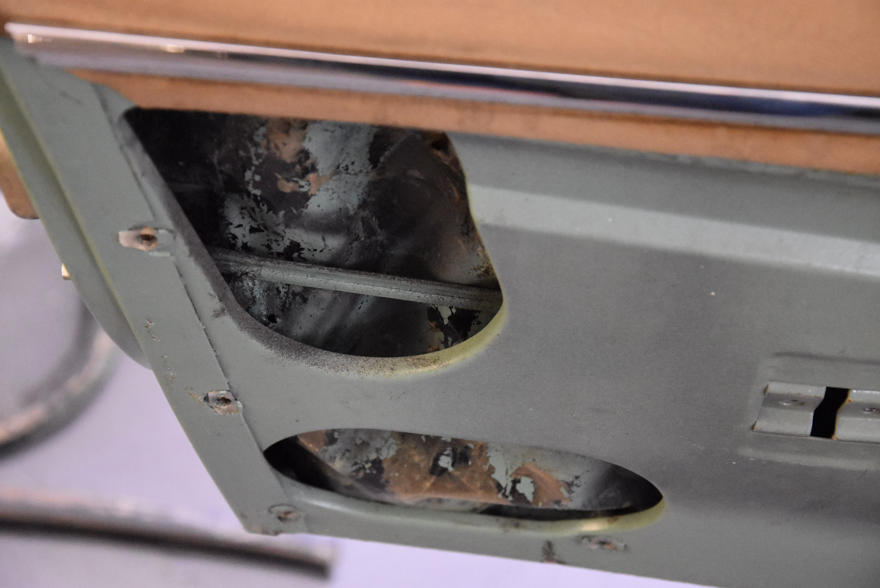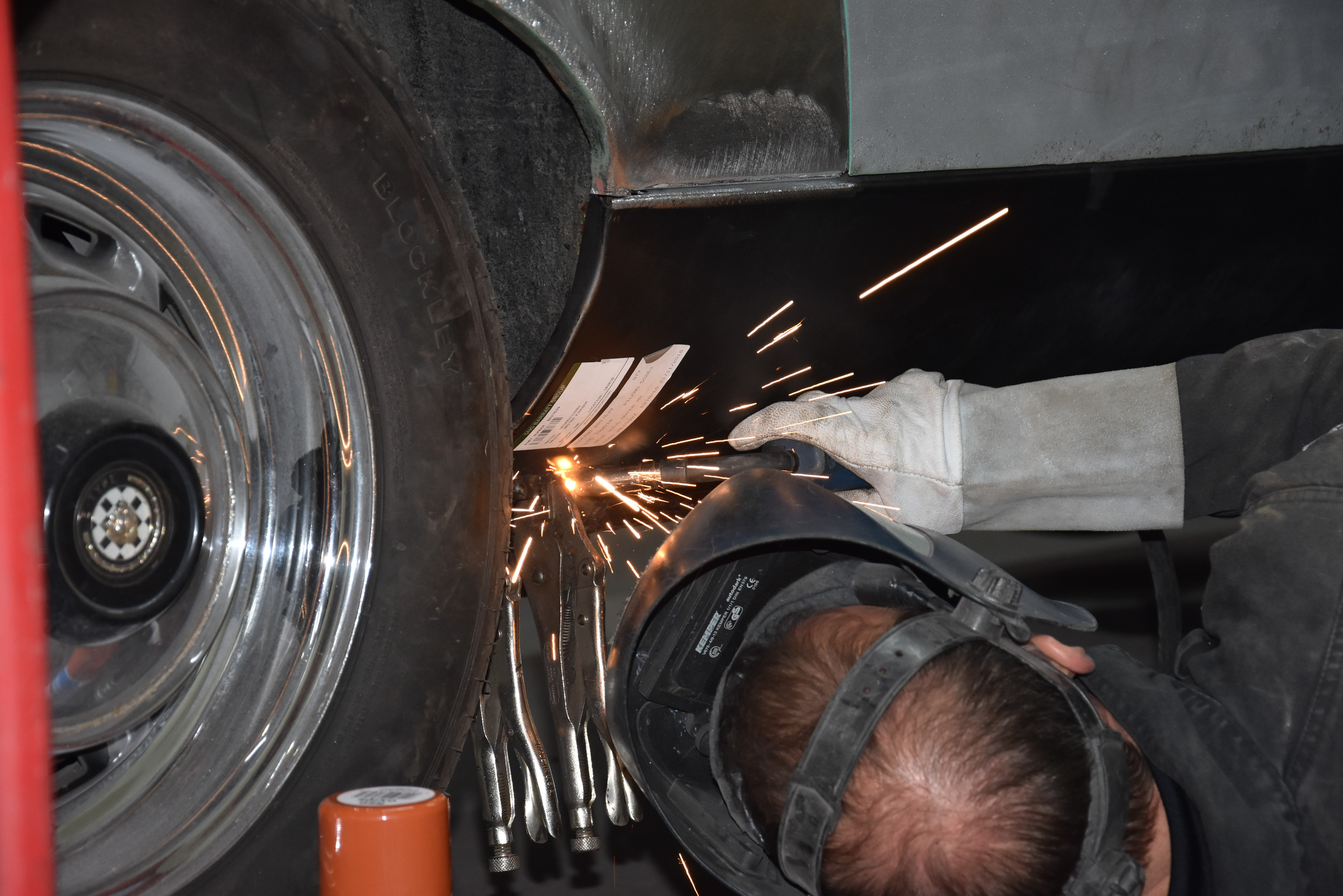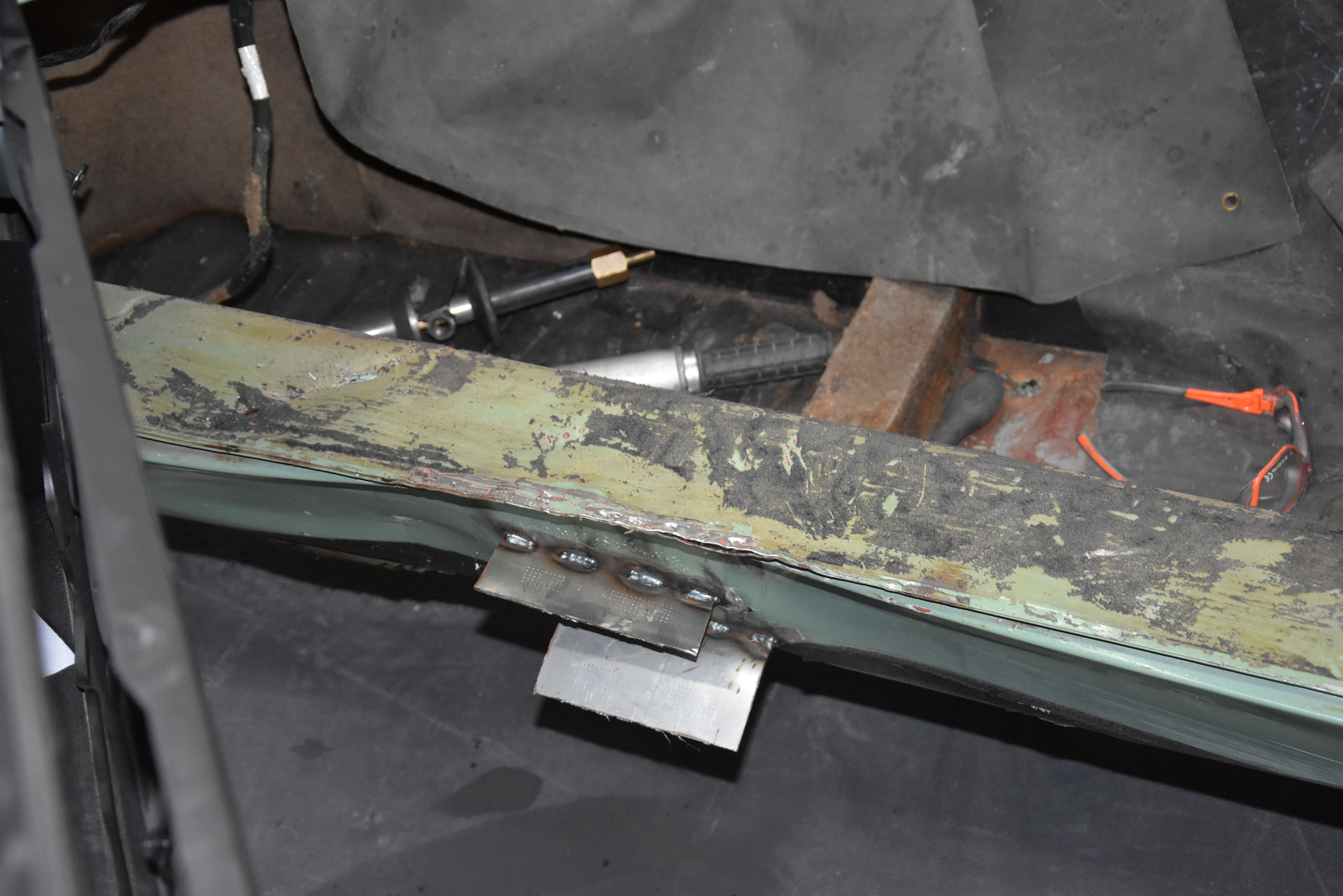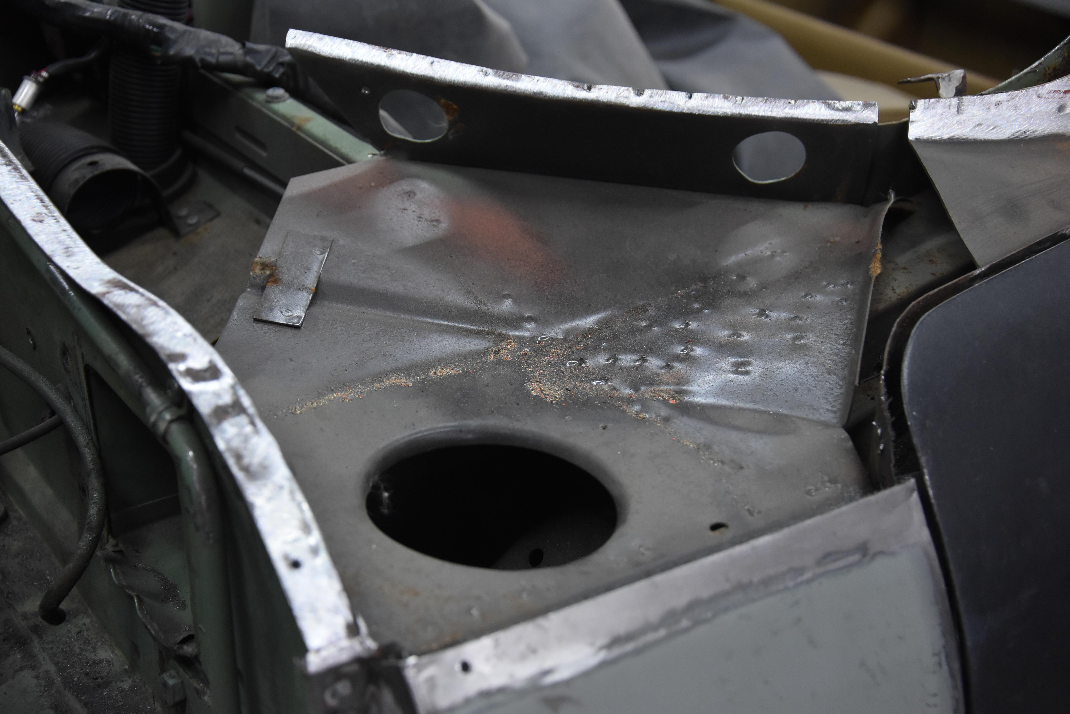 Now taken back to bare metal the Series 3 is ready to undertake this crash repair process. With all external paint removed the metal work team can view the extent of the damage in its entirety. The next step is to use the dozer tool, metal tags were welded to the existing panels to allow the Dozer to straighten the majority of the crash damage. Further fine alteration are made using heat and planishing tools to carry out the final repairs. The new door is trial fitted followed by the removal and replacement of the nearside sill.