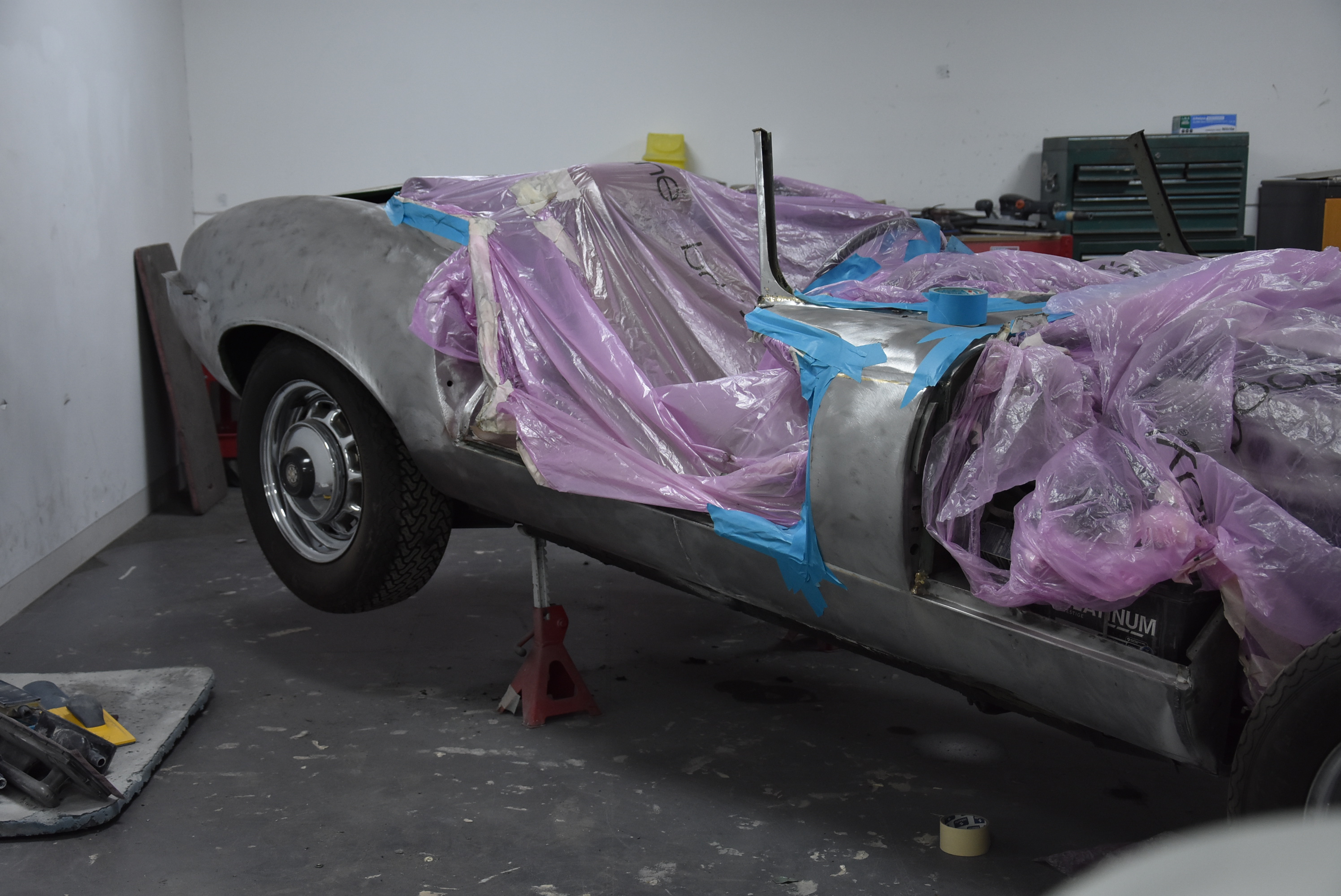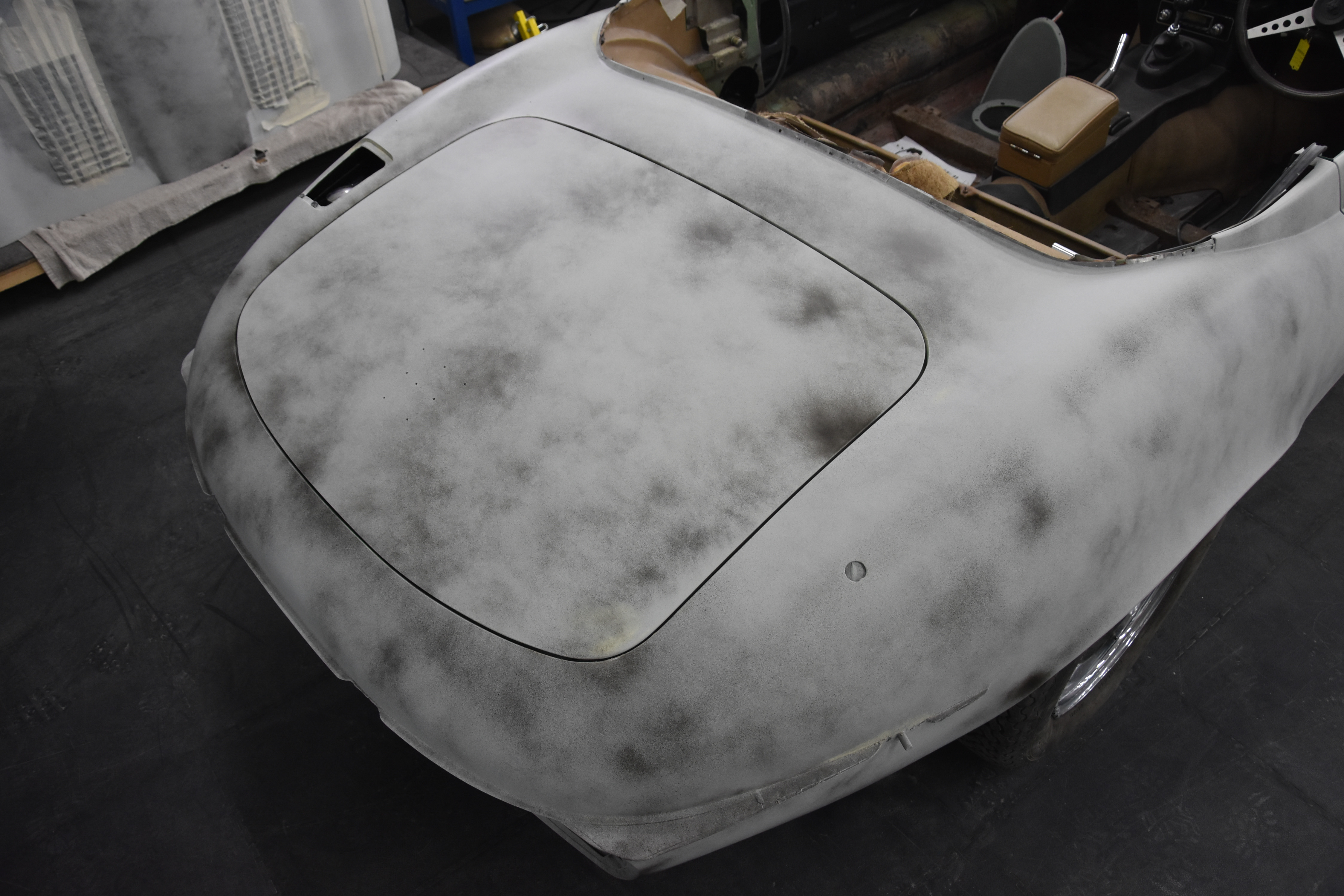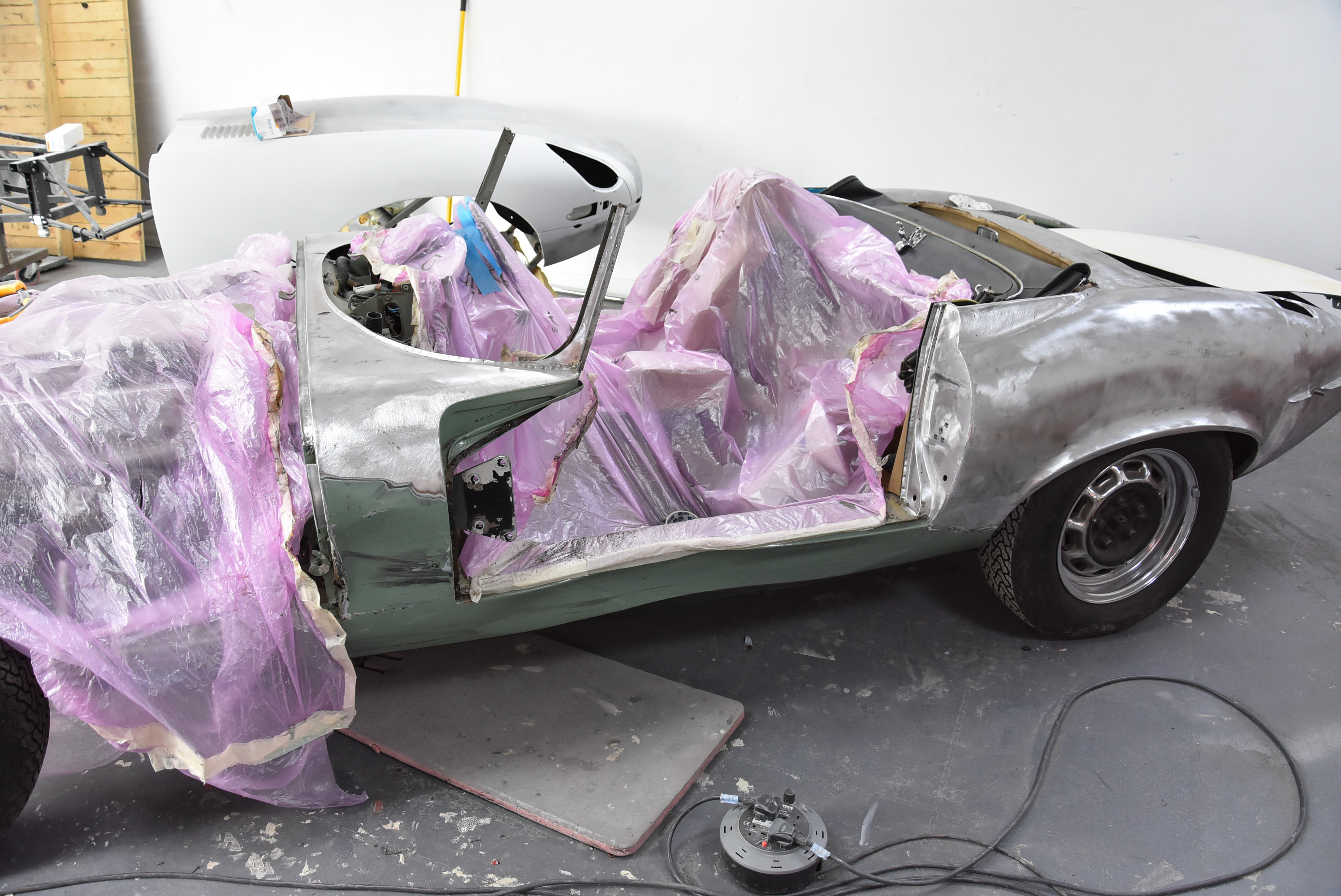 The E-type was handed to the metal work team who stripped down the exterior of the car, removing all chrome and brightwork which includes removing the bonnet. Once only the shell and interior were left, the car was taped up and the team began stripping the paint back to bare metal.