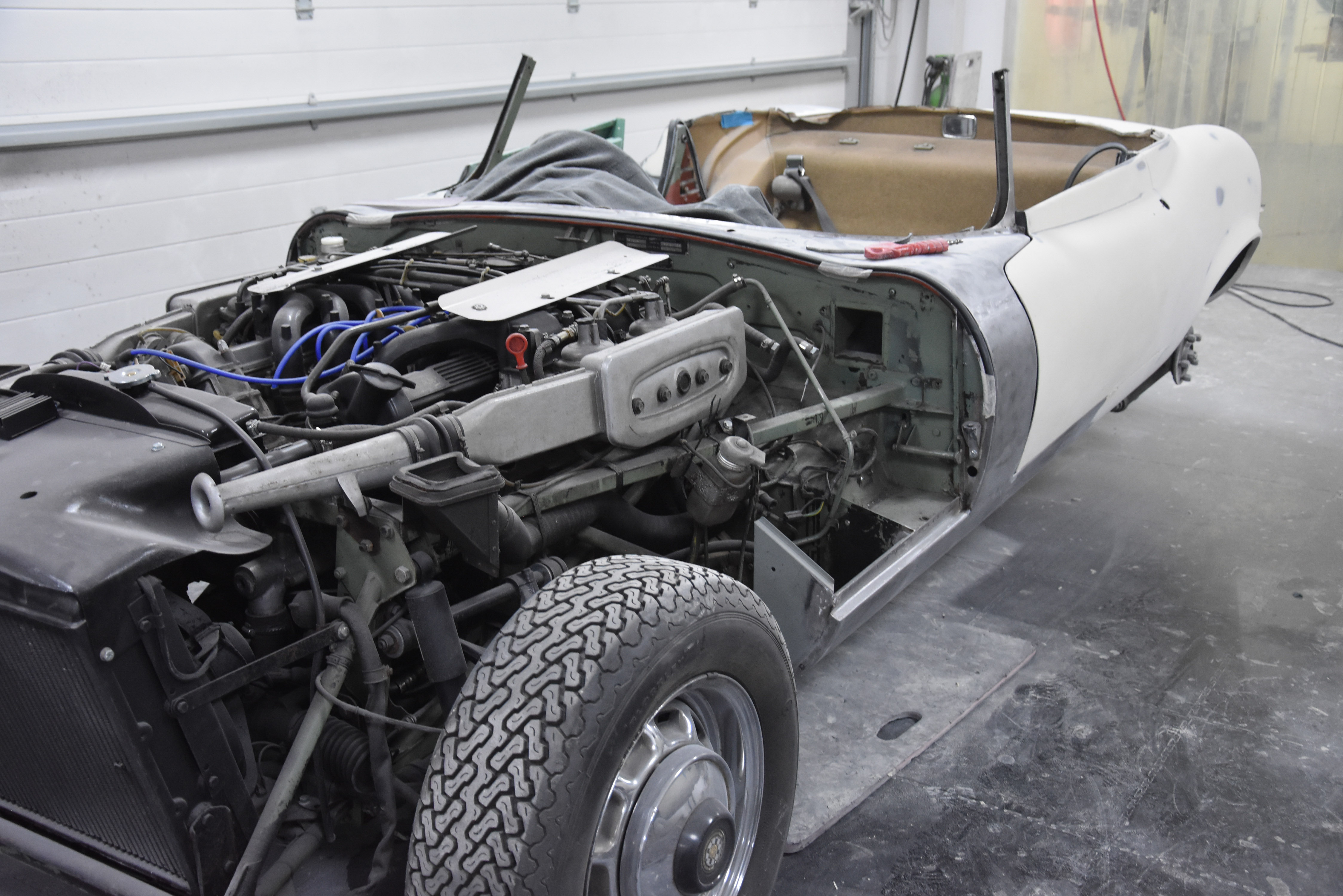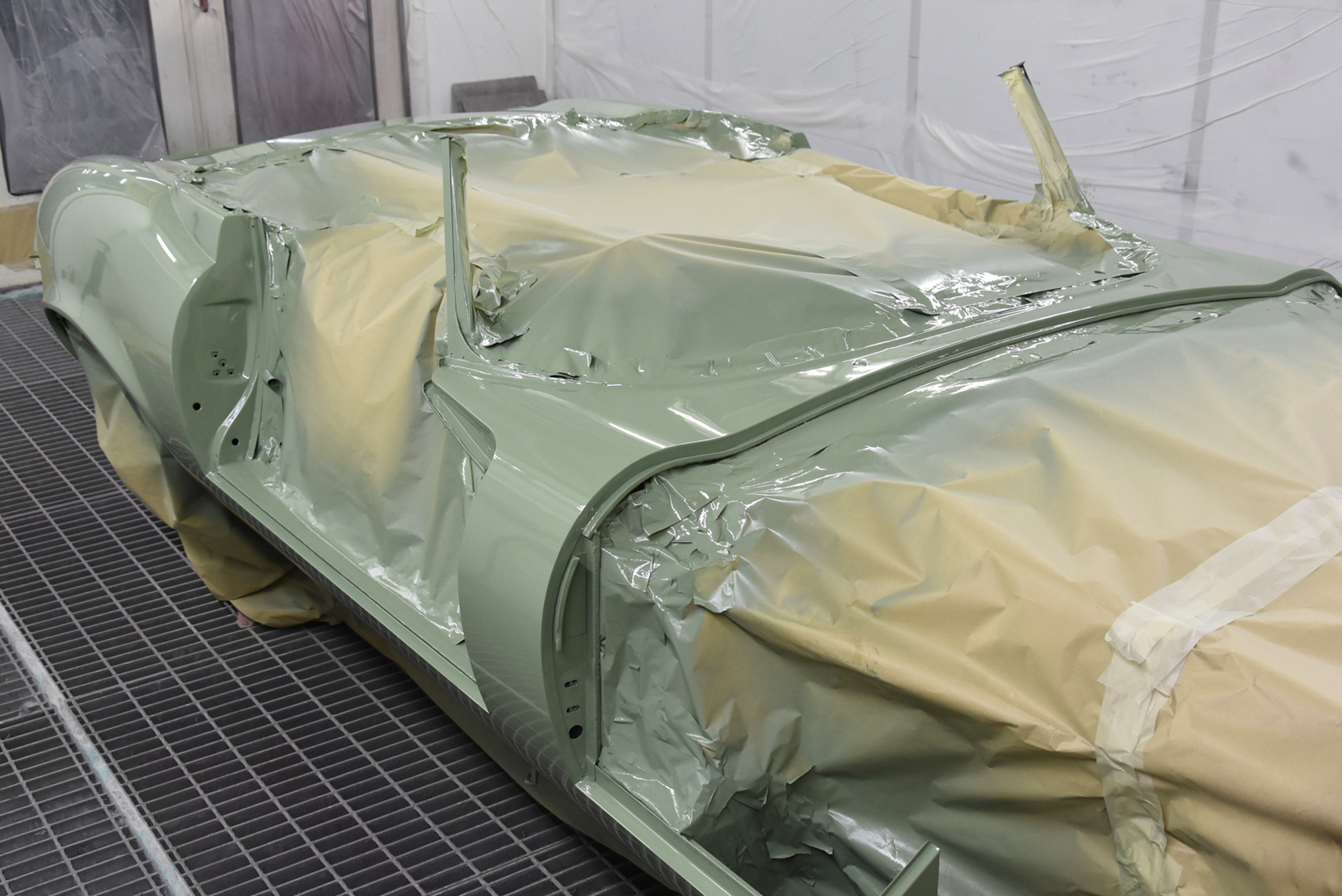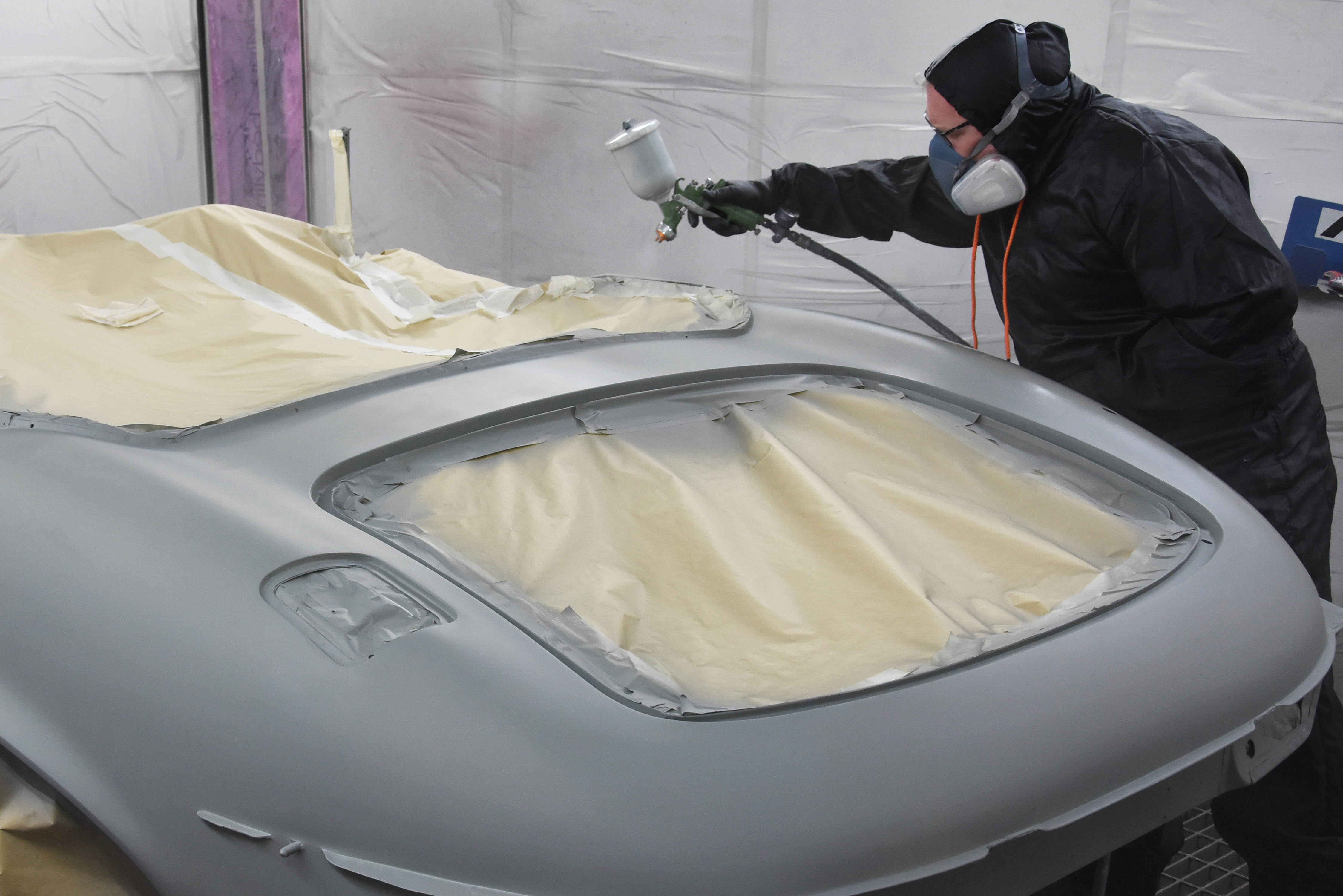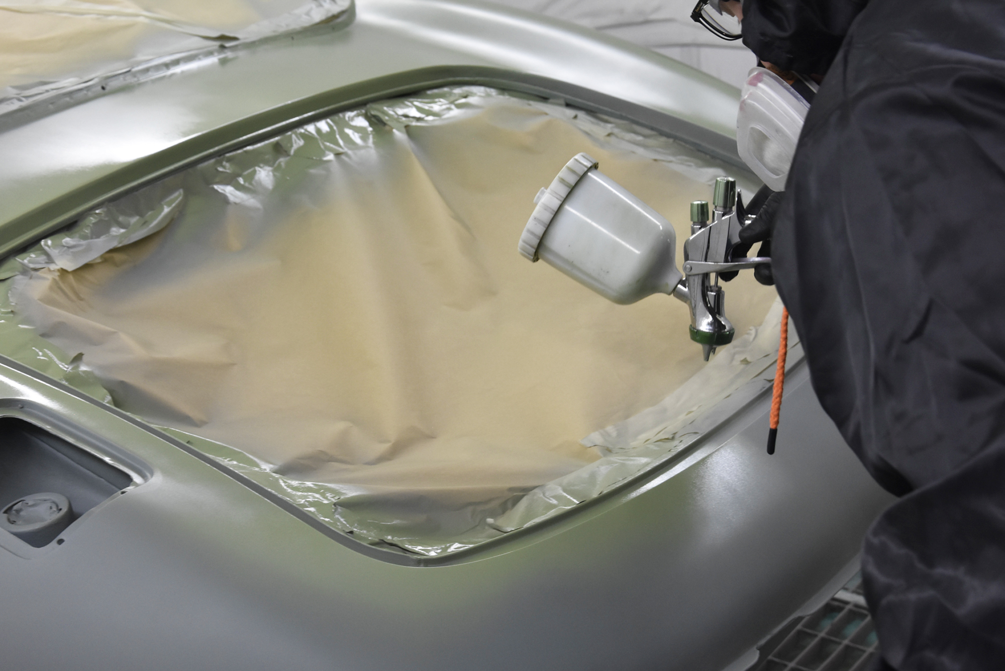 Now nearing the end of its primer process the team prepares to spray the car to its factory finish, Willow Green. Once sprayed the Series 3 will be treated to a full interior retrim.