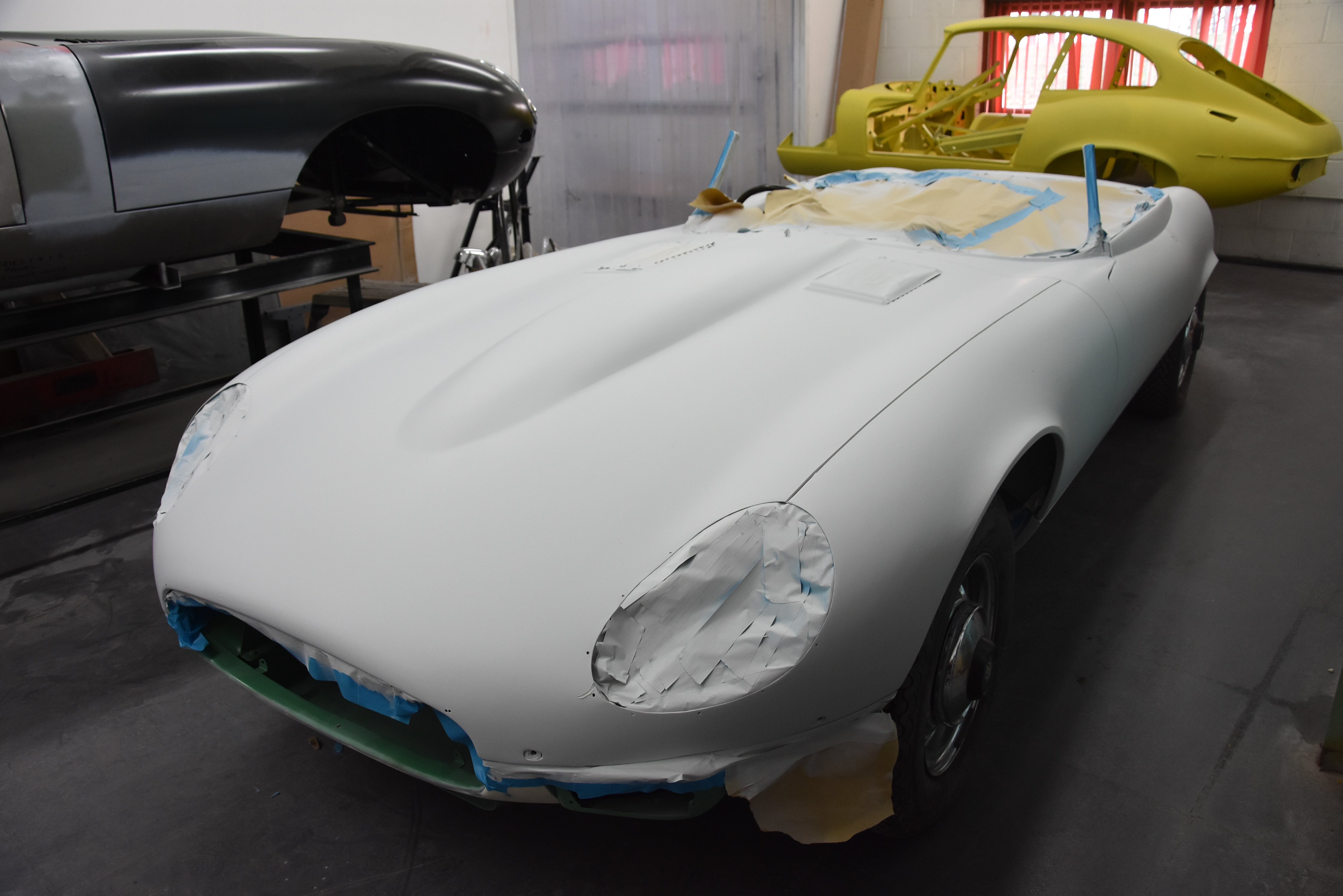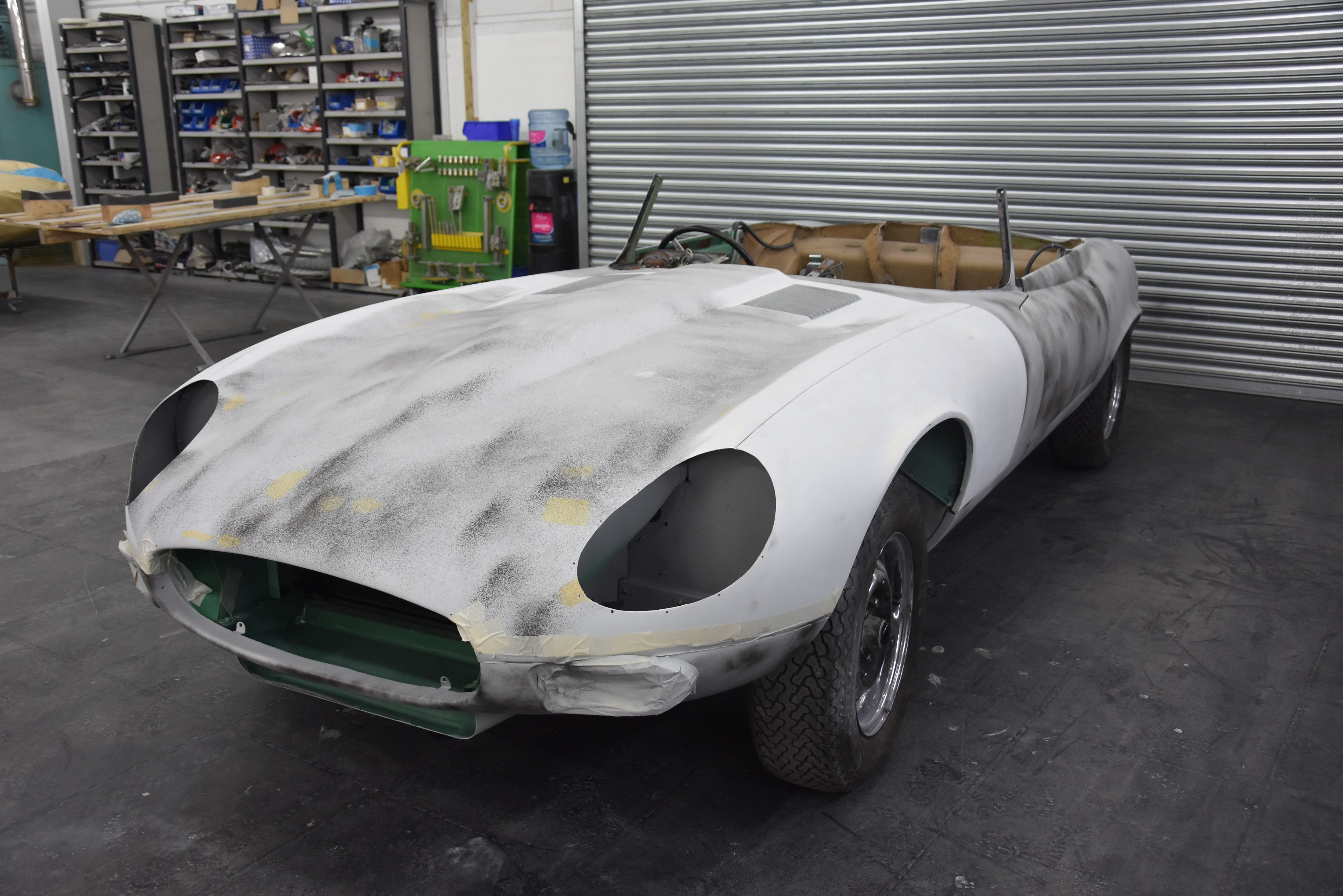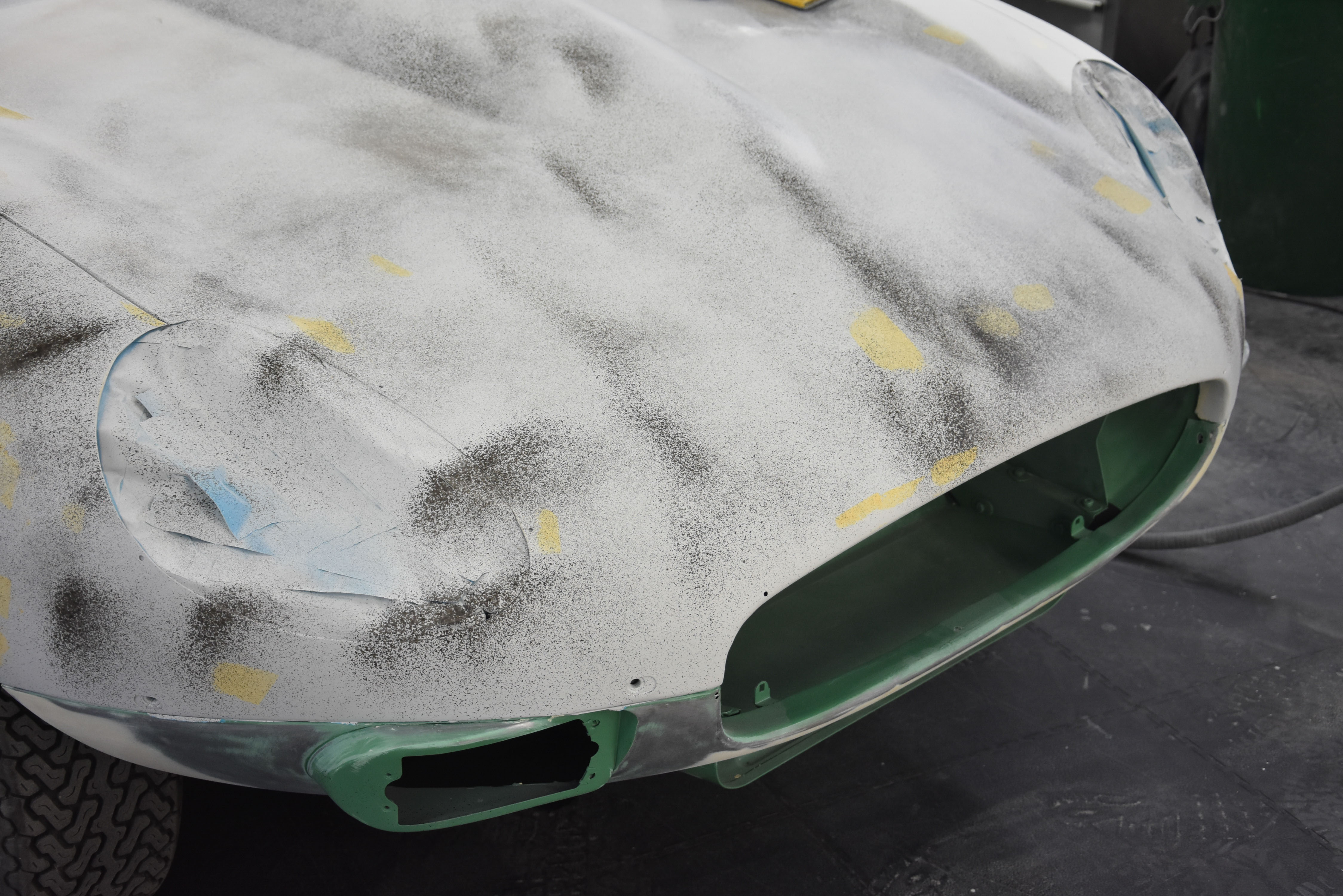 With the Series 3 now boasting 'better than new' lines and gaps, the E-type is given its first round of primer. Building up primer layers help to create a stronger and more ideal base to apply that all important finish too. Initially, all panels are removed from the shell to be sprayed separately, once hardened and block sanded back the panels are fitted back to the shell. During this time the shell is also given a round of Etch primer to protect the panels against corrosion, thus ensuring the Concours paint finish offered by E-Type UK, with the right care will stand the test of time.