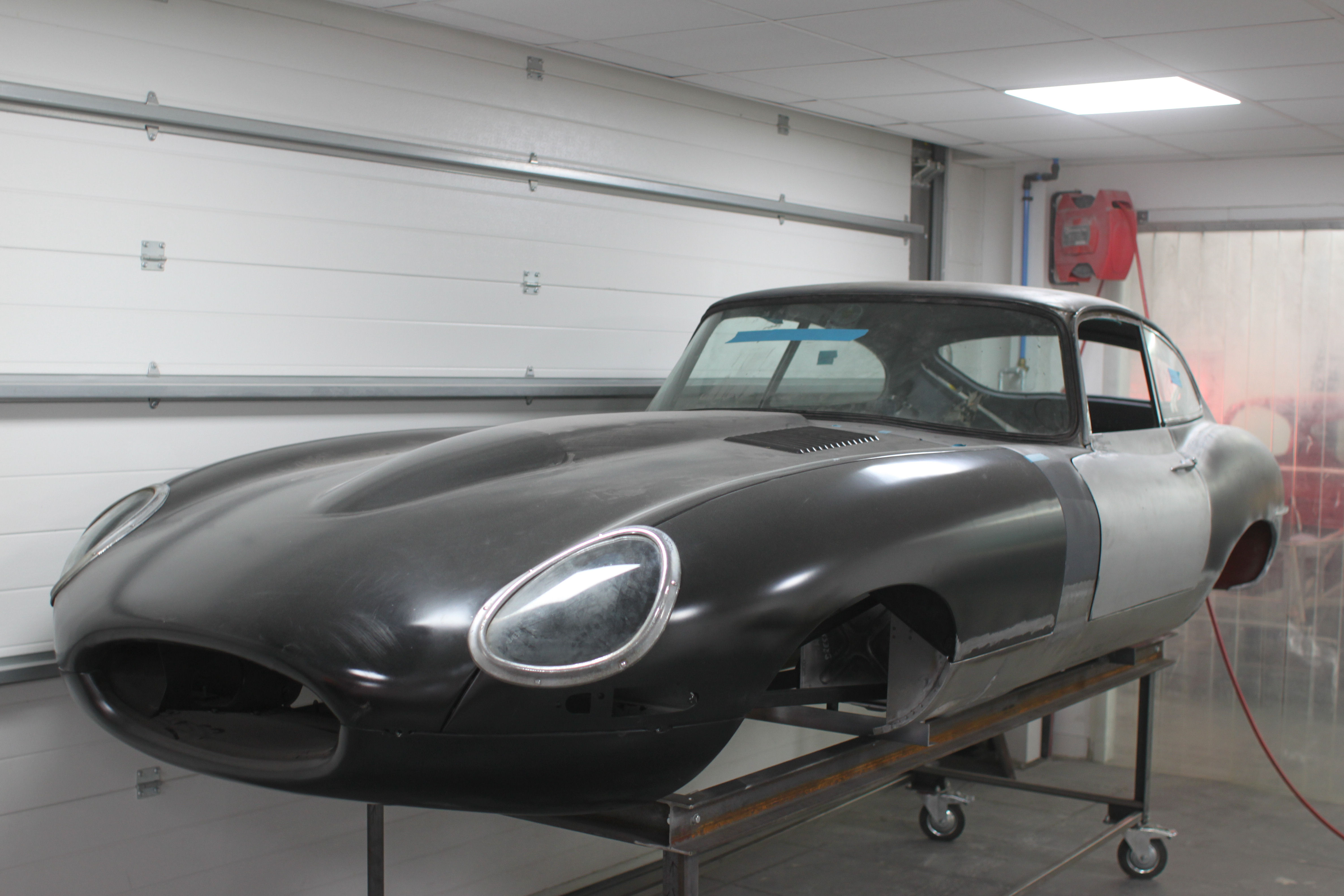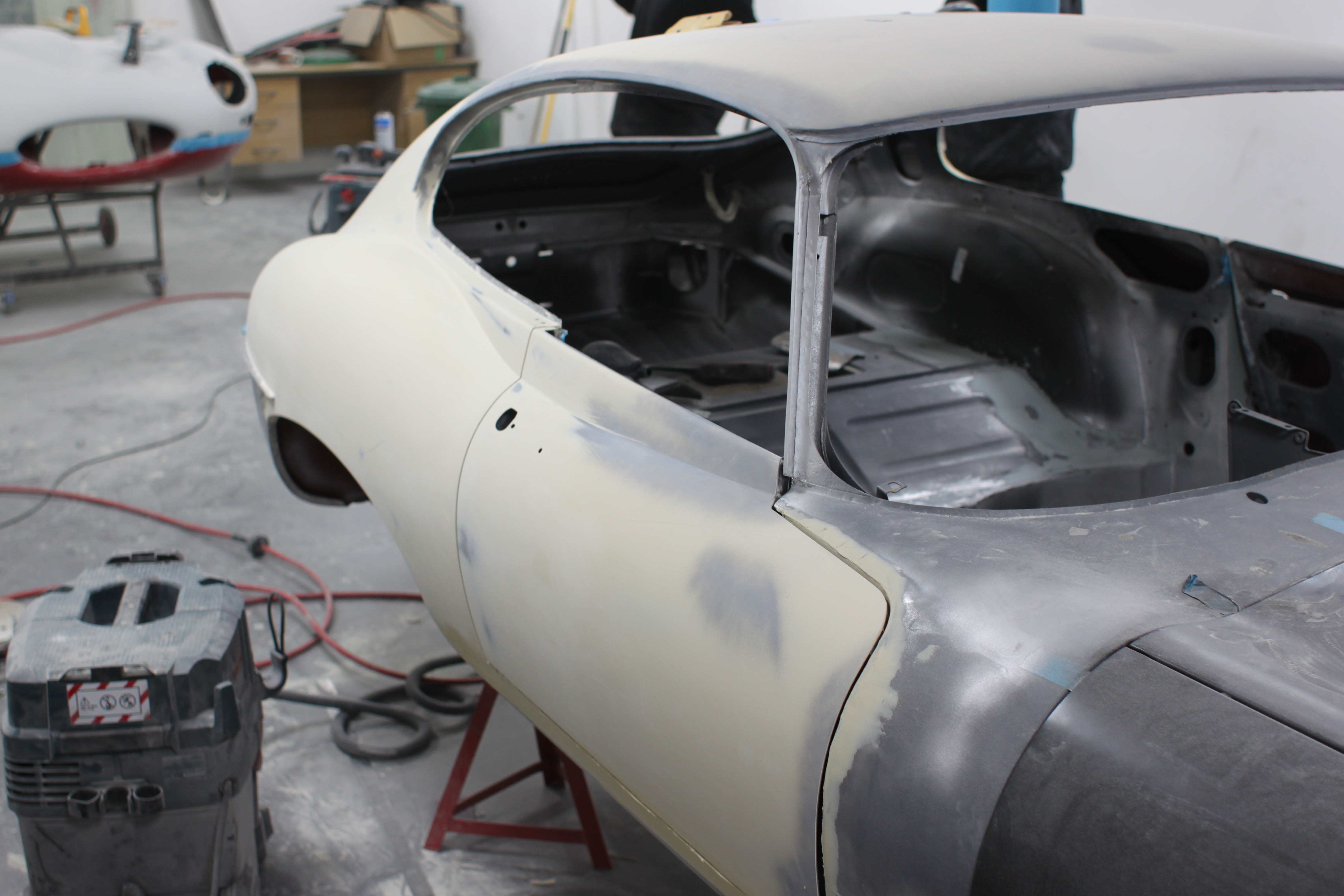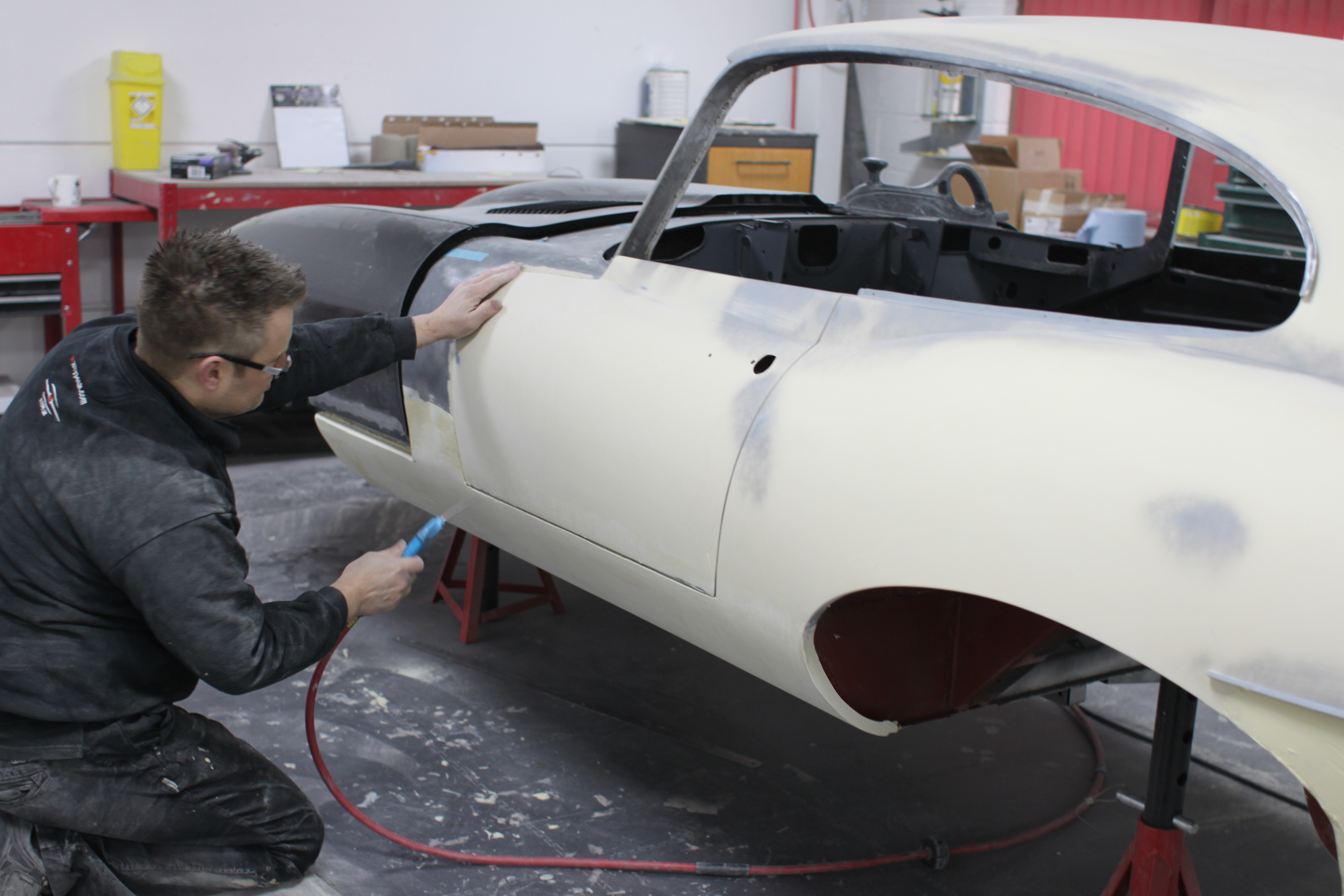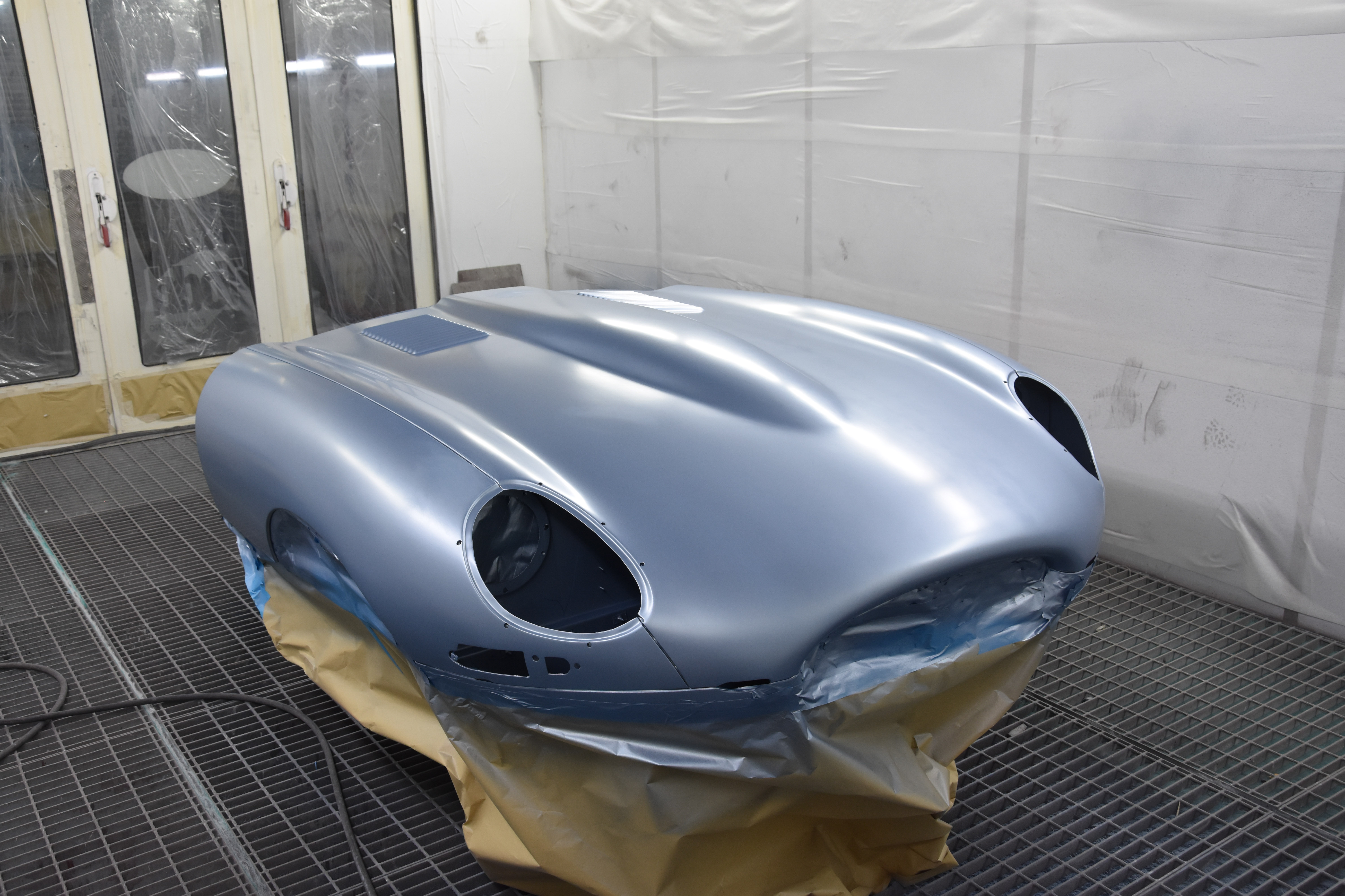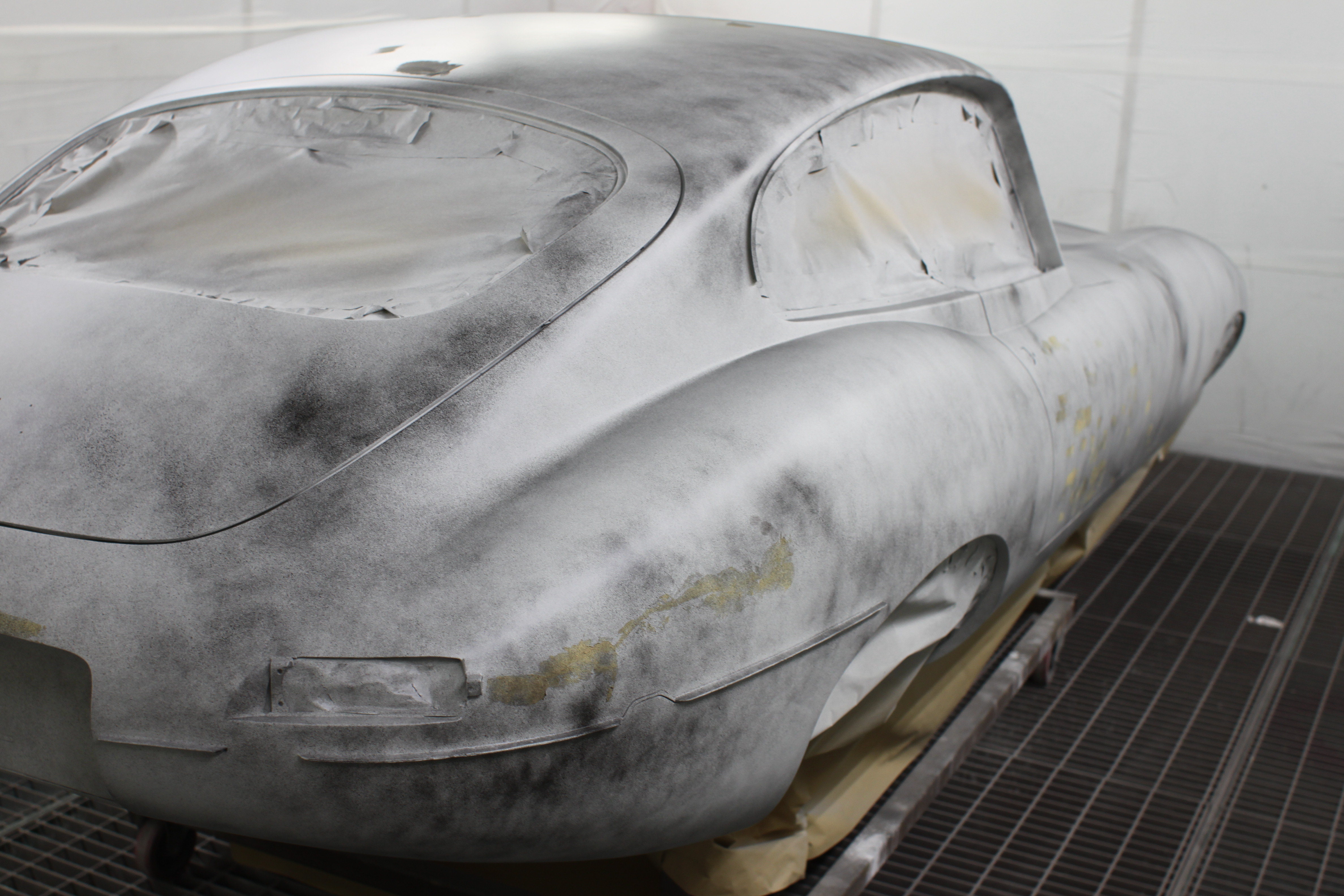 Boasting perfect gaps and lines the E-Type enters our high-performance spray booth to begin one of many primer coats, providing a perfect base for the paint team to work from.