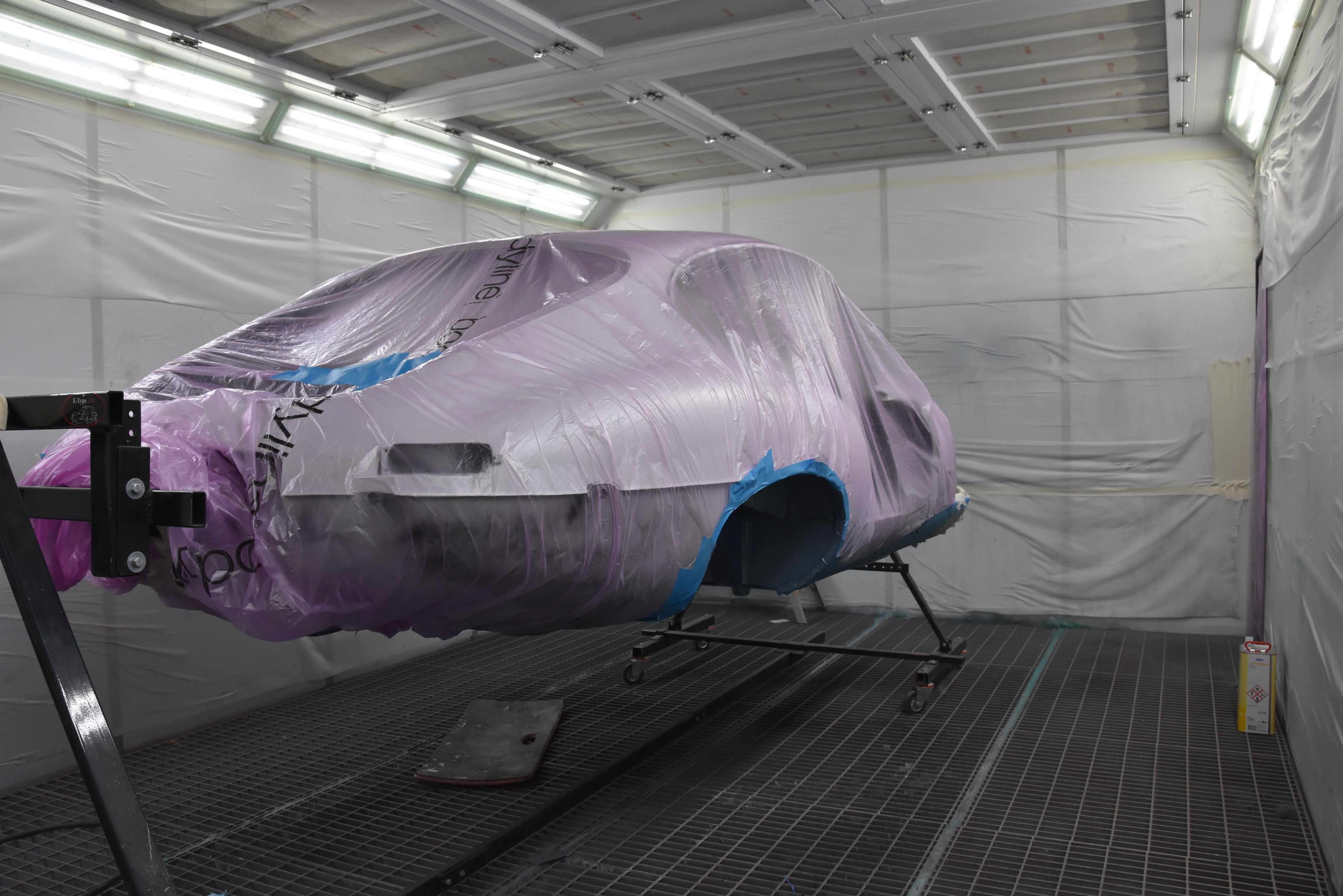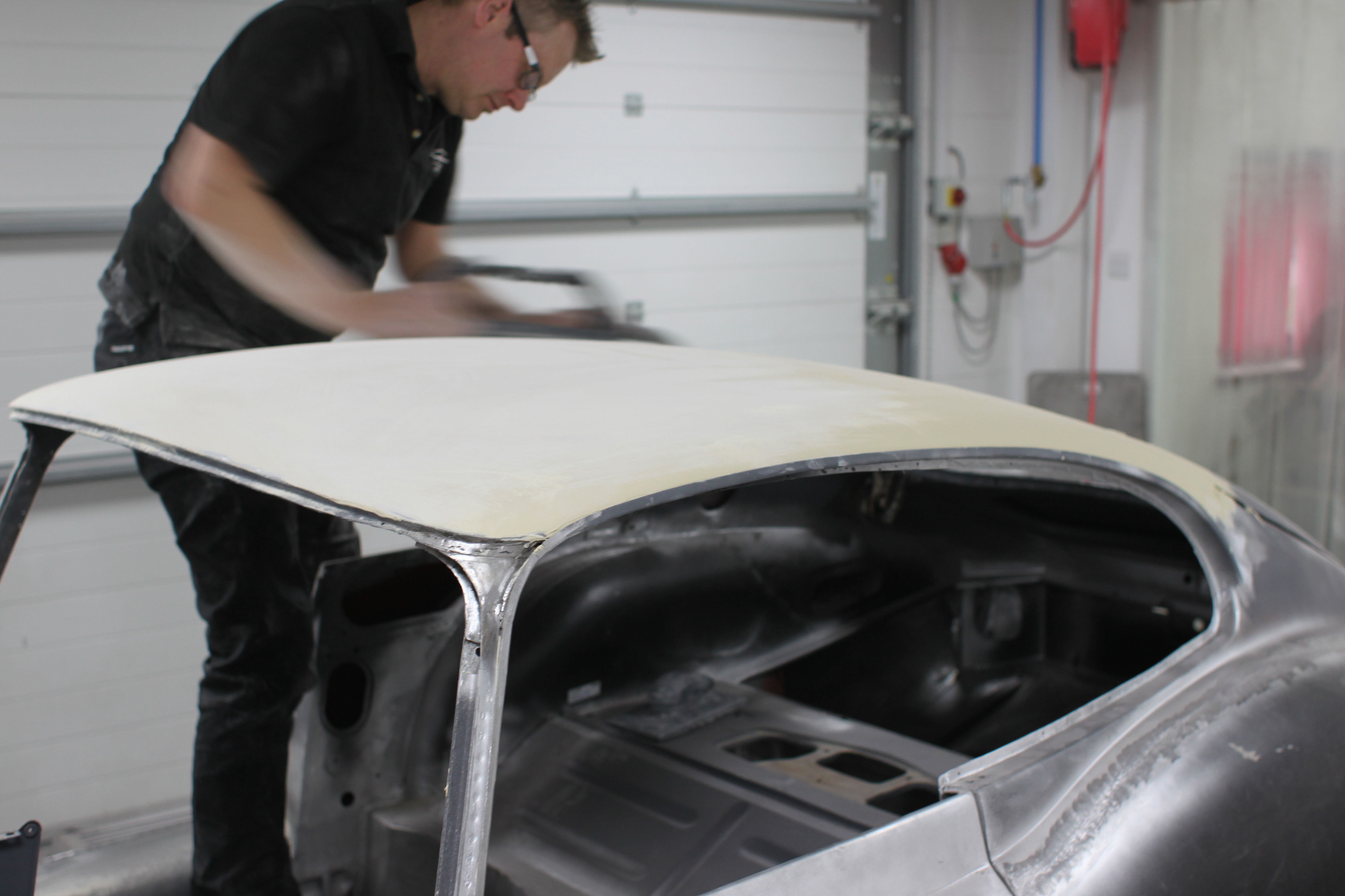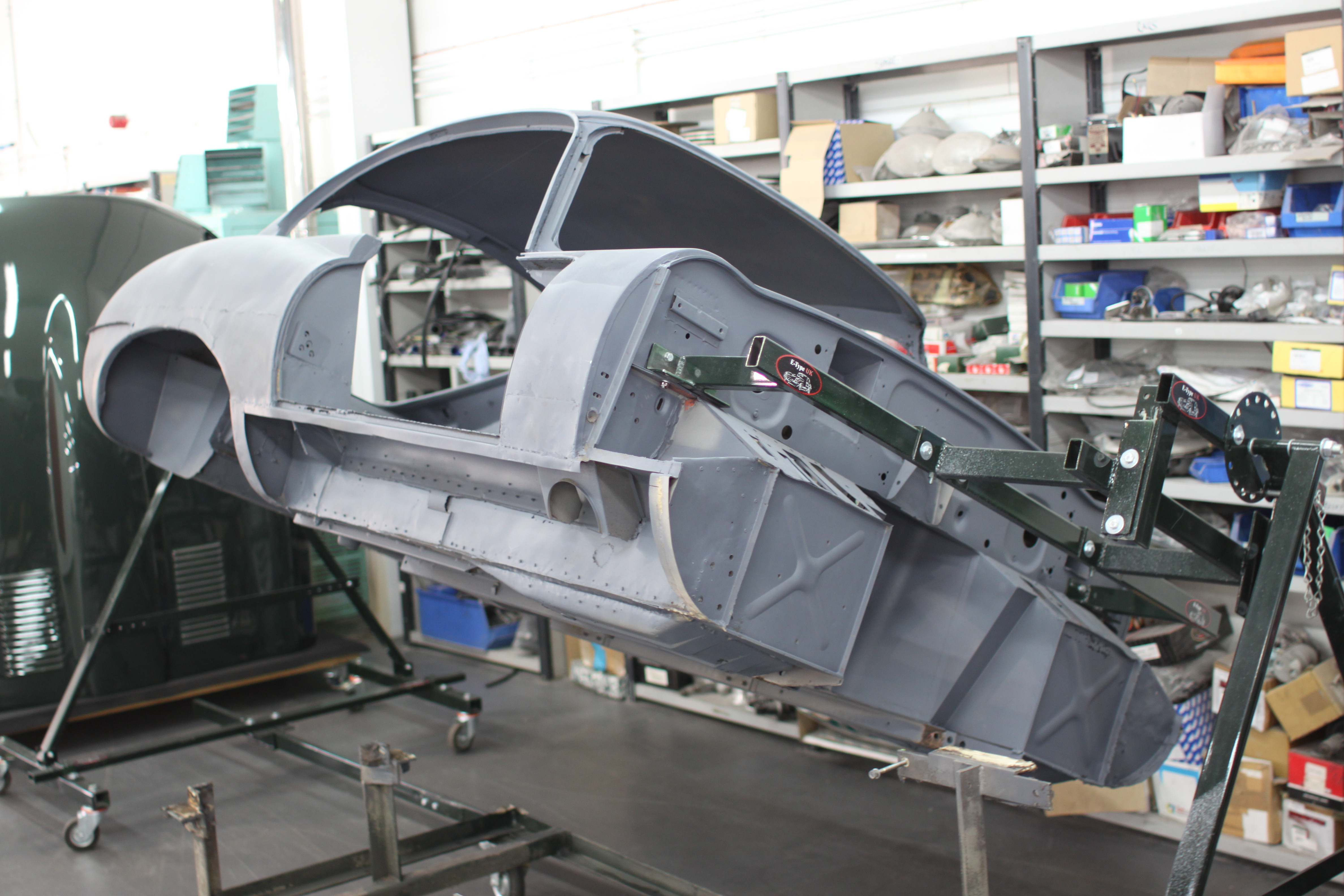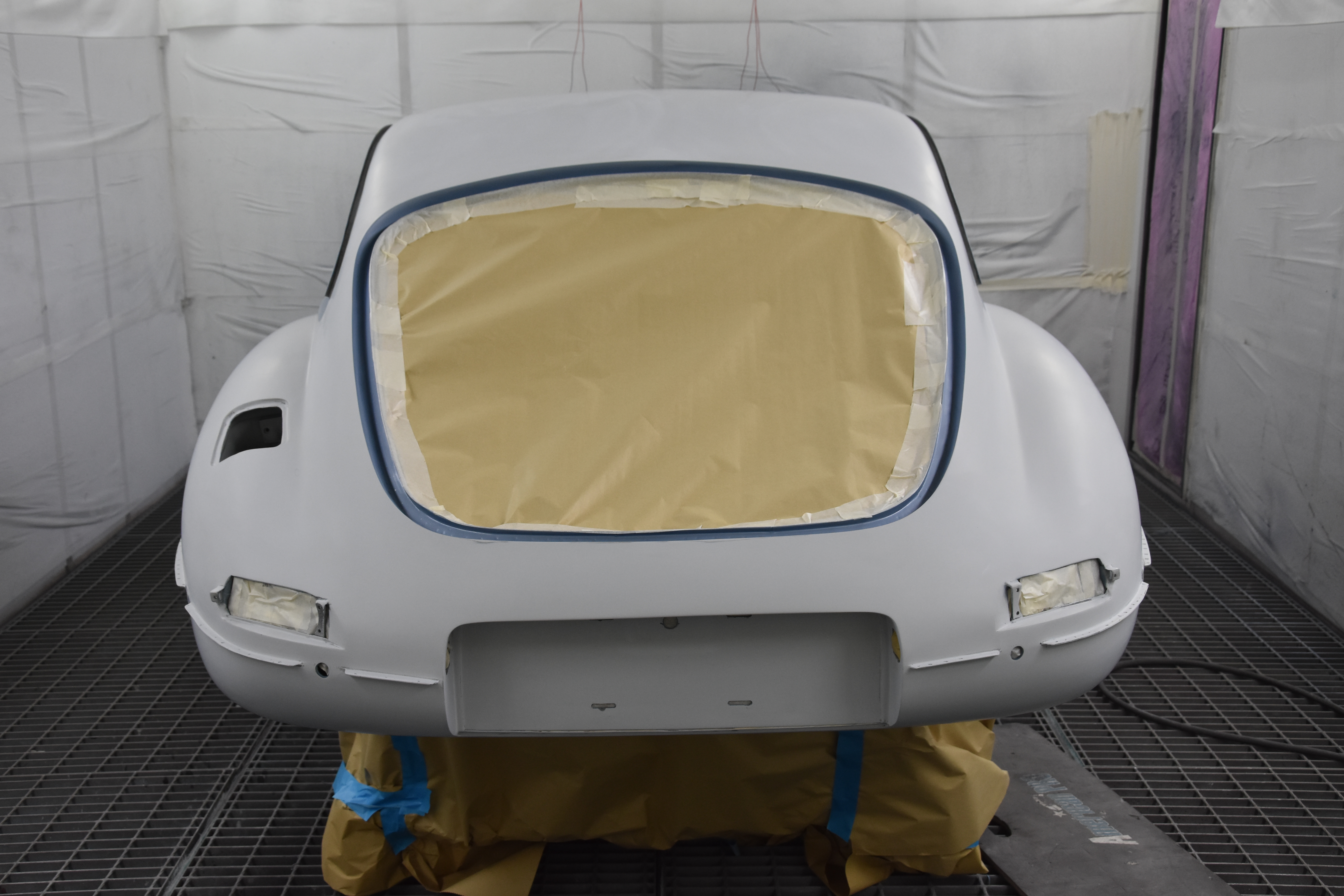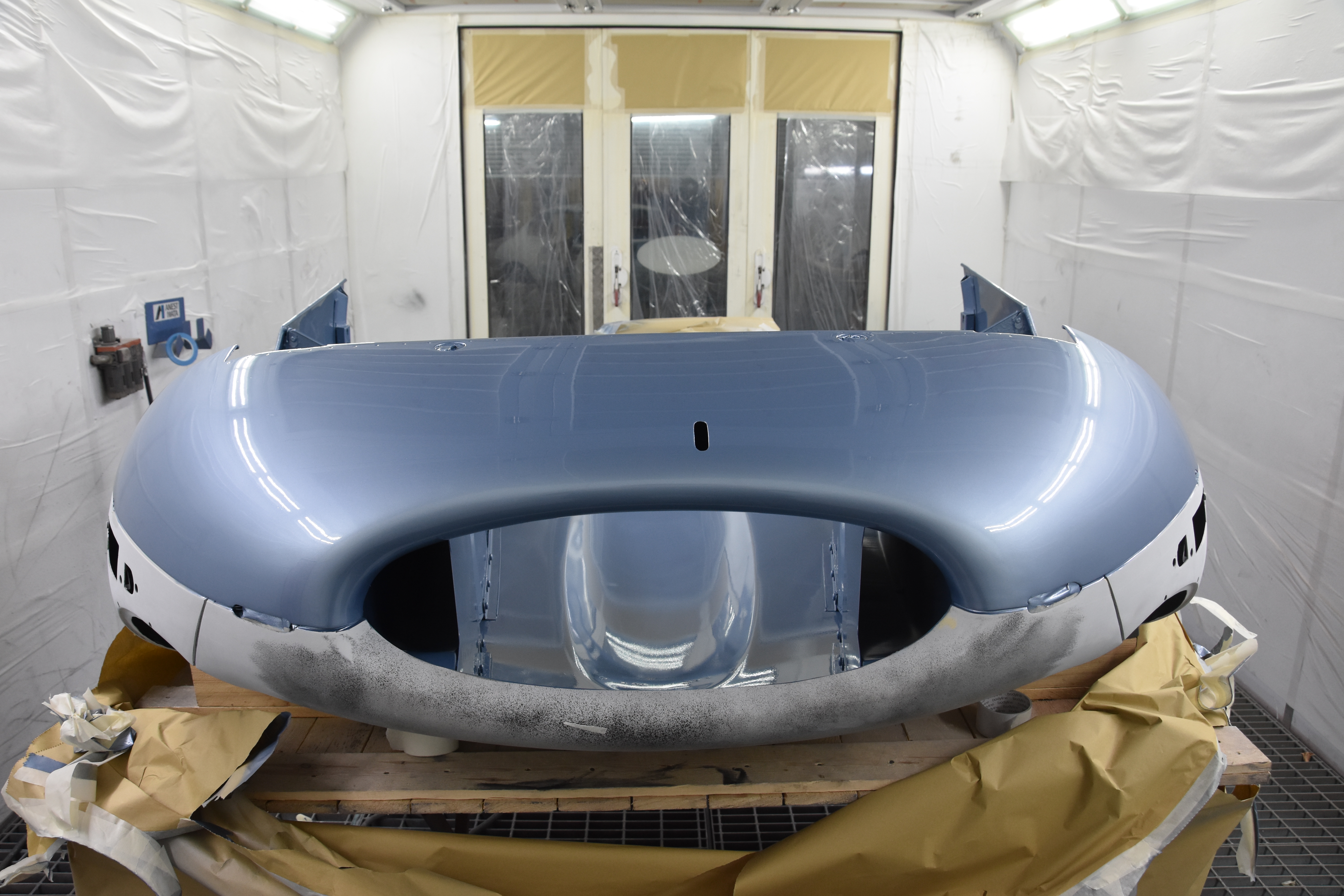 Boasting perfect gaps and lines the E-Type enters our high-performance spray booth to begin one of many primer coats, providing a perfect base for the paint team to work from.
