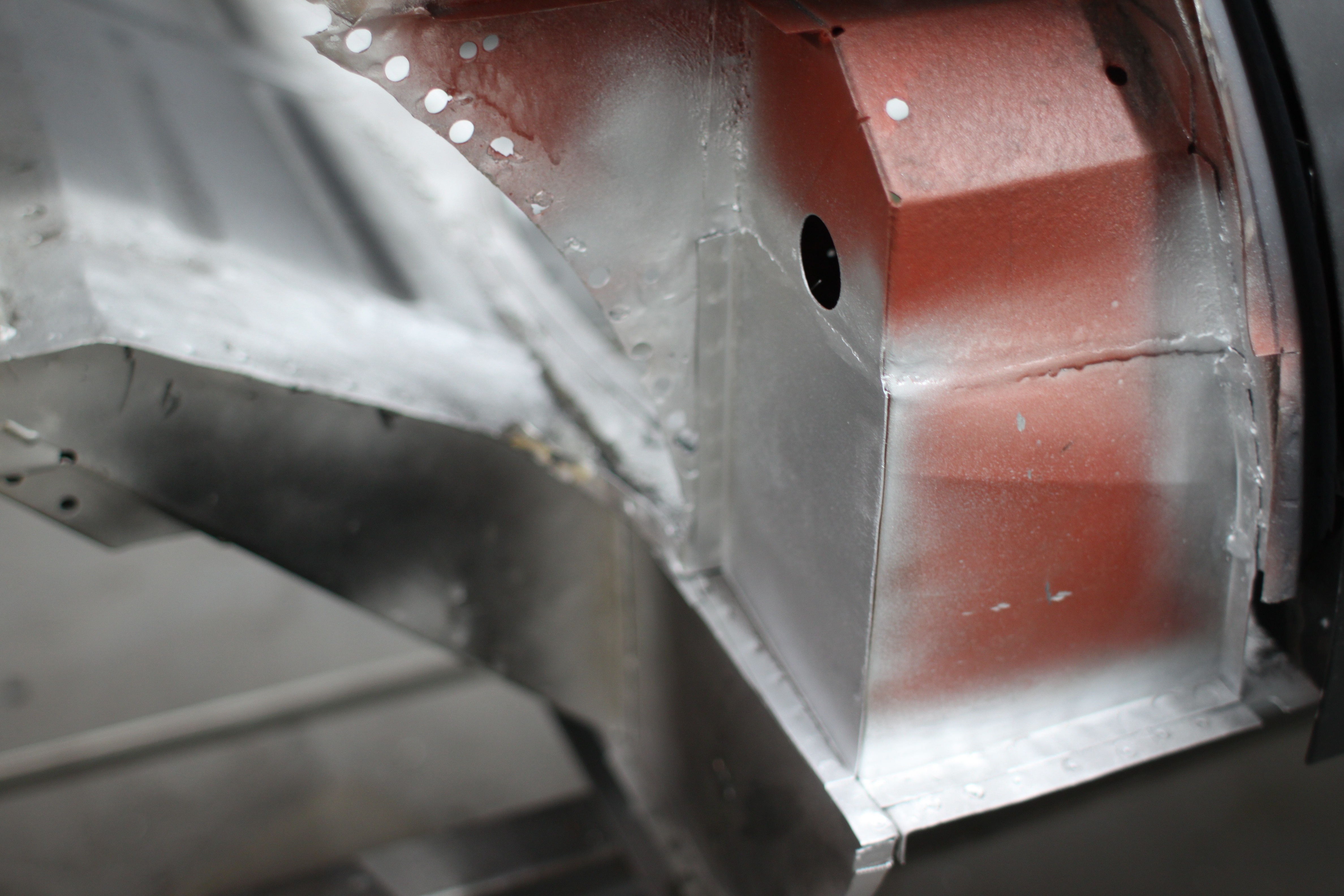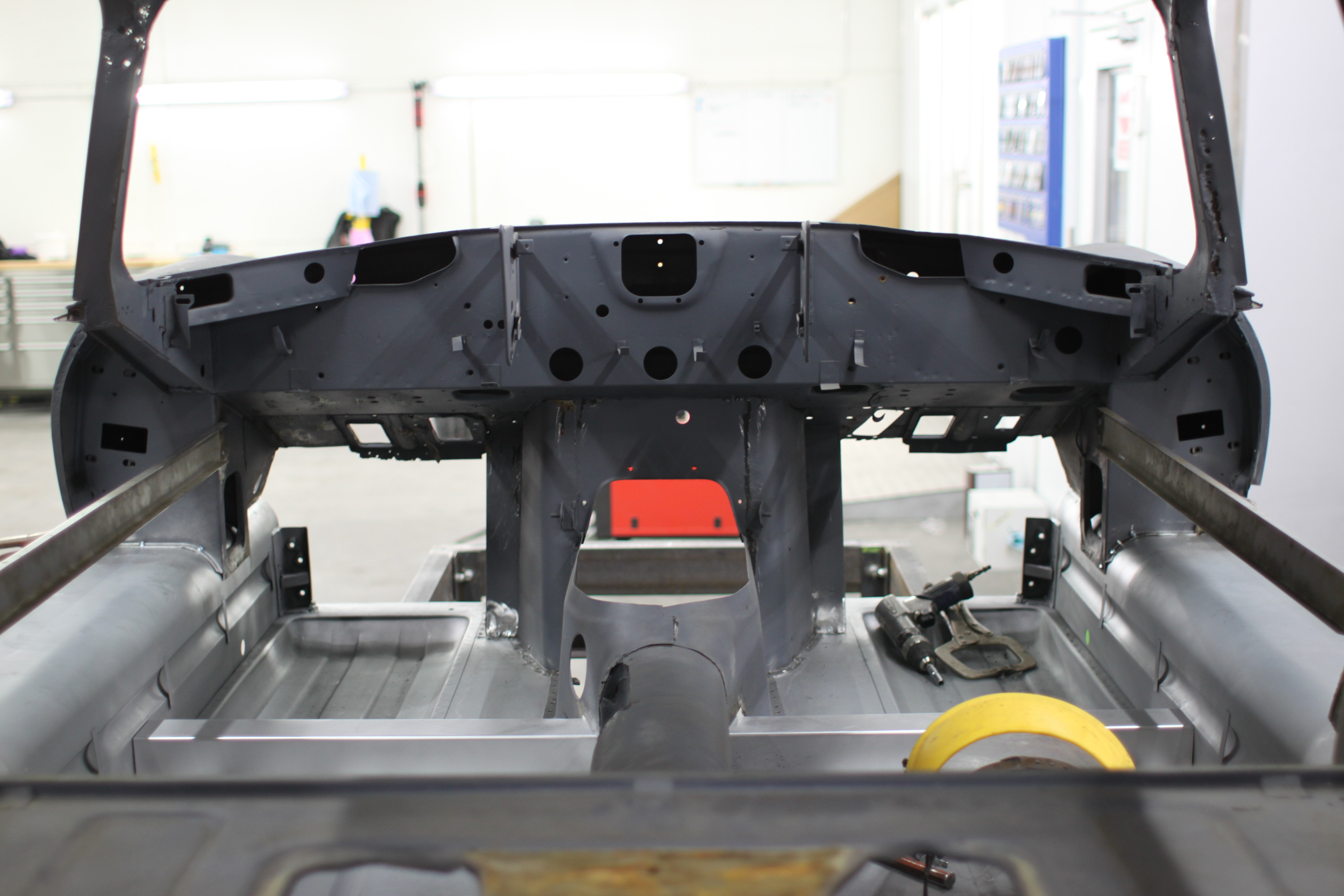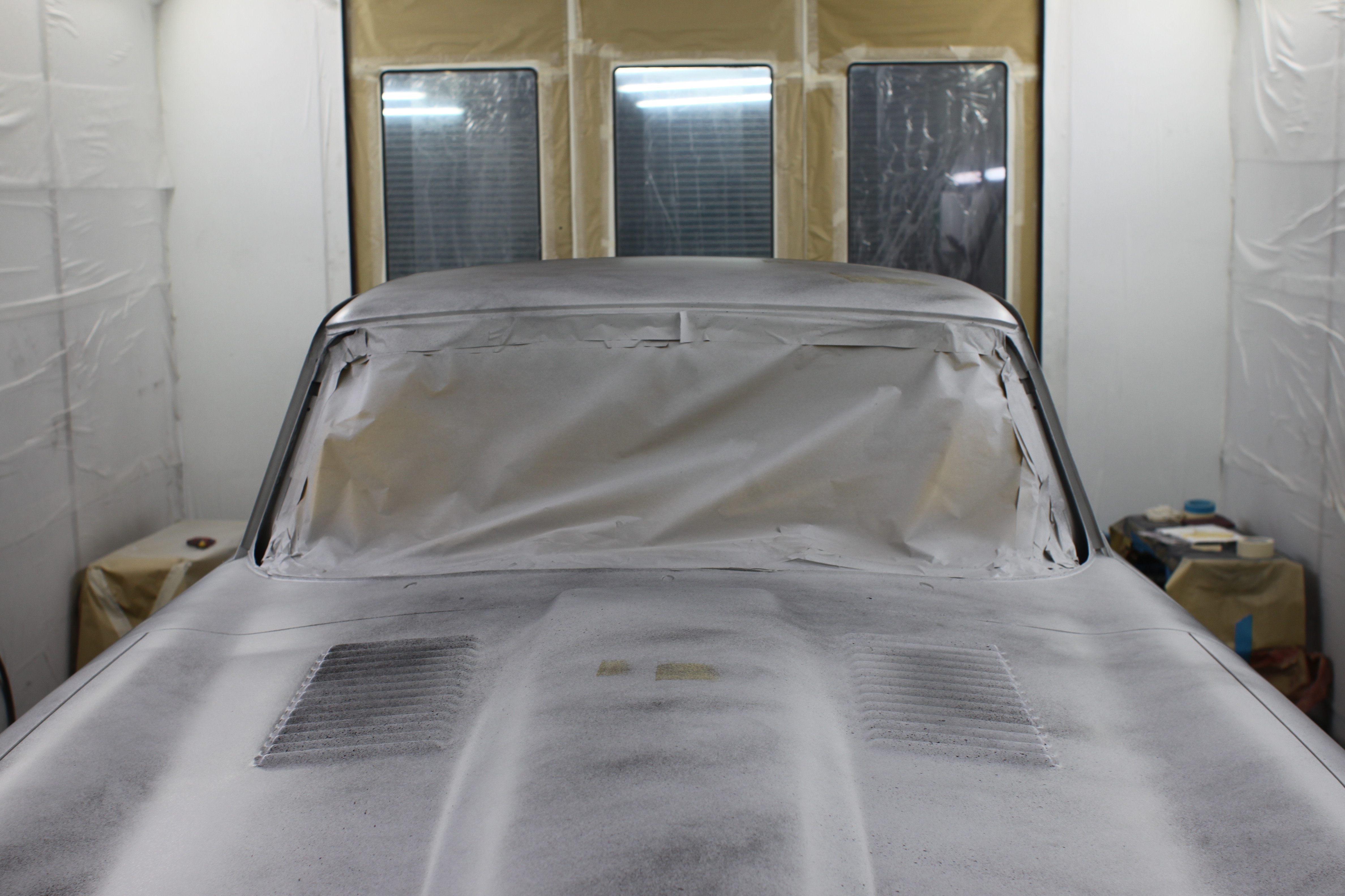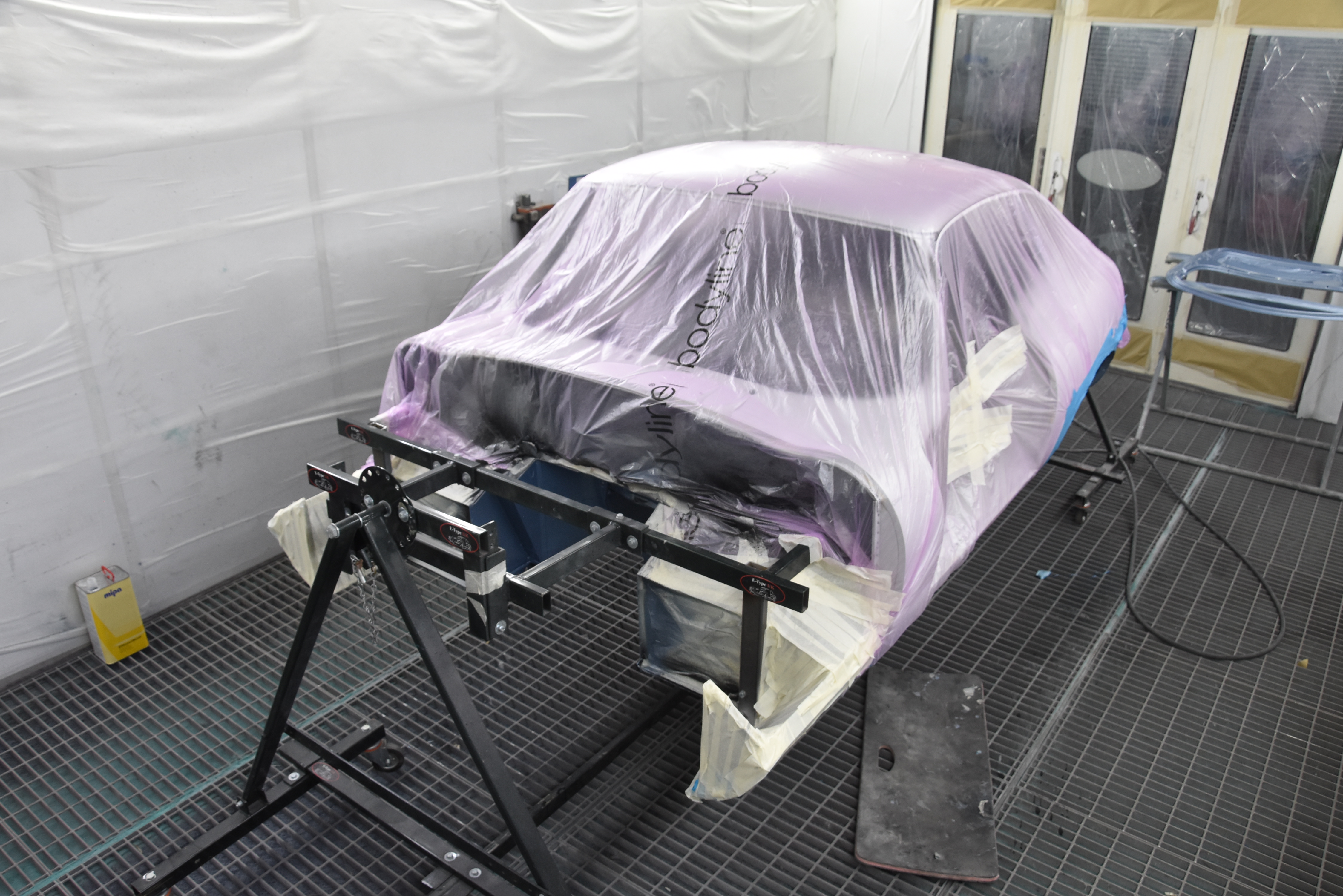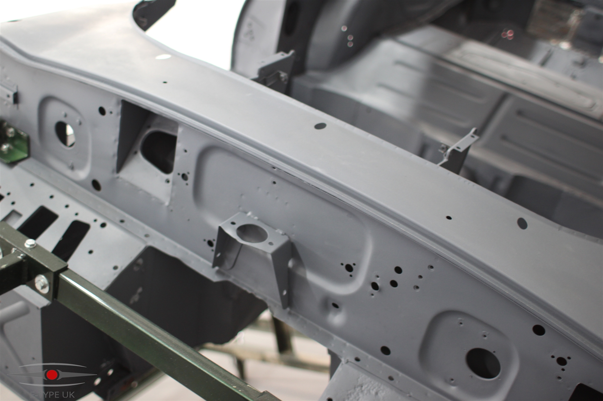 Boasting perfect gaps and lines the E-Type enters our high-performance spray booth to begin one of many primer coats, providing a perfect base for the paint team to work from.