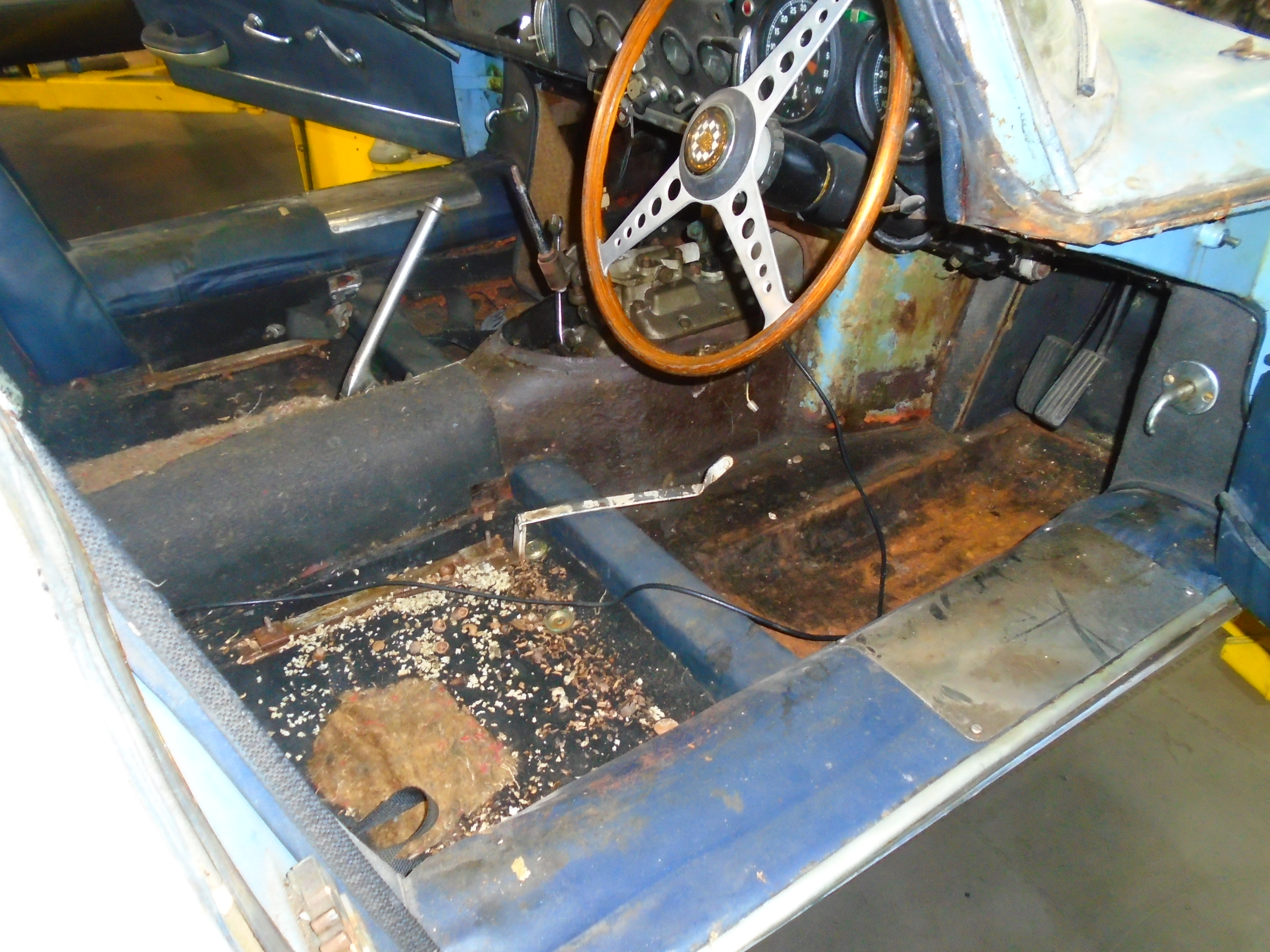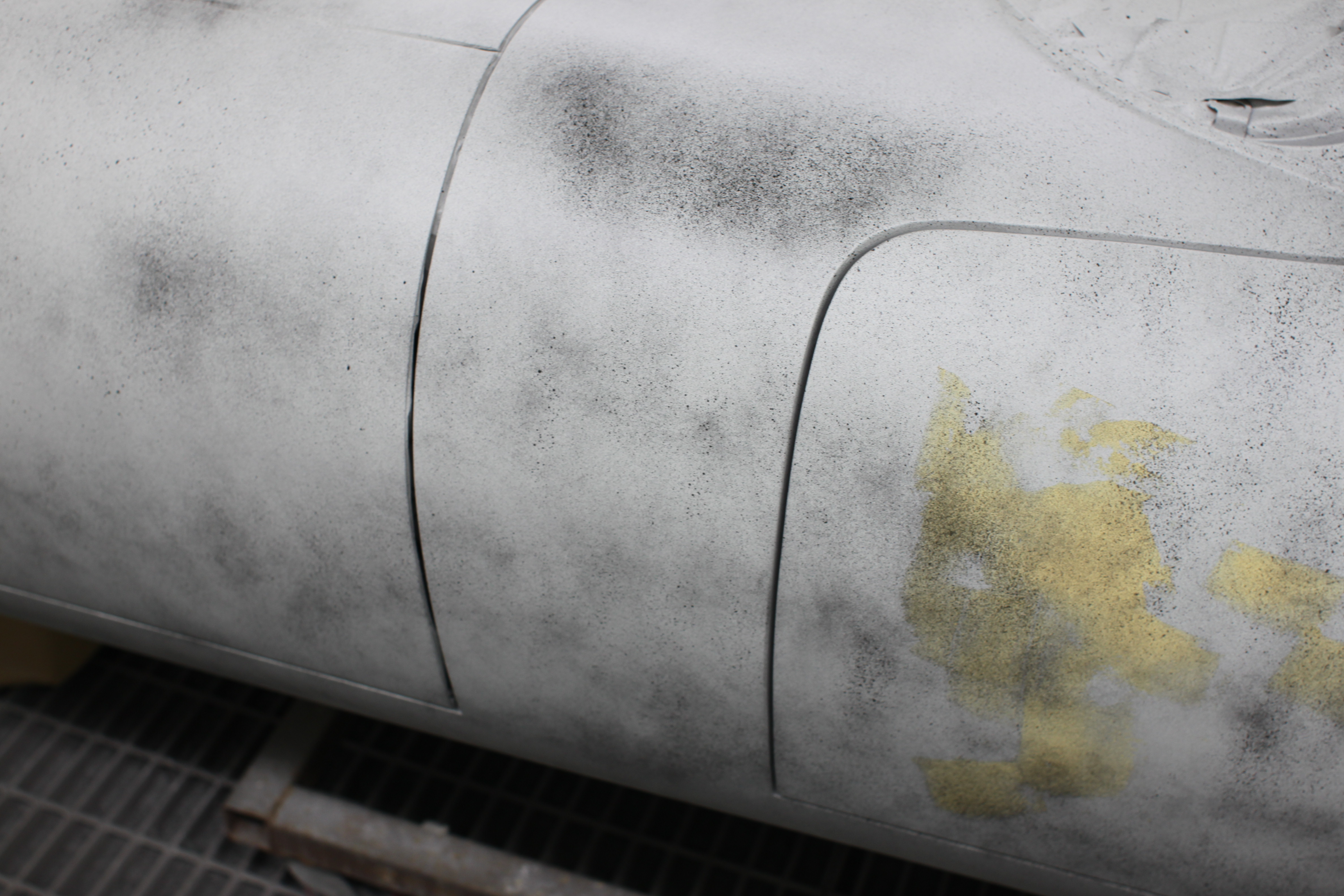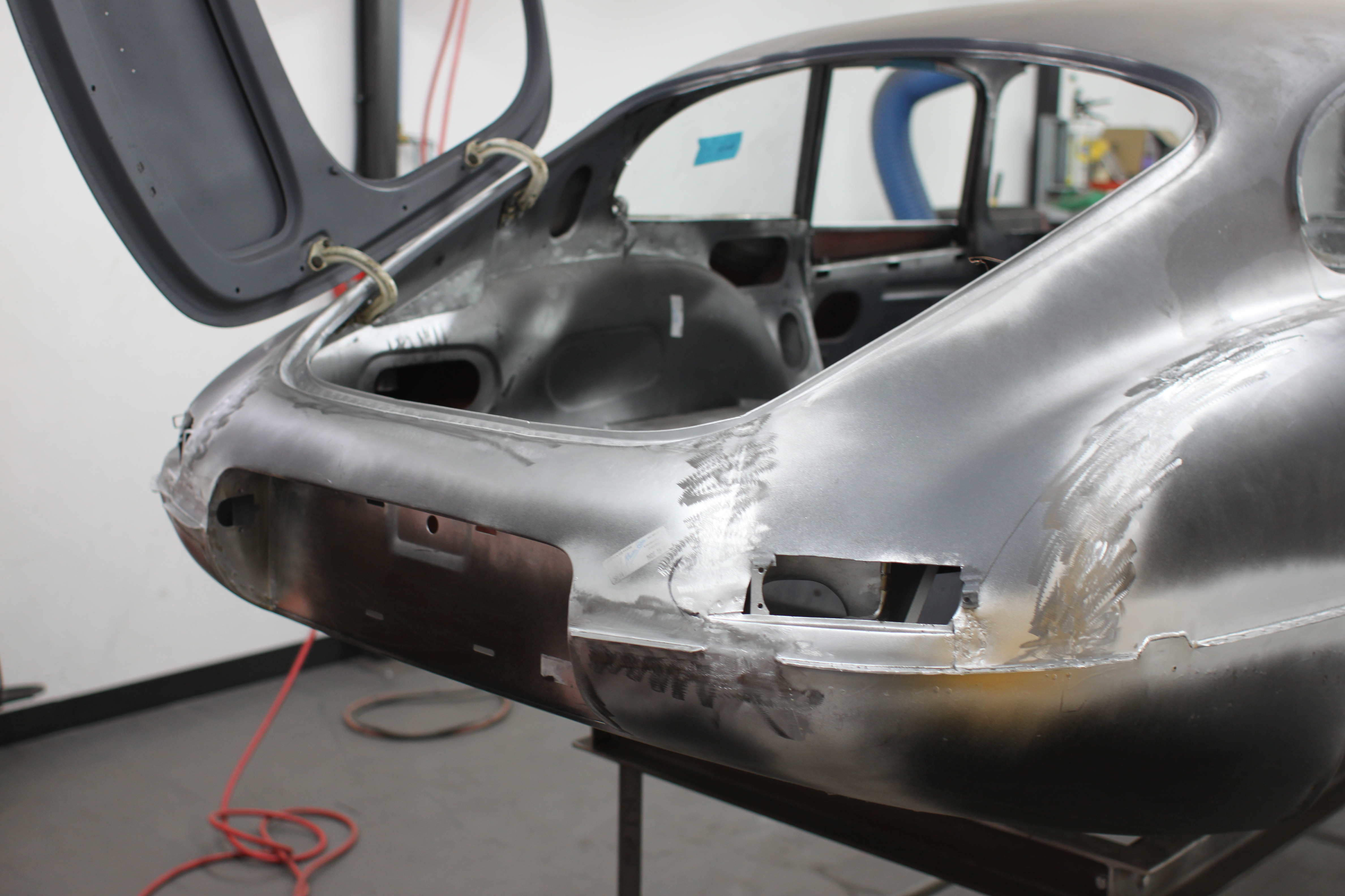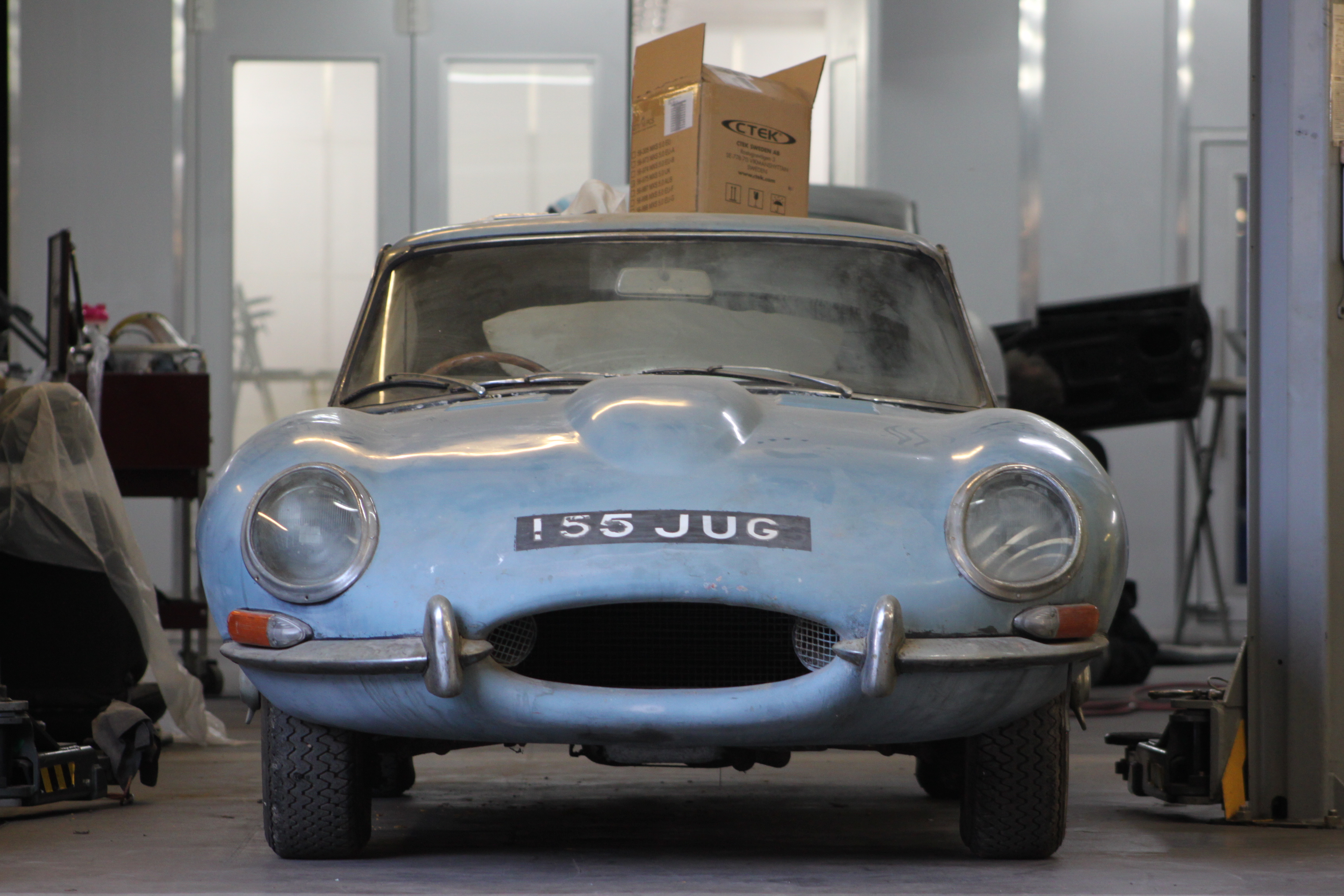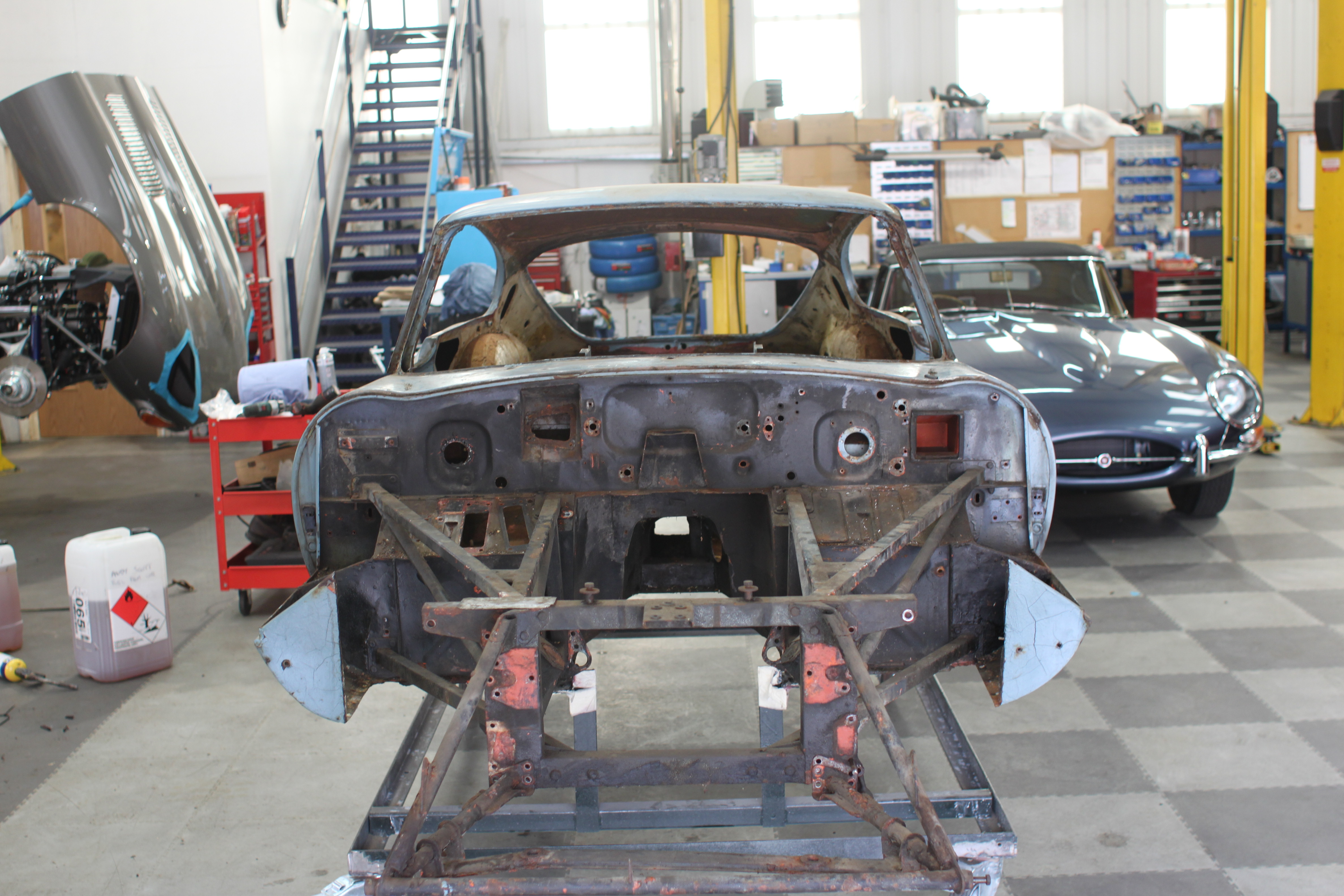 The owner of this E-Type has specified for it to be reverted to its original colours of Opalescent Silver Blue with Dark Blue interior, a very good choice in our eyes! We now await the results of sand-blasting, fingers crossed!