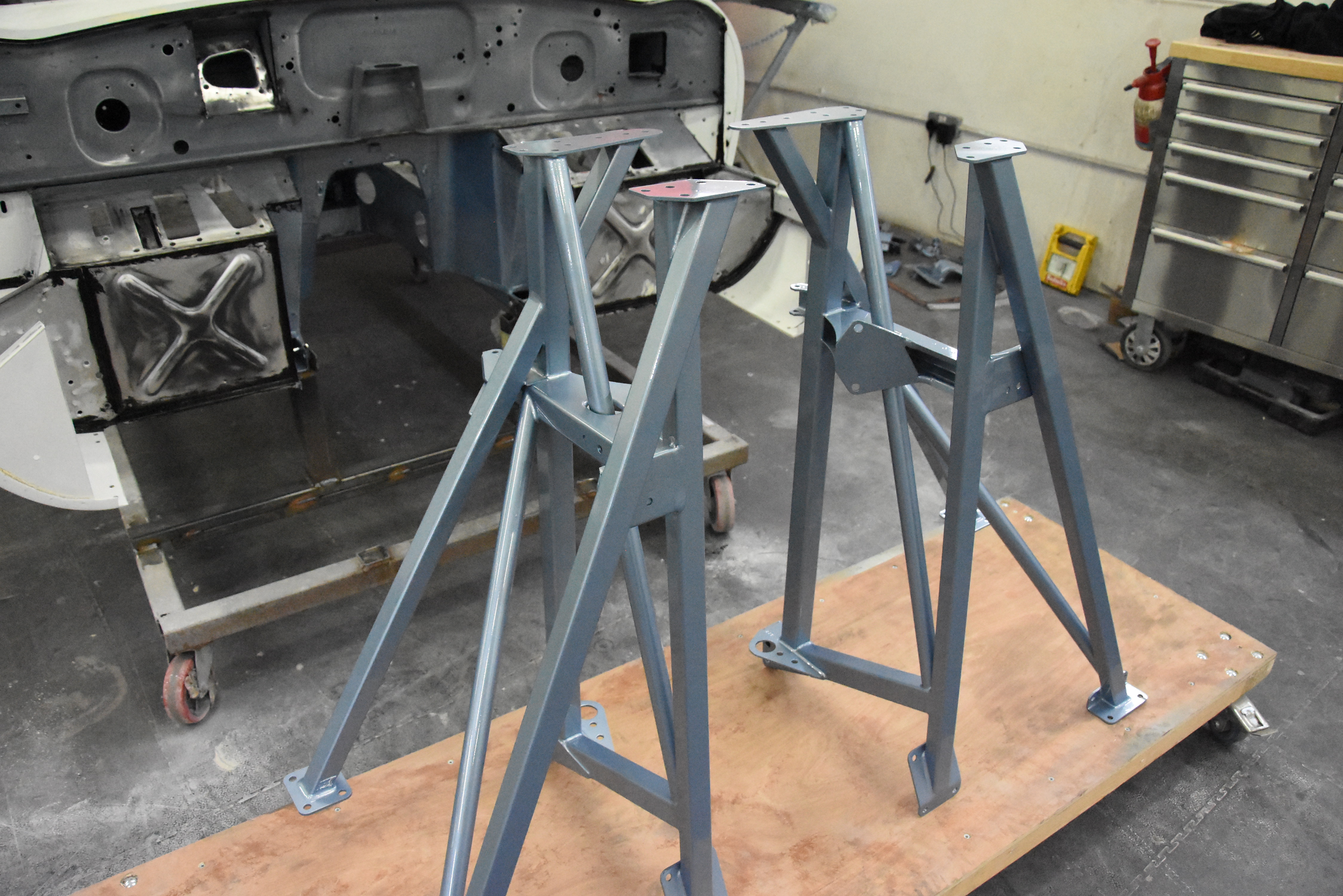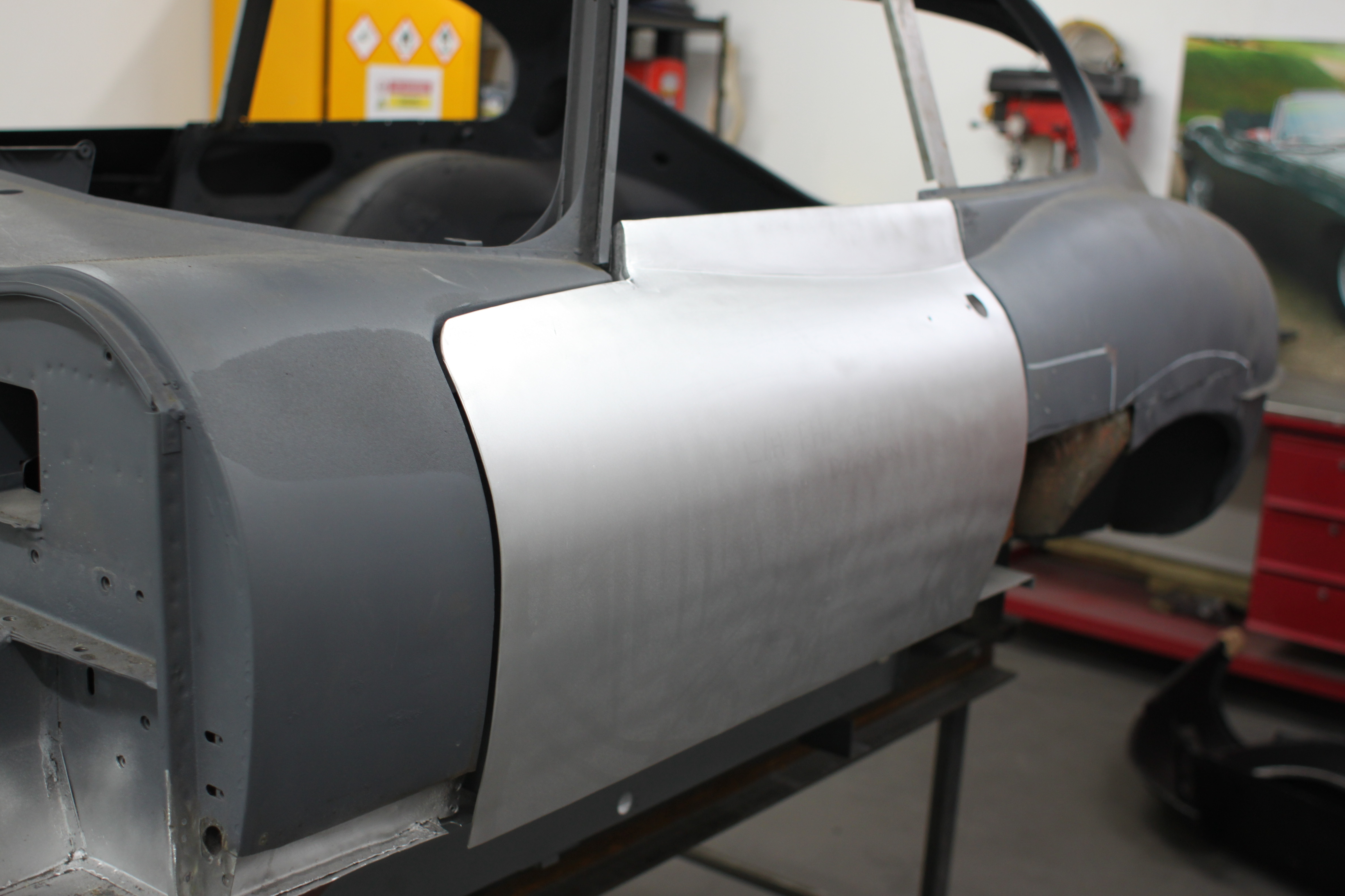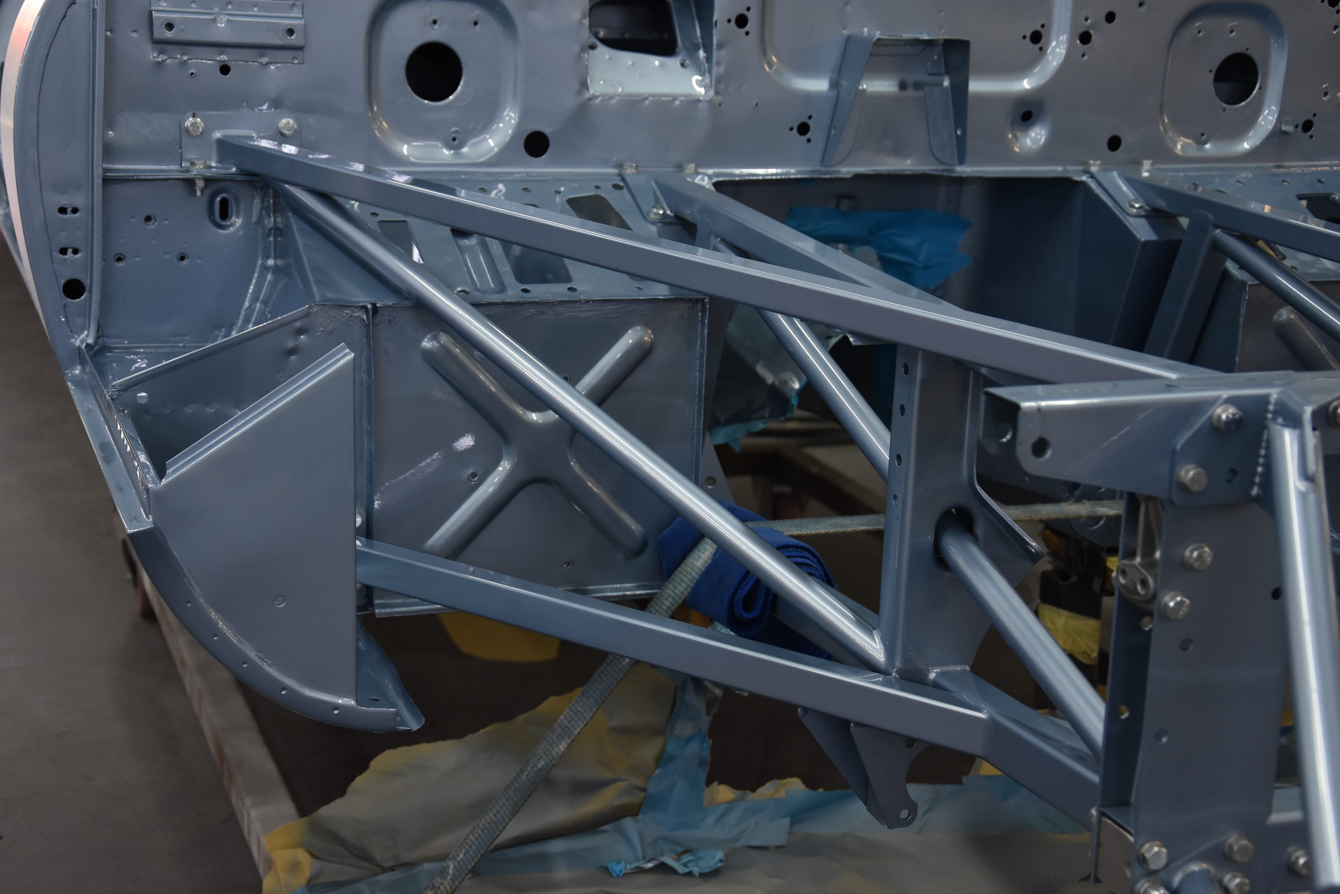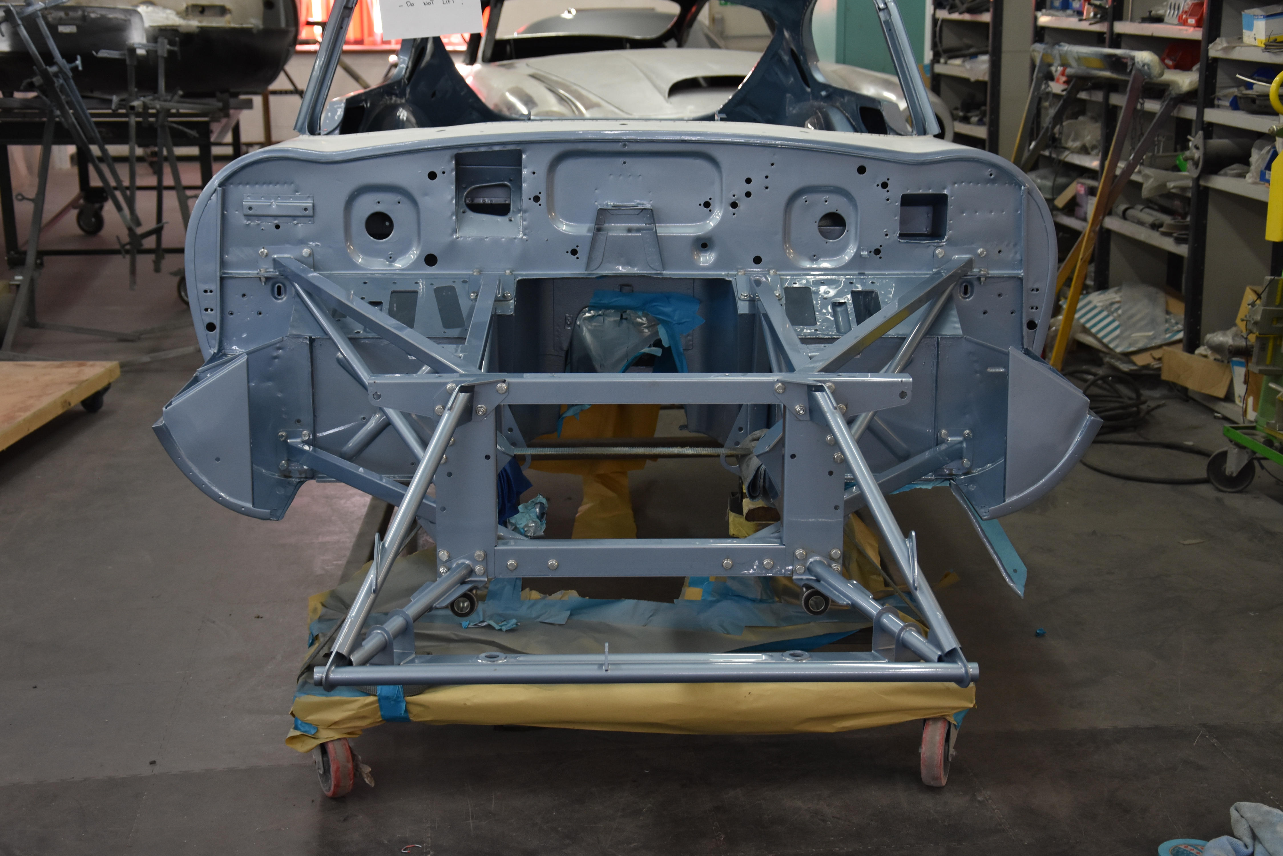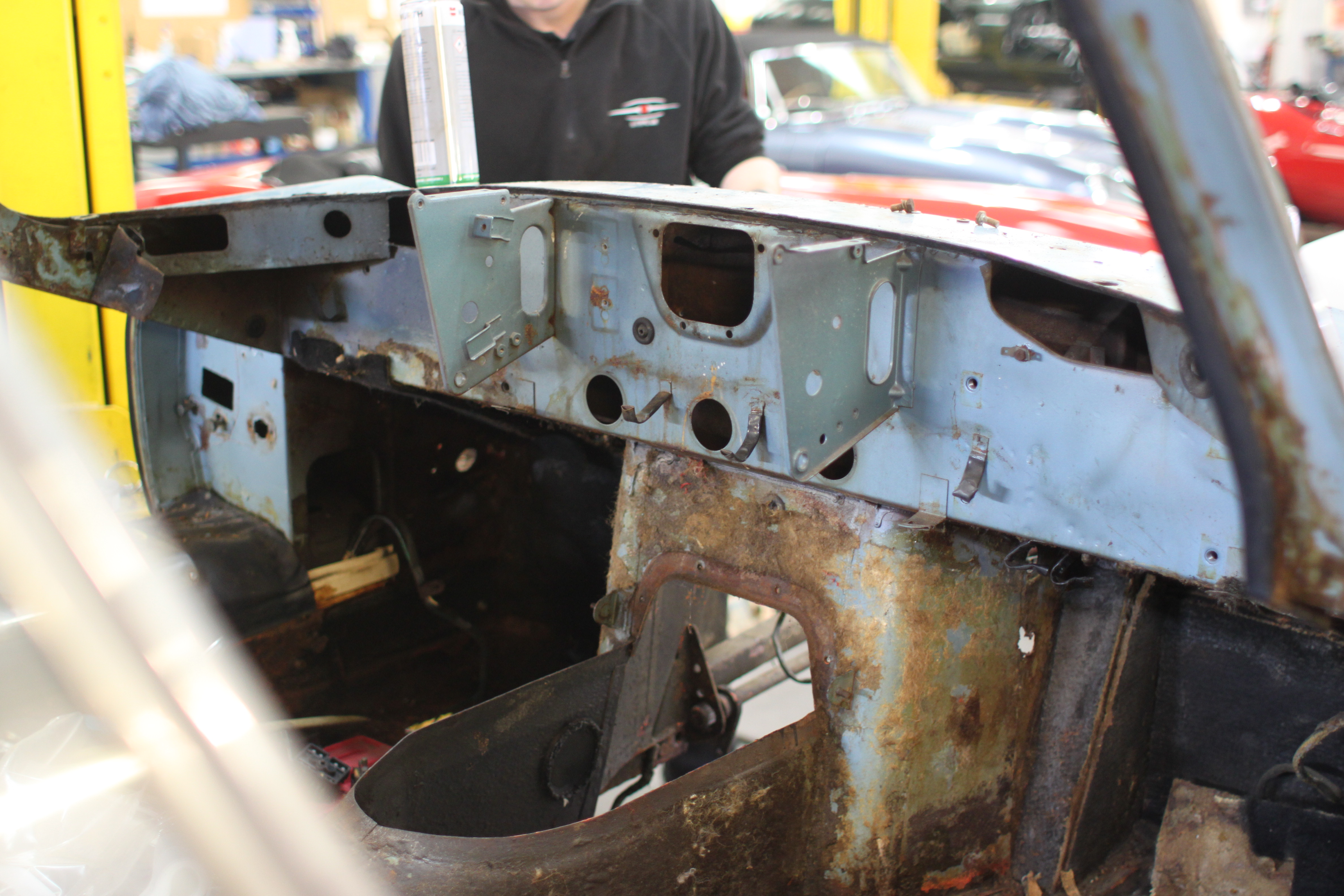 The owner of this E-Type has specified for it to be reverted to its original colours of Opalescent Silver Blue with Dark Blue interior, a very good choice in our eyes! We now await the results of sand-blasting, fingers crossed!