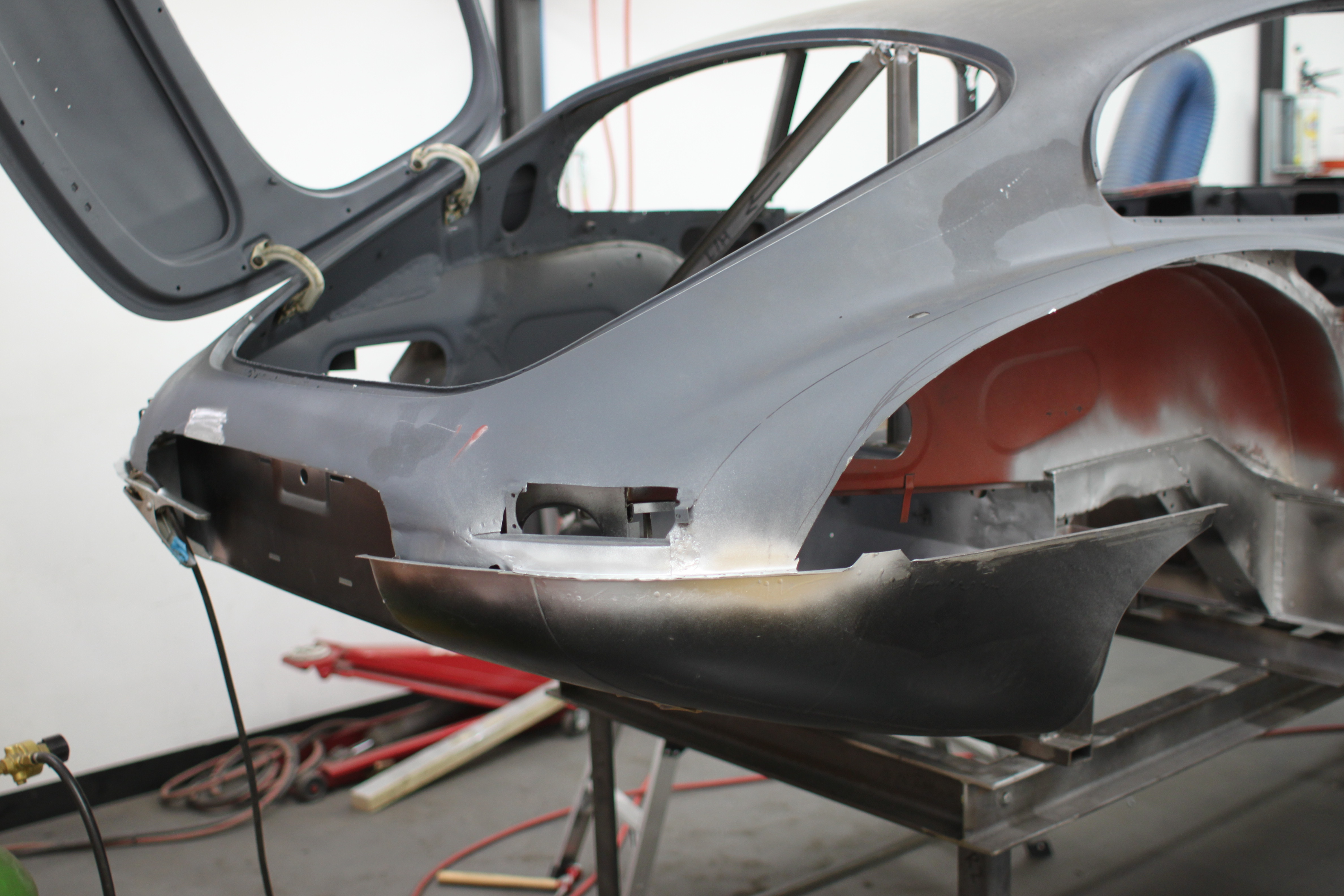 While the car may have been left and forgotten in a barn, the E-type benefited from the luxuries of four walls and a roof, offering a level of coverage from the British weather elements. This resulted in a reduced metalwork process to return the E-type to a strong and safe shell, with the largest job being removing and replacing the floor sections and inner and outer sills.