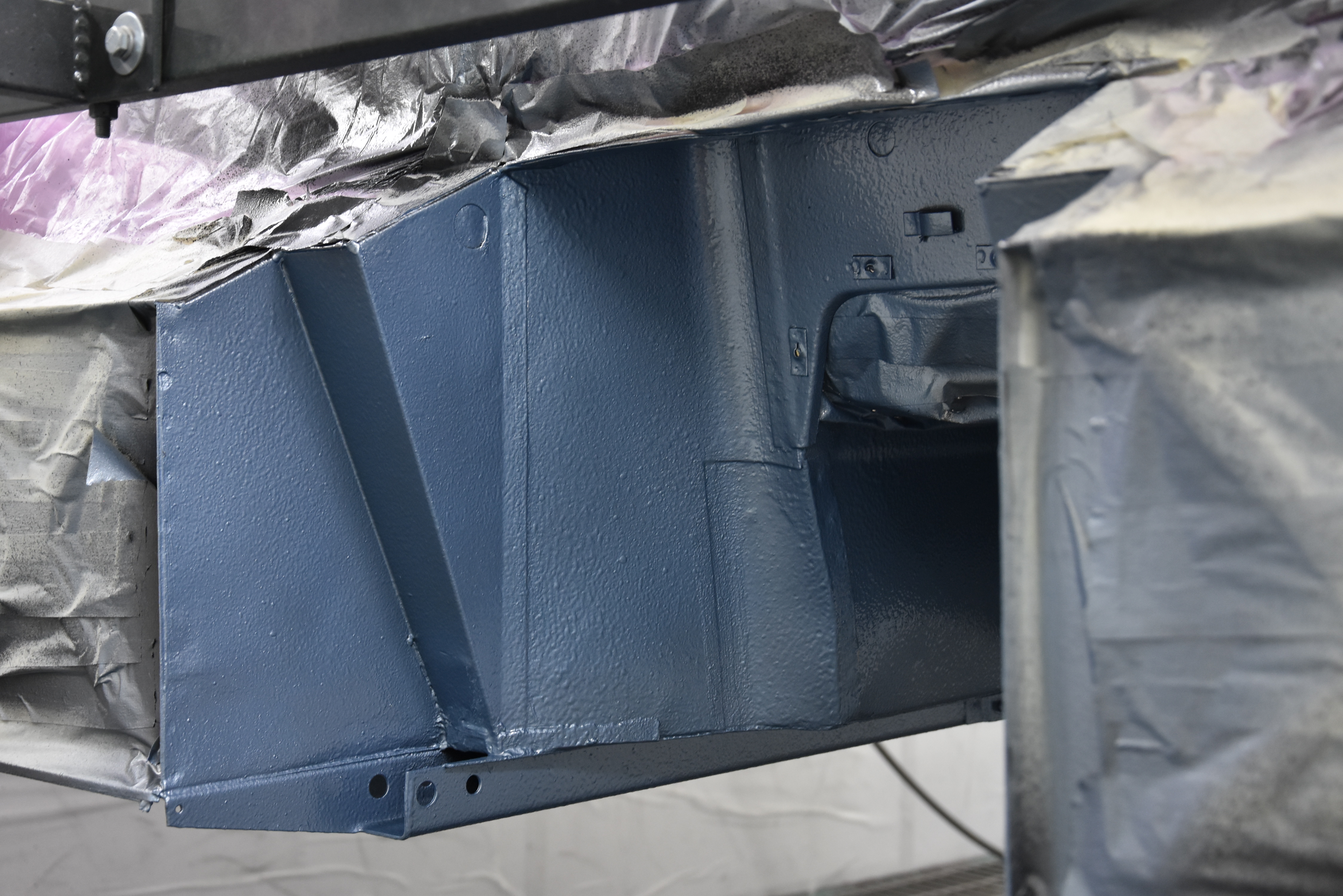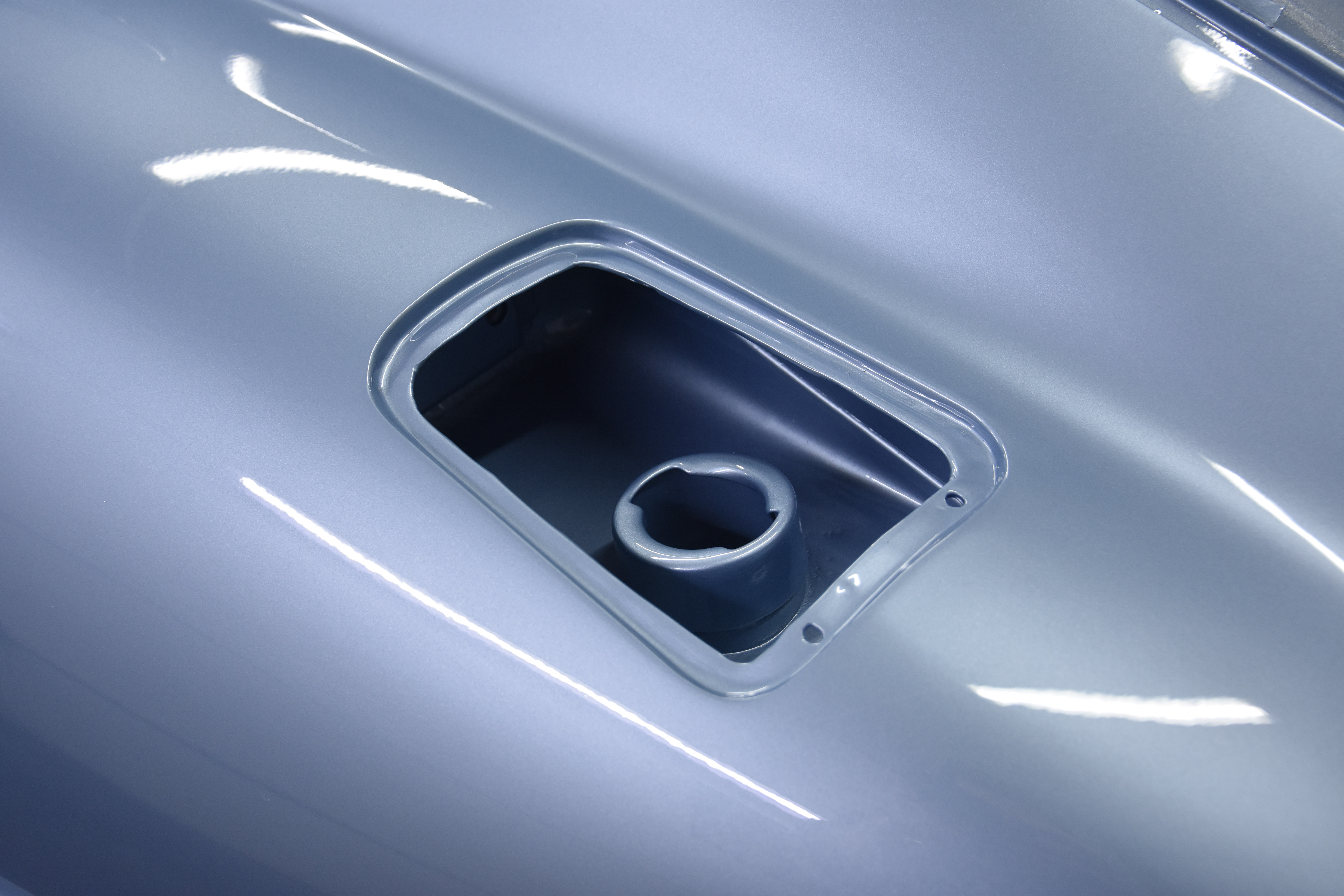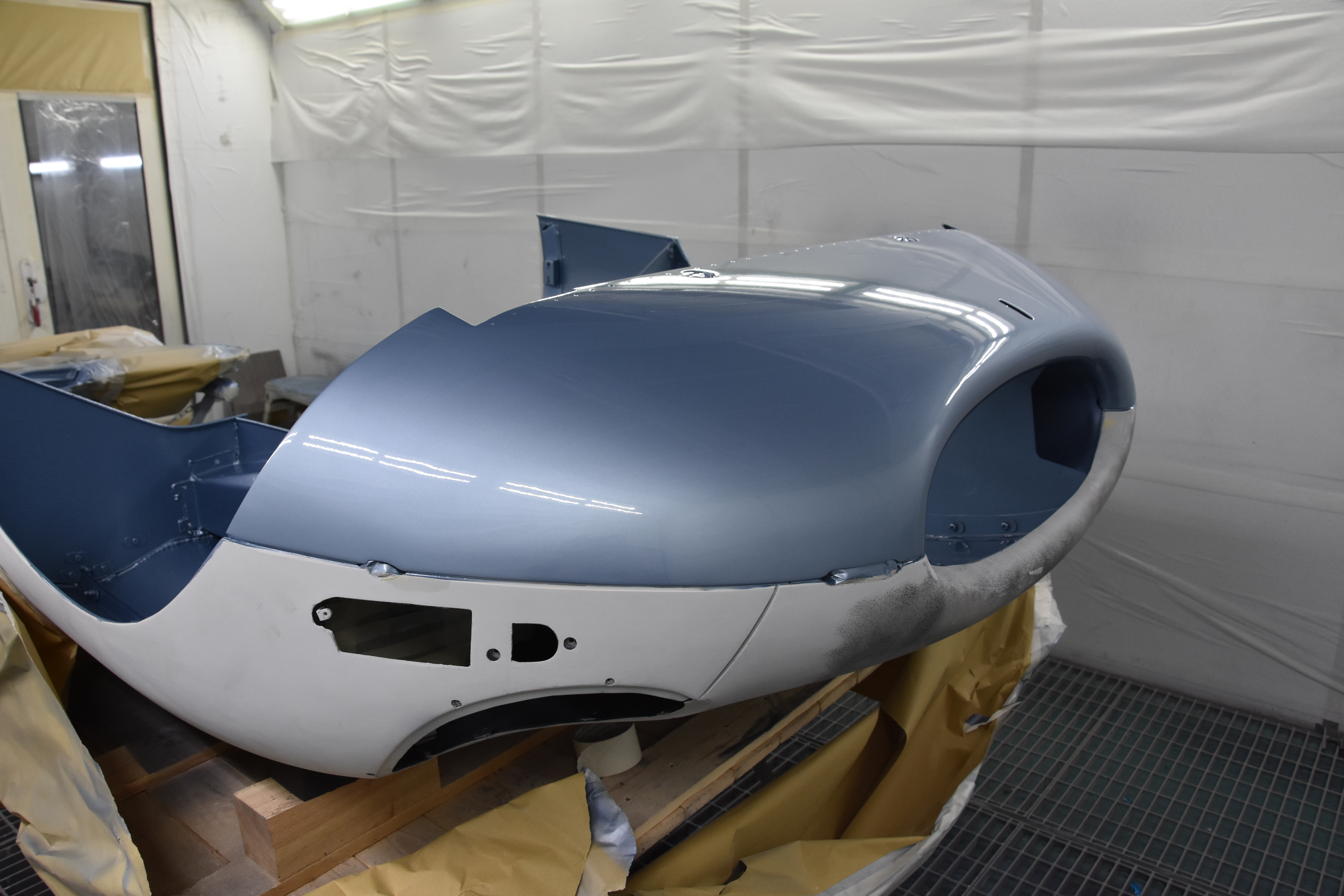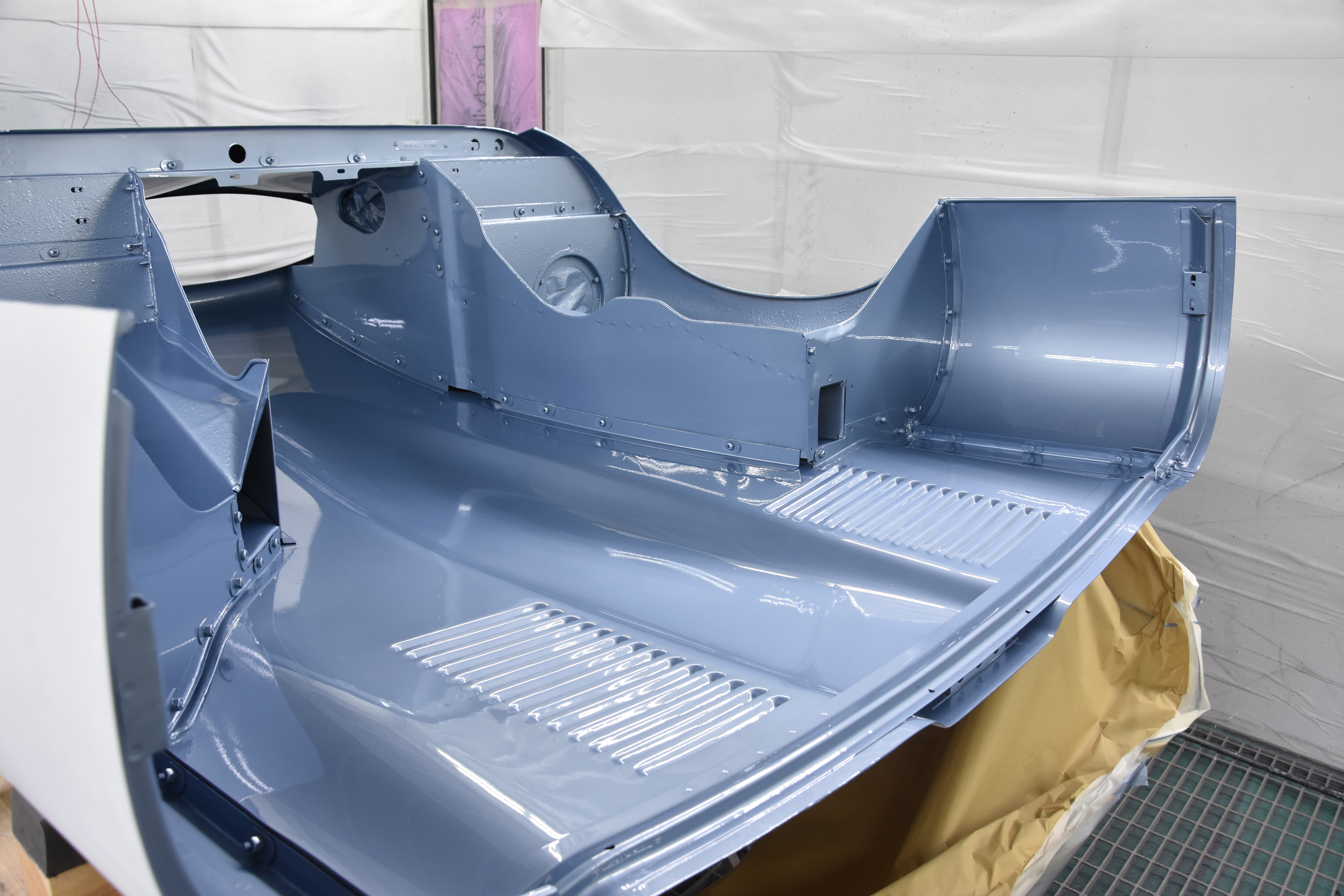 With it decided the Series 1 would be finished in an original Jaguar colour combo, Opalescent Silver Blue, the one thing is the utmost importance, preparation. While this step is important to any paint job, providing a perfect Opalescent Silver Blue finish can be difficult when rushed. Due to the silver pigments in the paint, any imperfections are highlighted in preparation, making achieving a flat and even finish challenging. Without careful and professional preparation, you often see clouding in the finish before the clear coat is applied.