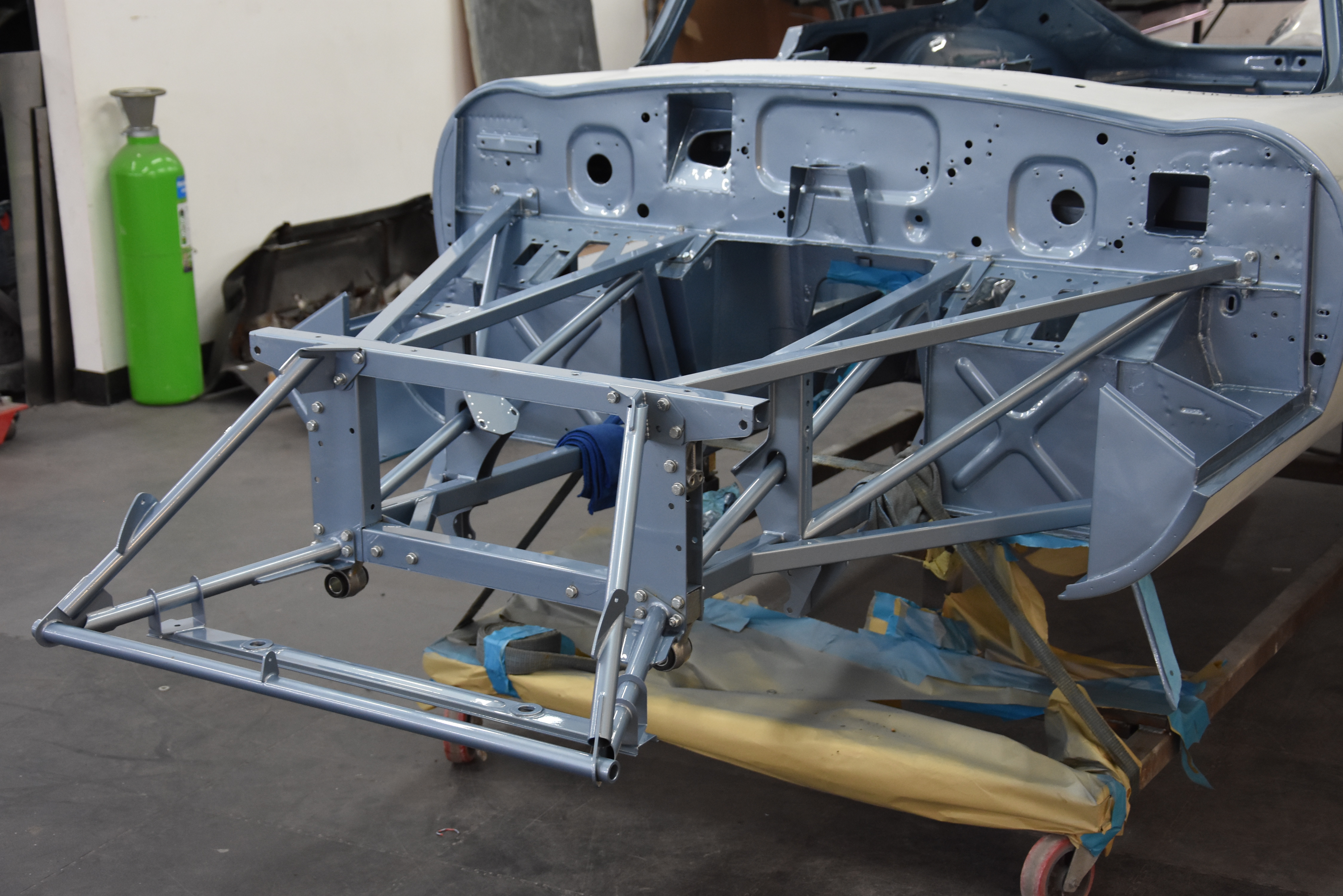 Having returned to the workshop and finished in its brand new stunning Opalescent Silver Blue, the Series 1 is ready for the re-assembly stage. Safely put onto the ramp the team begin building back up the 1960's icon starting with fitting its uprated IRS, now featuring uprated callipers and green stuff brake pads, also fitted is the front suspension creating a rolling shell, making the car much easier to work with in a busy workshop such as E-Type UK.