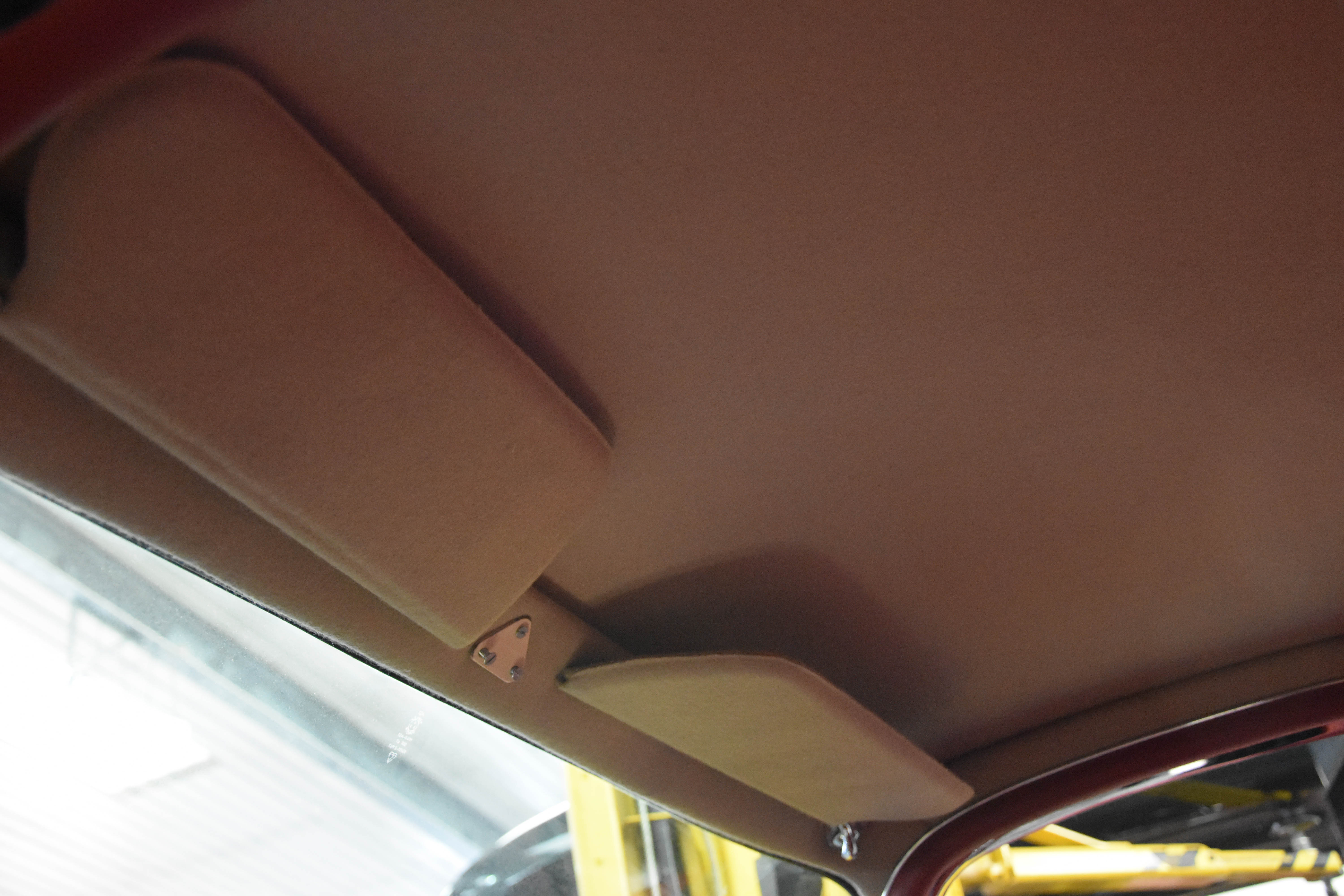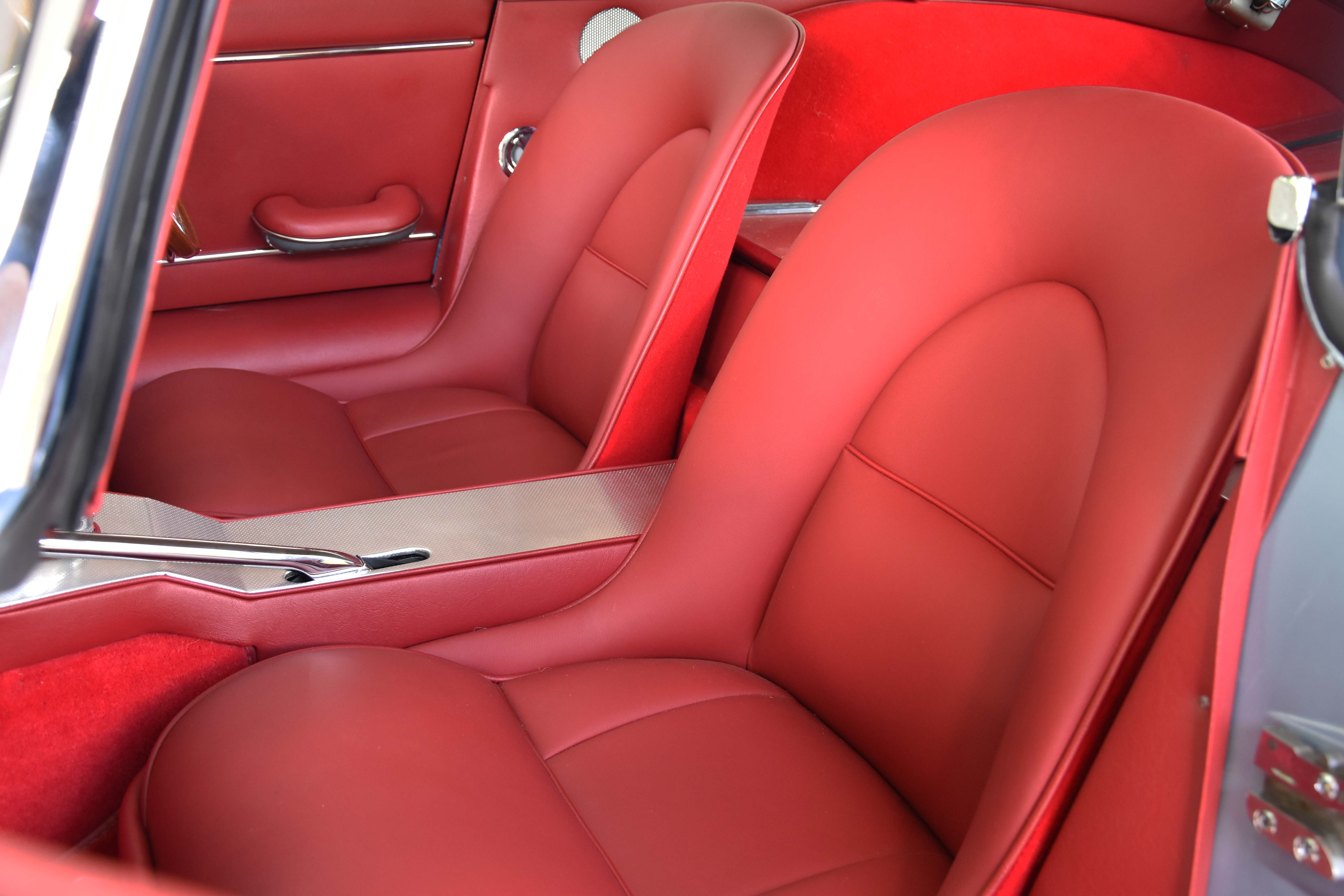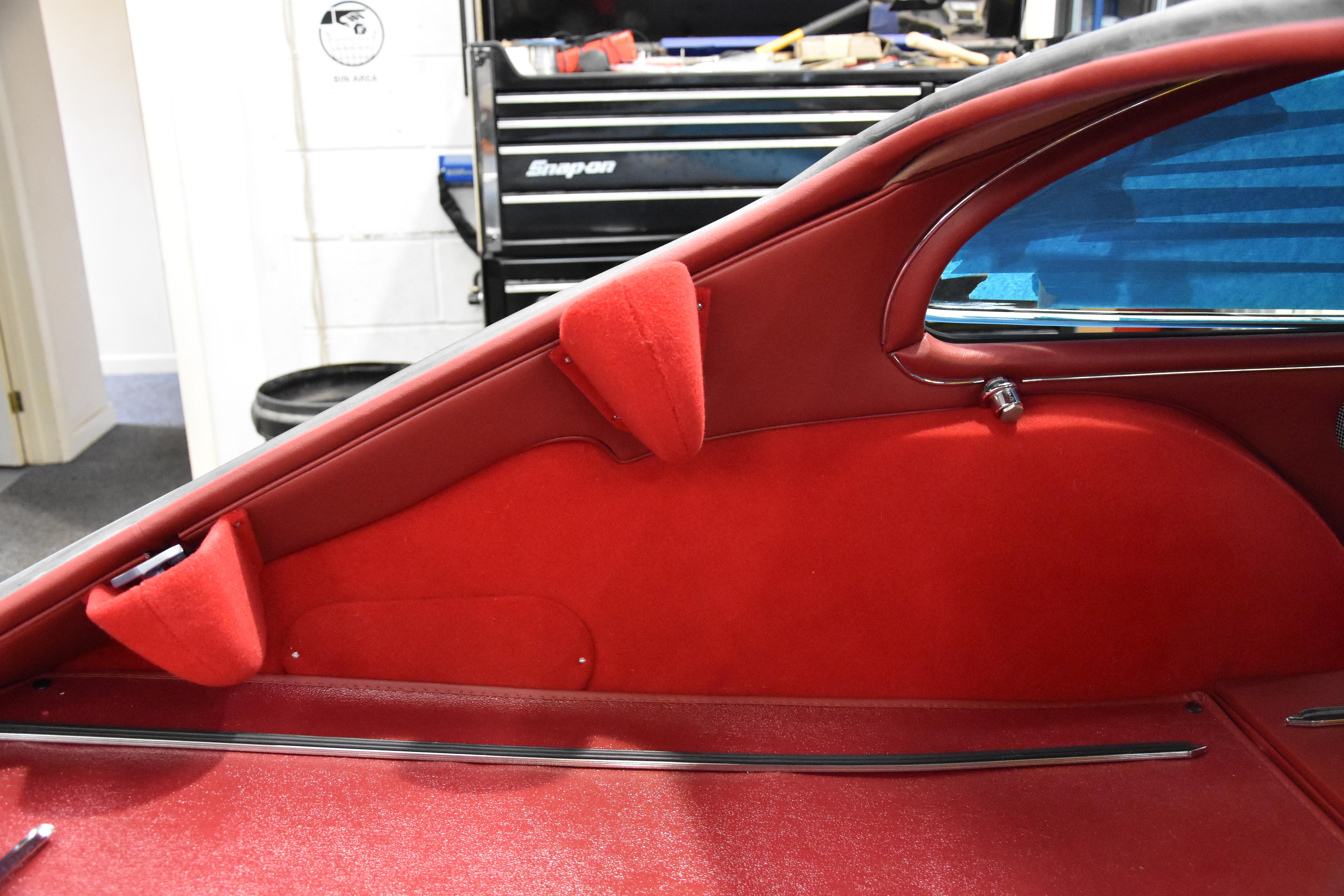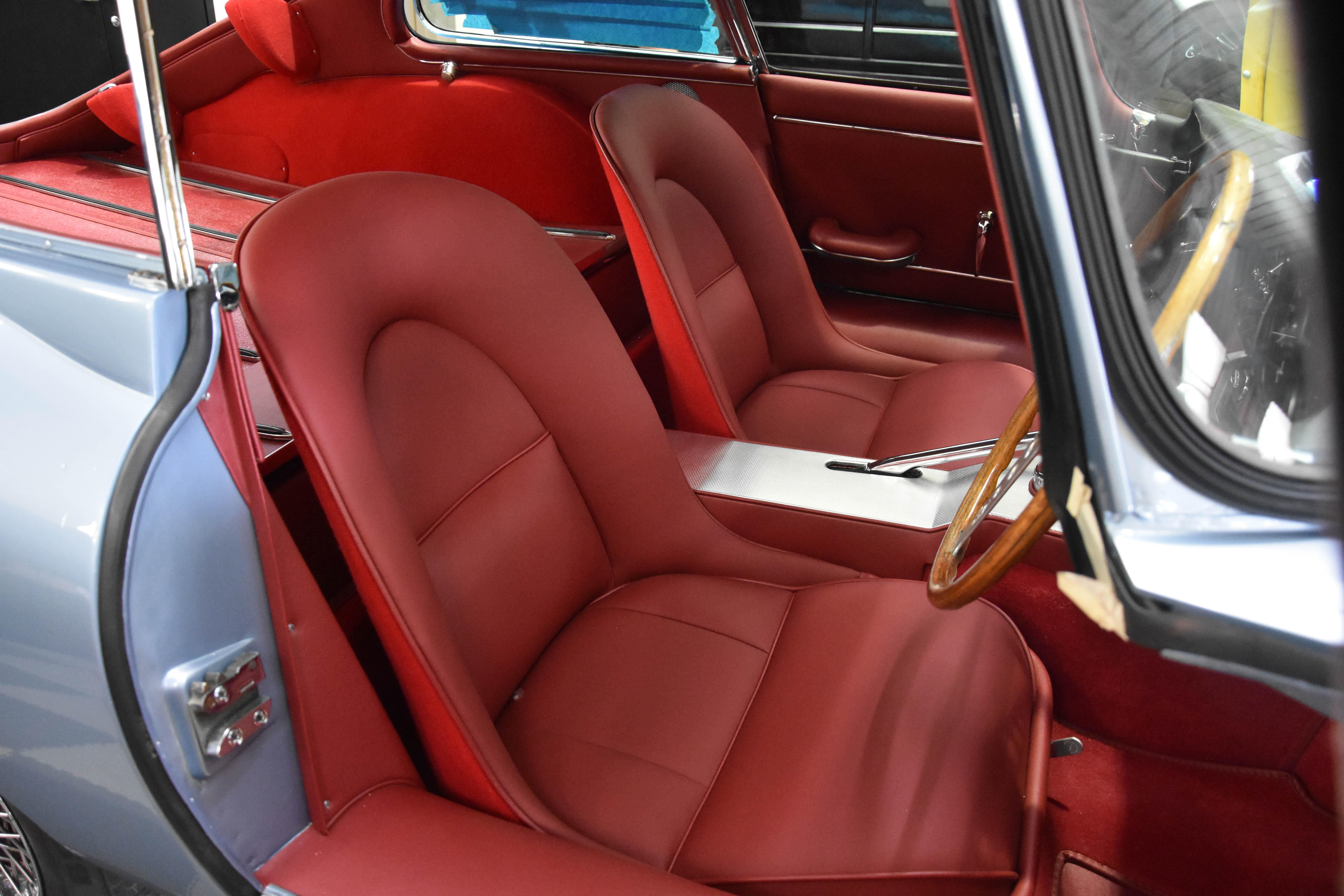 Having completed several short journeys around our Kent based facility, the team are pleased with the running since it’s rebuild, therefore signalling it is ready for the E-type interiors to be given a new lease of life. The car is sent to the trimmers and returns boasting a brand-new interior of Oxblood Red leather. With a fabulous new interior, the teamwork on adding the final touches to the exterior which also includes the client nod towards the lightweight E-type by fitting a red vinyl bonnet mouth also known as ‘lipstick’. Now wearing its ‘lipstick’ and all remaining chrome and headlight surrounds fitted the E-type has completed its restoration.