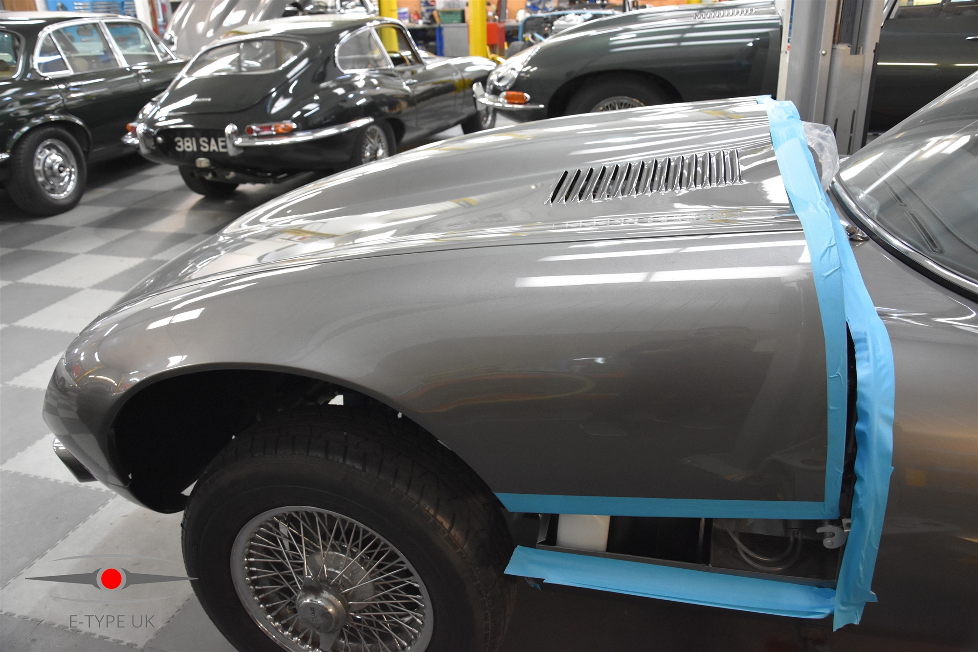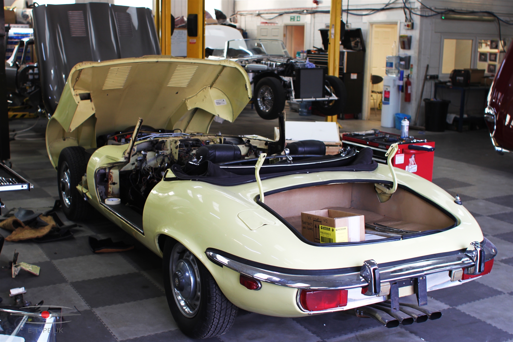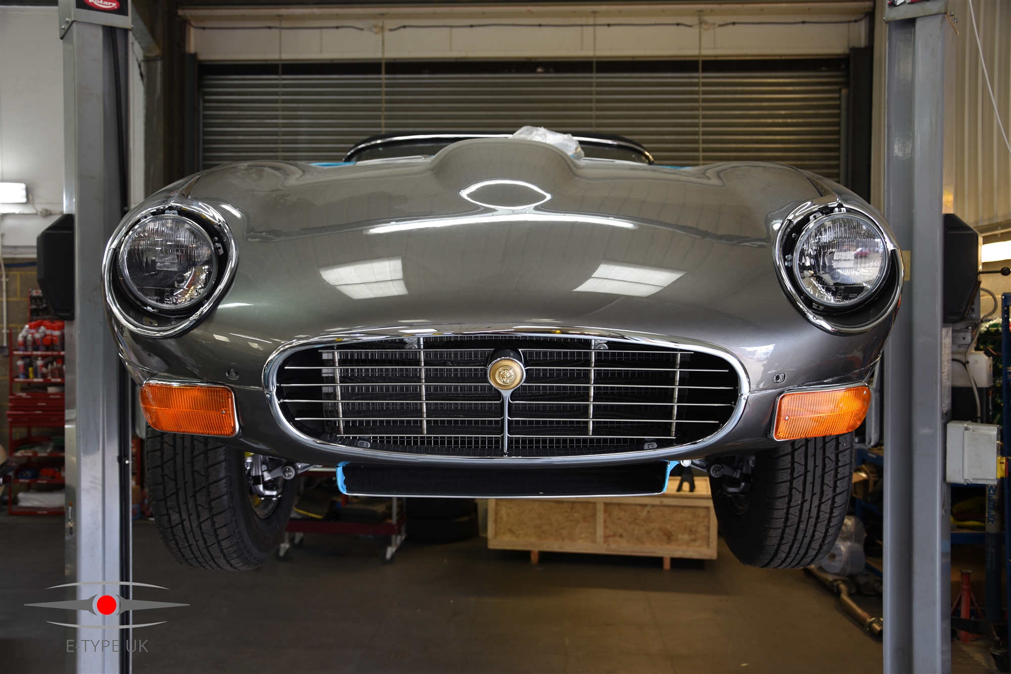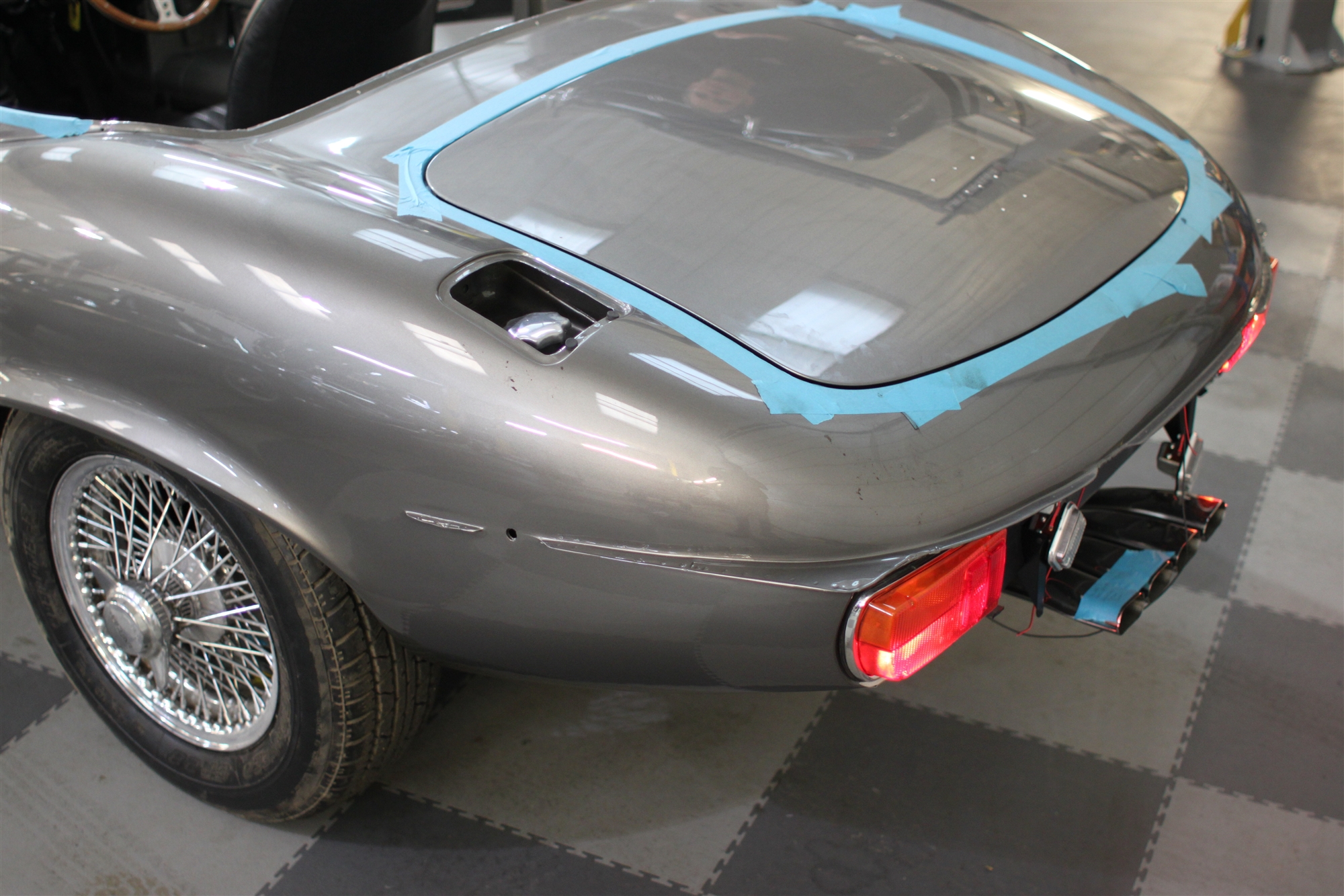 Once it’s running, we can plug the ECU into a computer and set a base map. This is so the V12 can tick over whilst we check for leaks or other issues with the oil, fuel and cooling systems. The car is also put on a set of old wheels and tyres to check that it can now move under its own power correctly. Once all basic checks are complete we can begin to focus on the beautiful exterior of the E-Type.