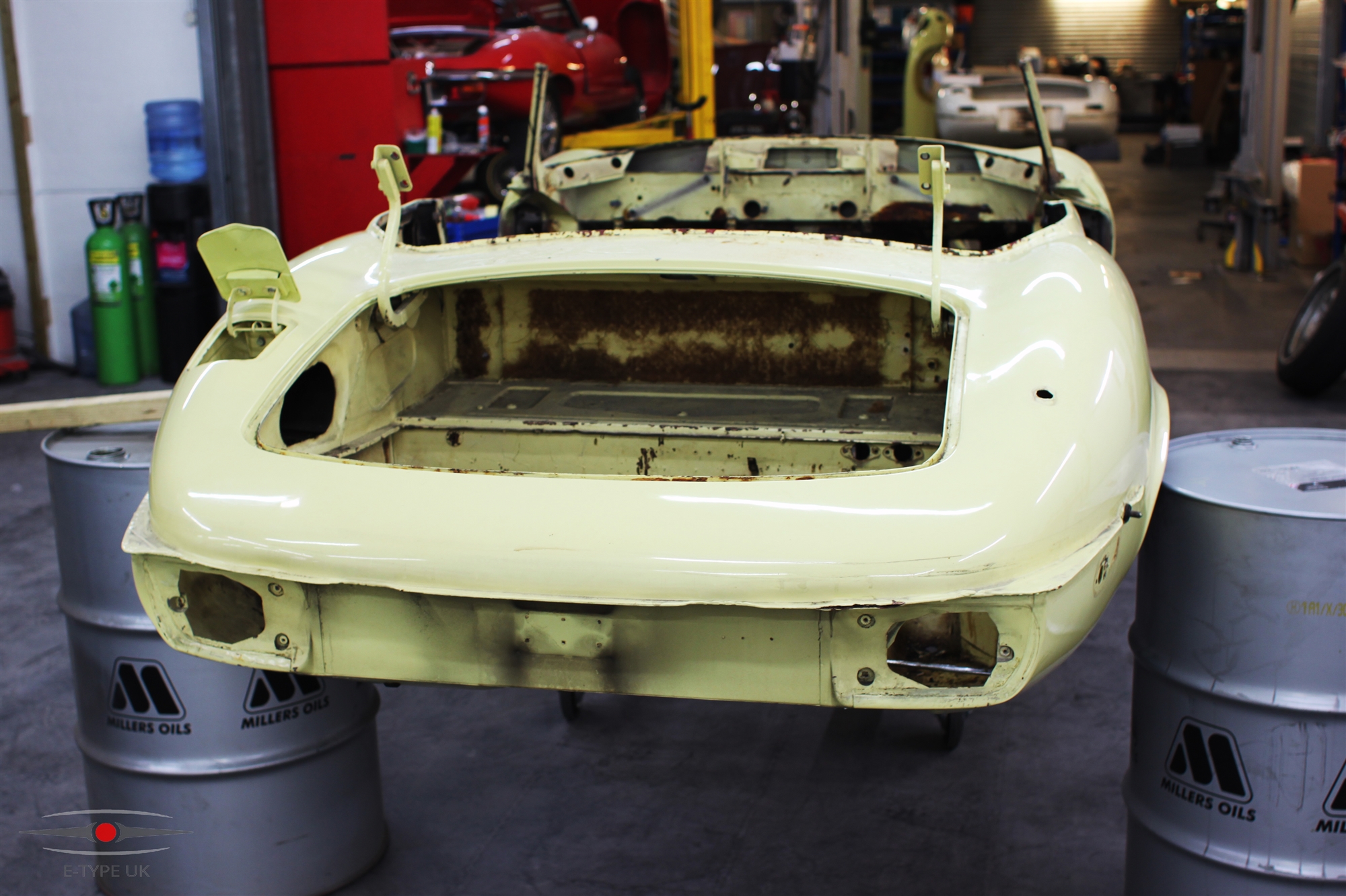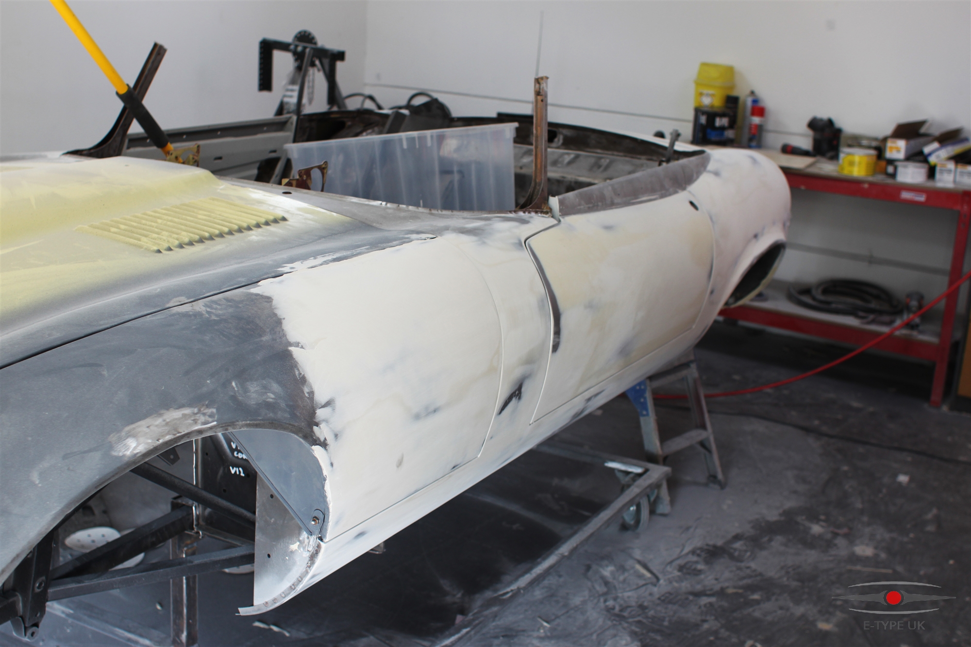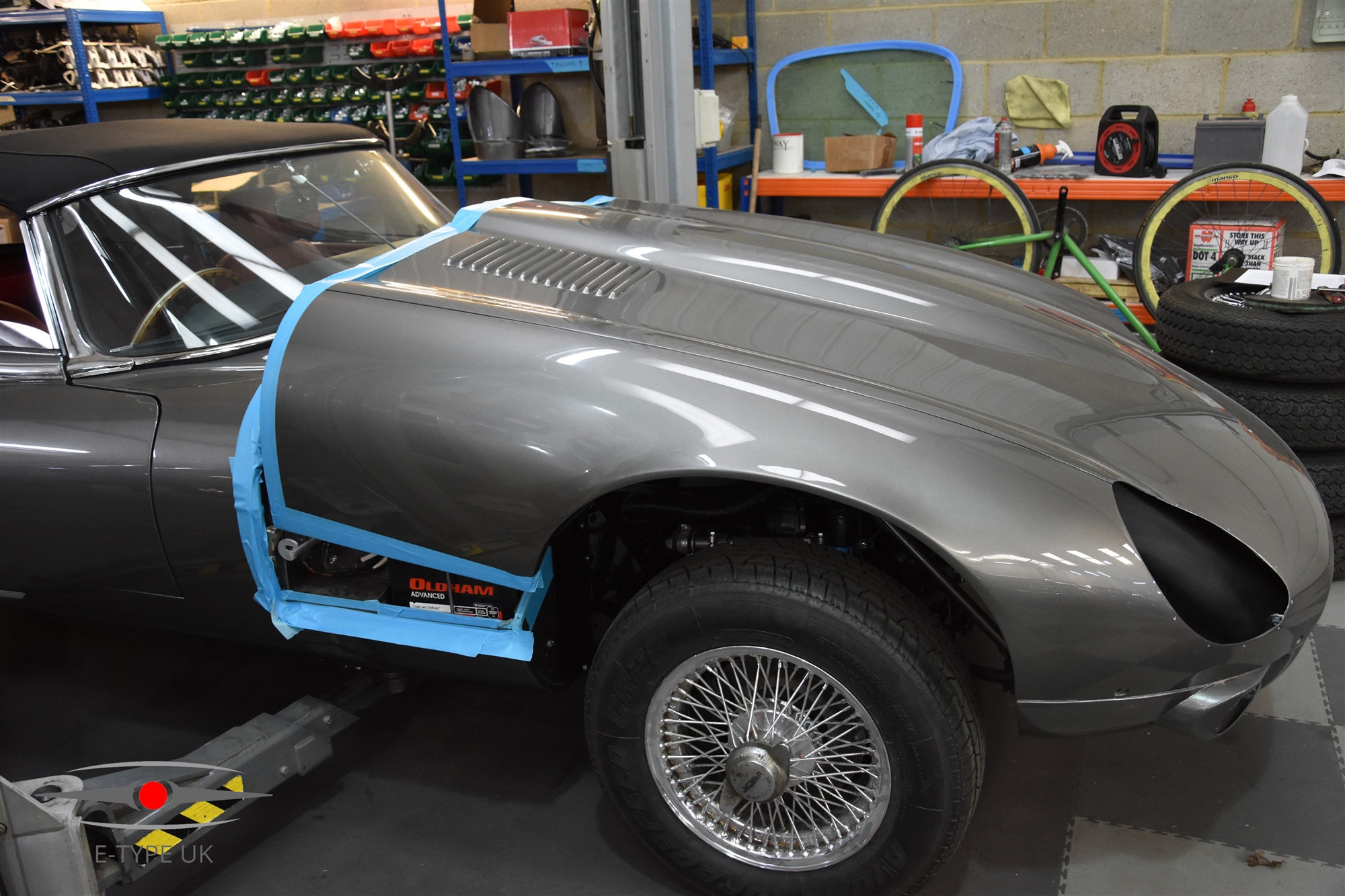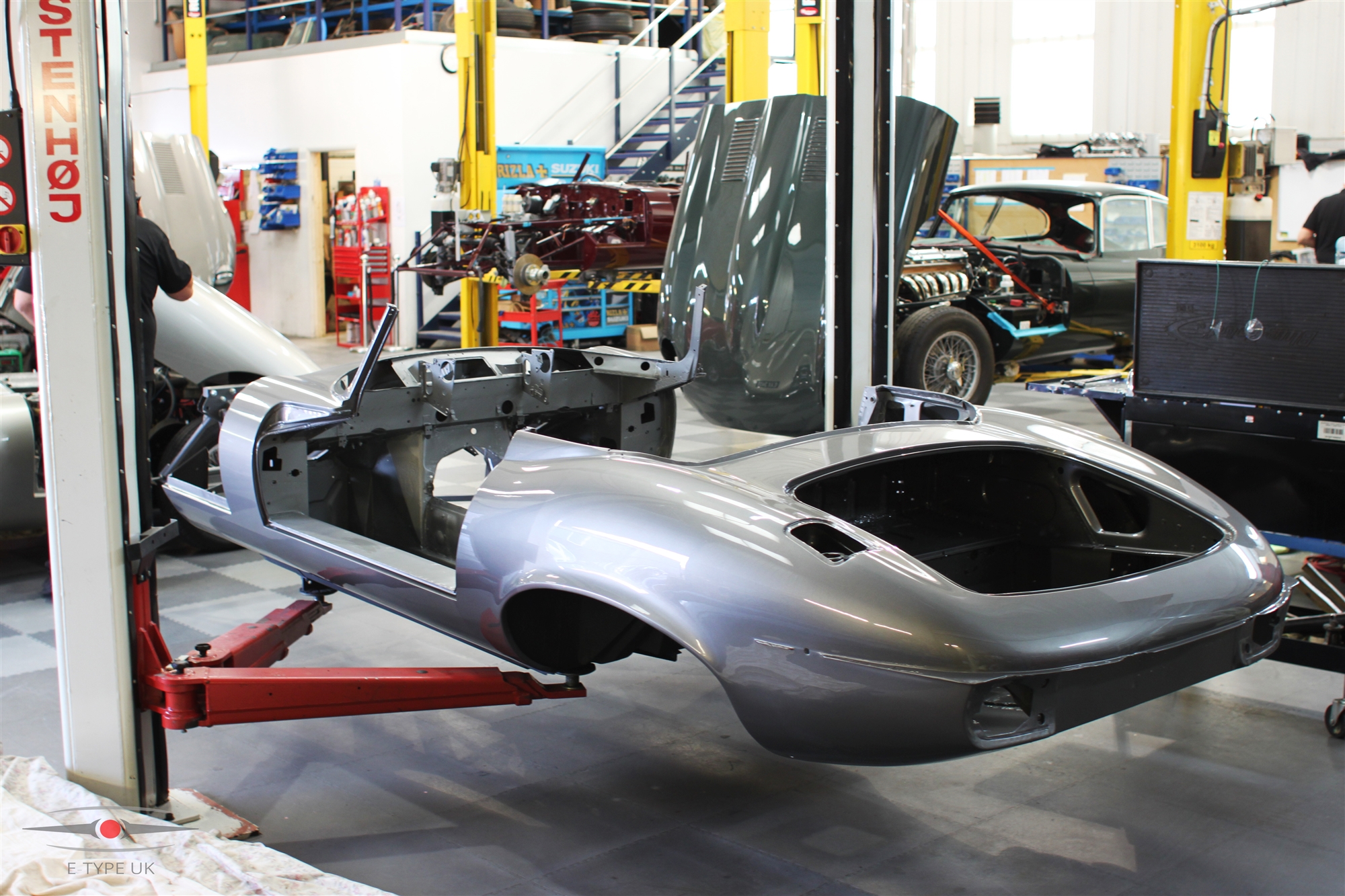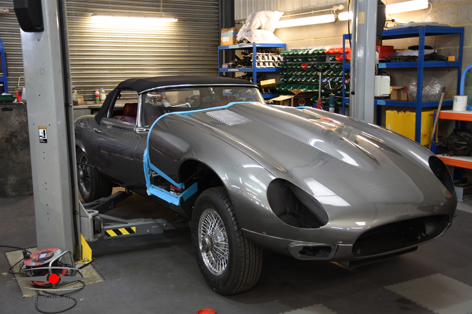 Once it’s running, we can plug the ECU into a computer and set a base map. This is so the V12 can tick over whilst we check for leaks or other issues with the oil, fuel and cooling systems. The car is also put on a set of old wheels and tyres to check that it can now move under its own power correctly. Once all basic checks are complete we can begin to focus on the beautiful exterior of the E-Type.