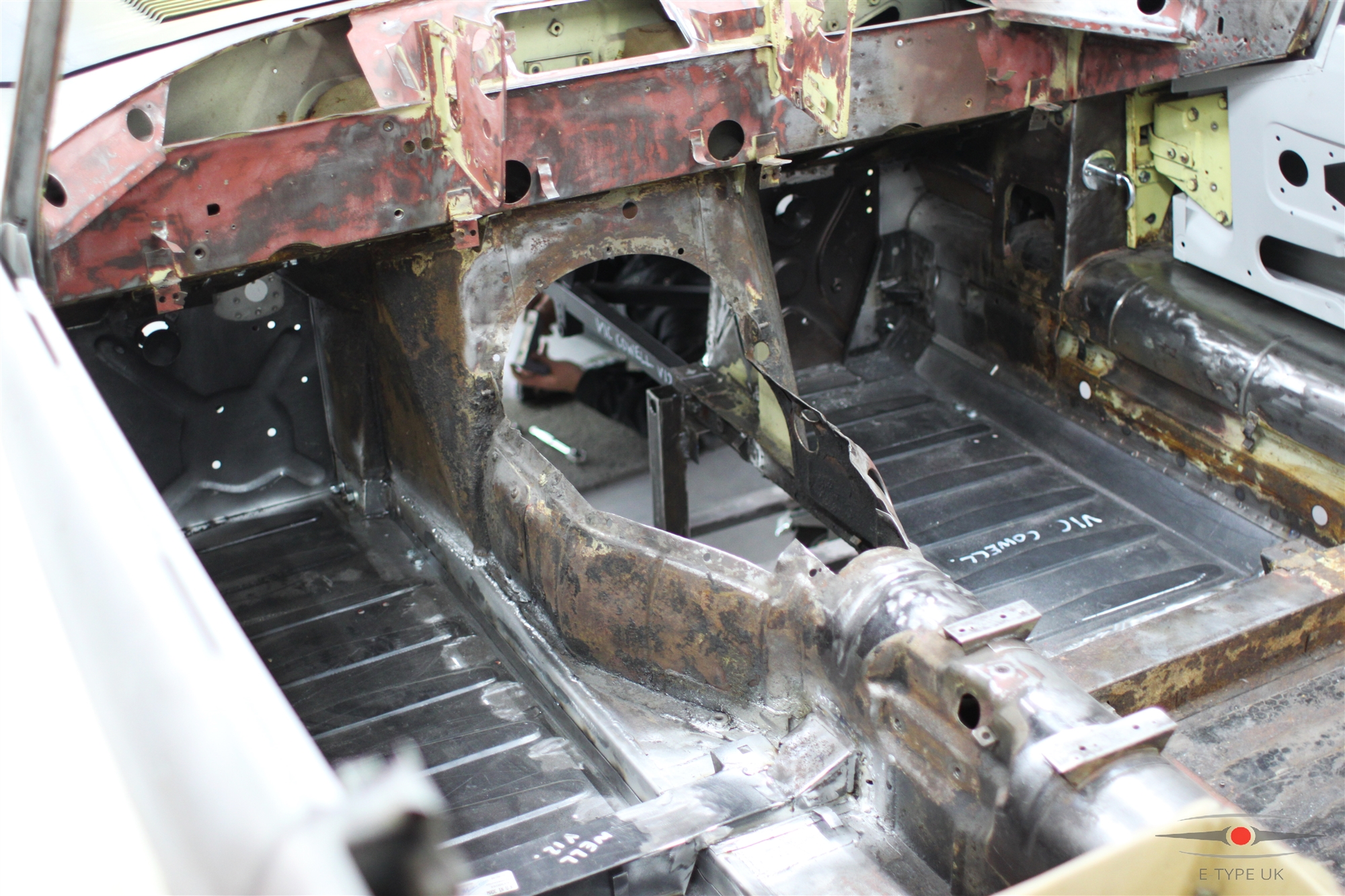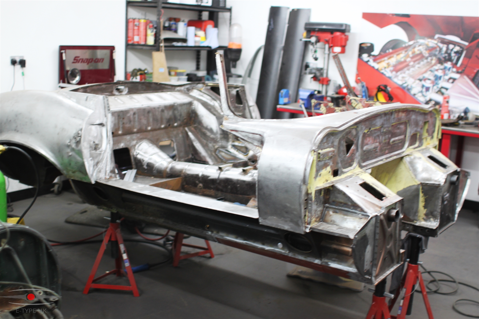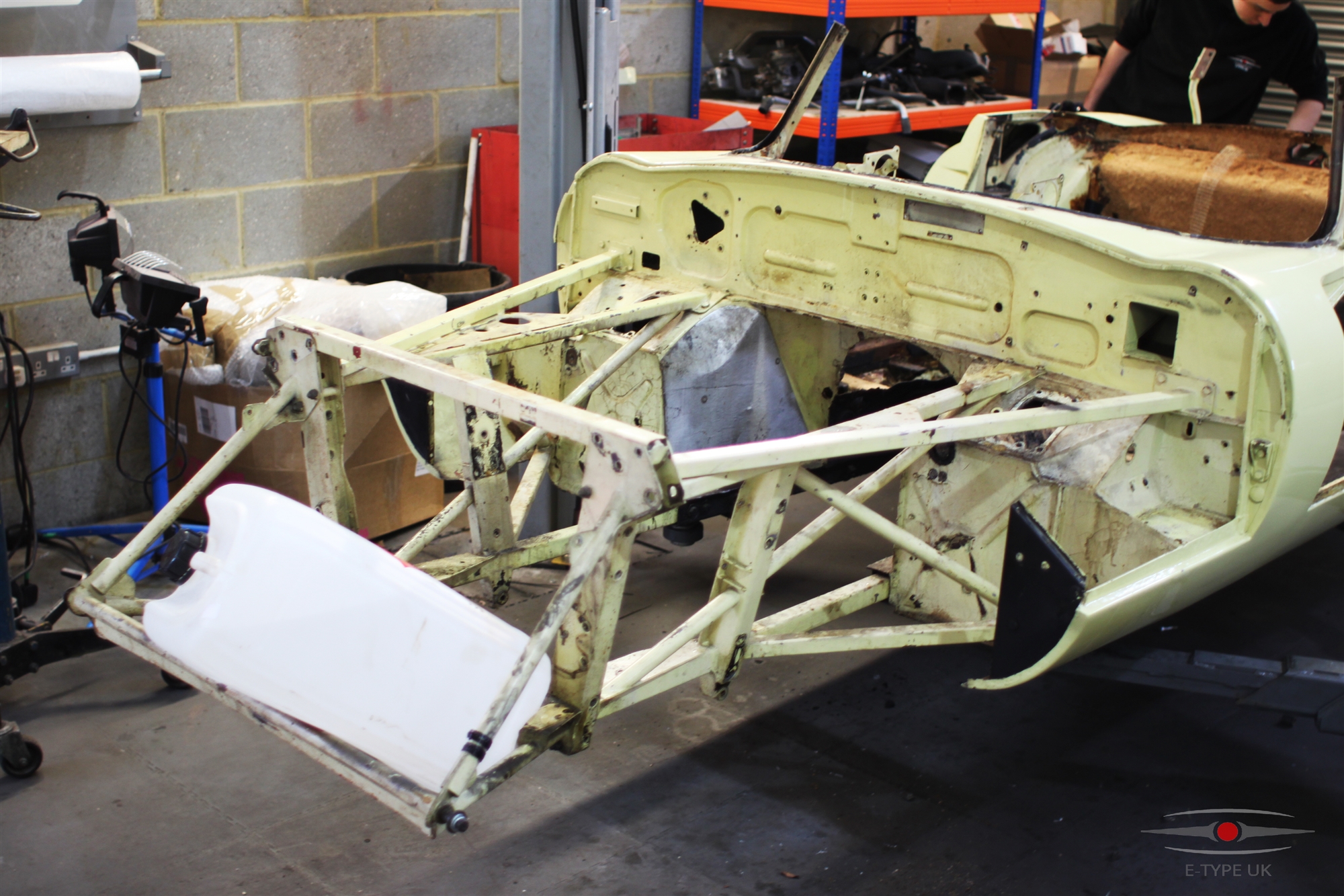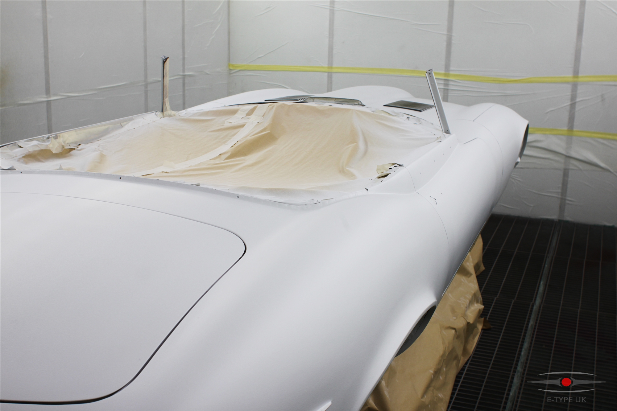 Once it’s running, we can plug the ECU into a computer and set a base map. This is so the V12 can tick over whilst we check for leaks or other issues with the oil, fuel and cooling systems. The car is also put on a set of old wheels and tyres to check that it can now move under its own power correctly. Once all basic checks are complete we can begin to focus on the beautiful exterior of the E-Type.