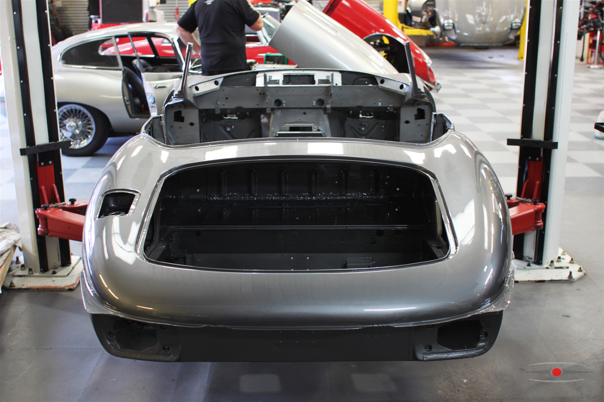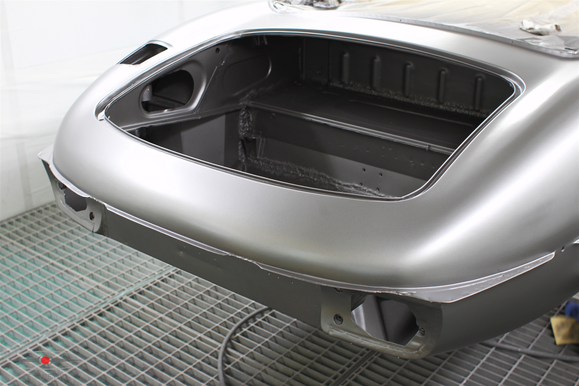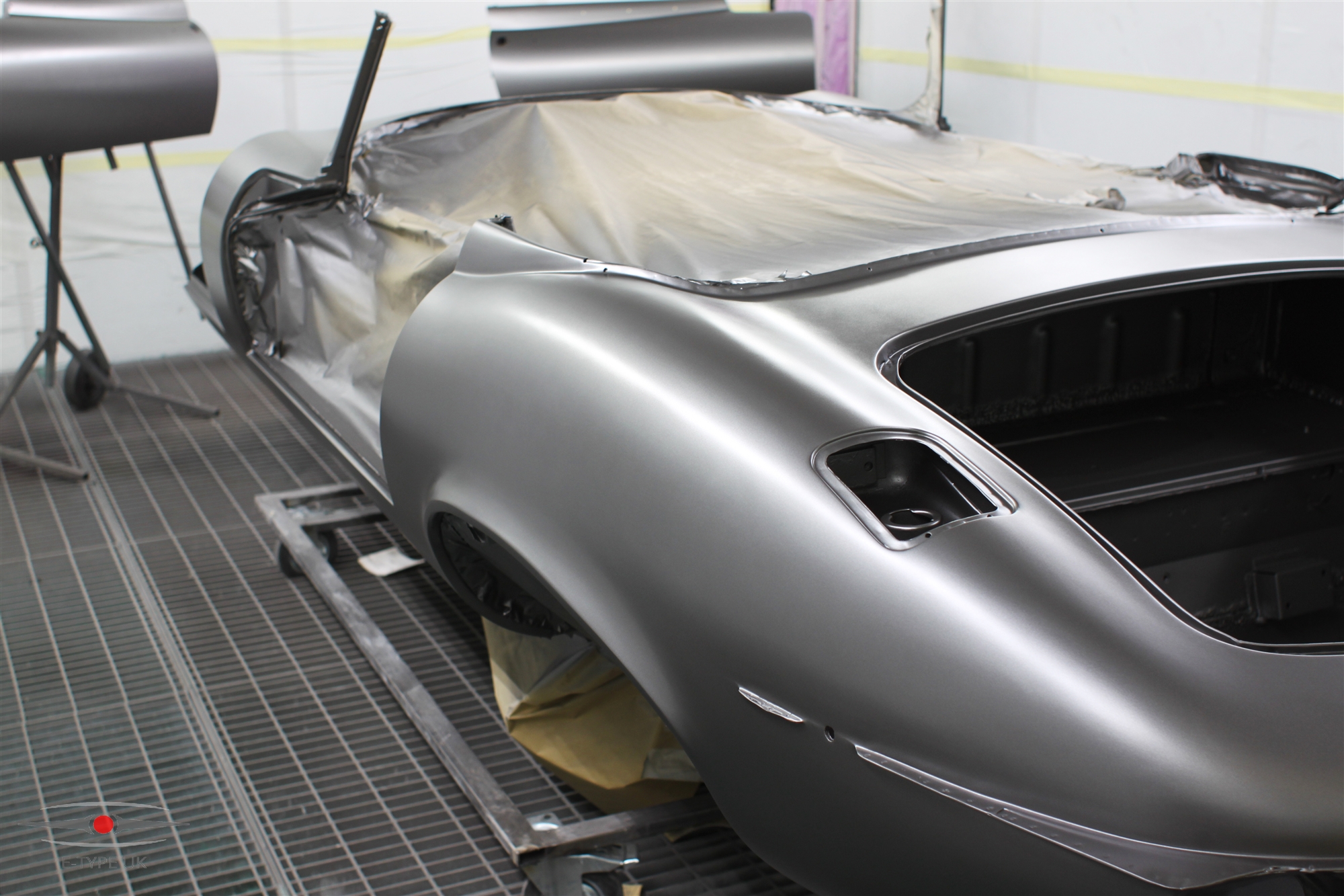 Once the lines are smoothed and bonnet, boot, and door shuts are perfected with the filler, primer is applied along with a guide coat which shows up any imperfections in the shape of the panels. These imperfections are eliminated by a repeated process of rubbing and priming until the spots no longer show up with the guide coat. The shell was then sprayed in Opalescent Gun Metal Grey and flatted then polished until the desired finish was acquired.