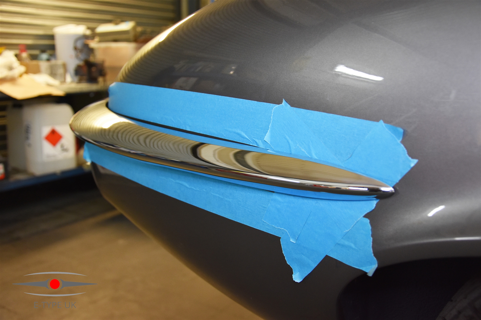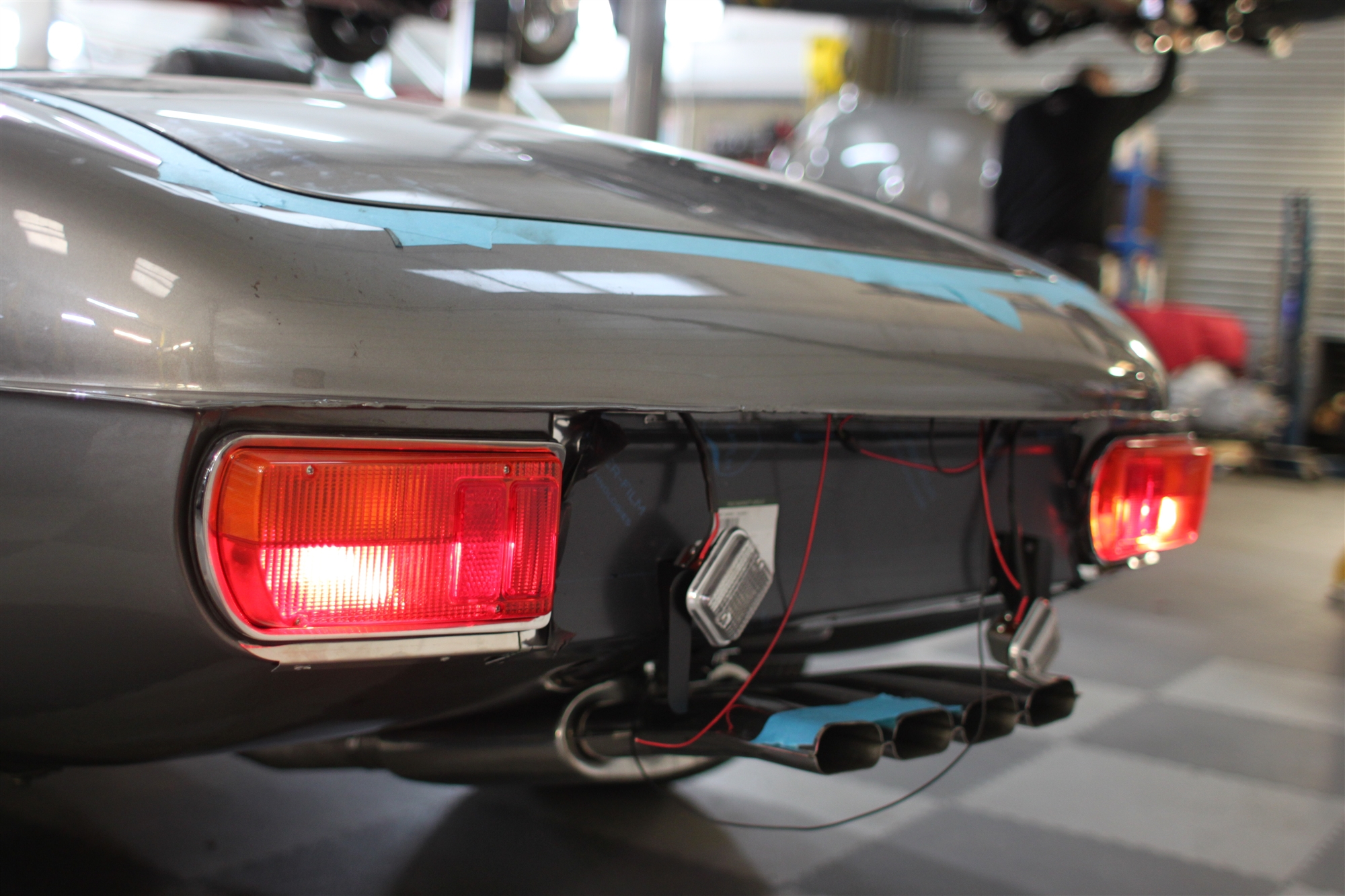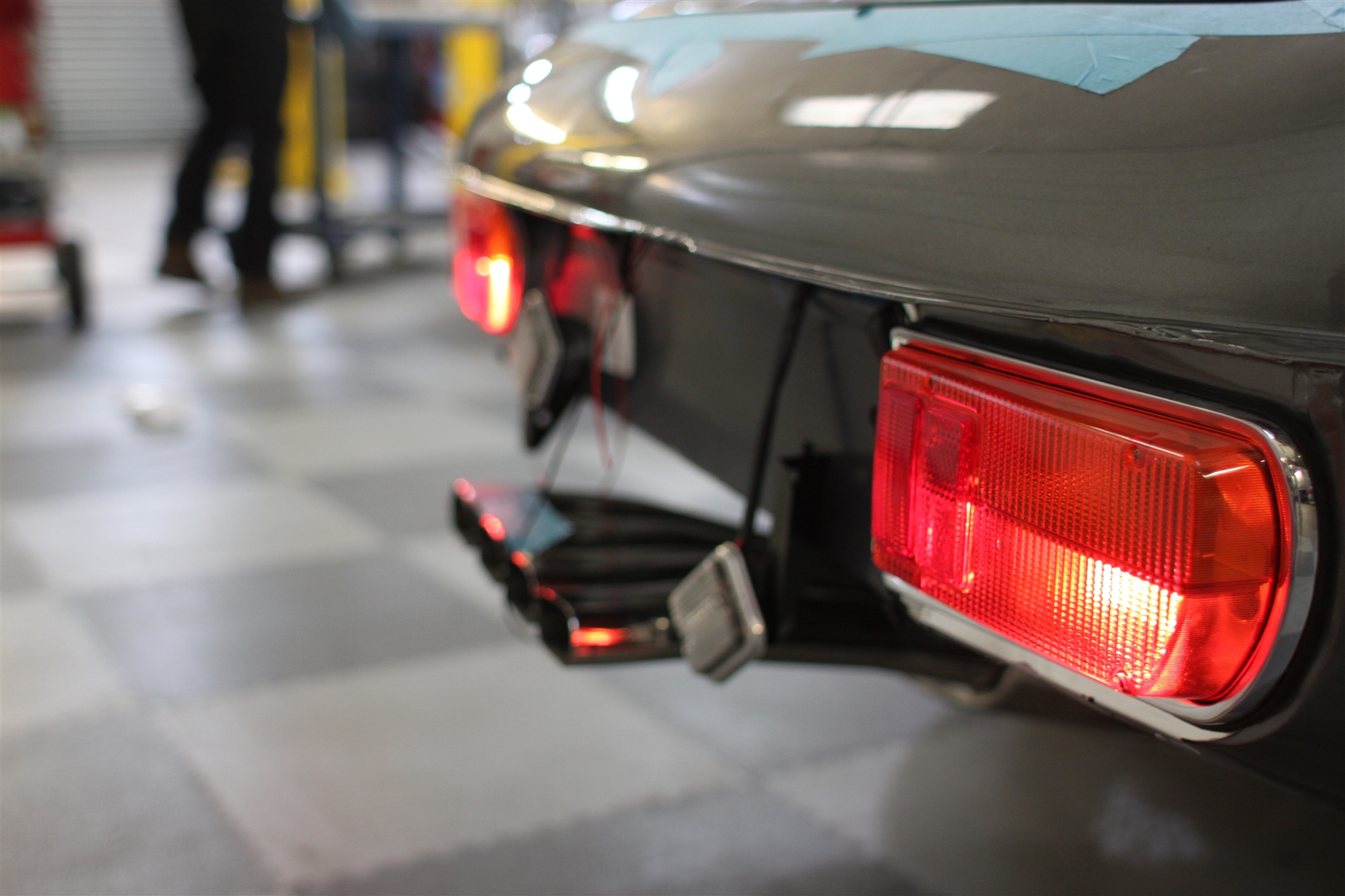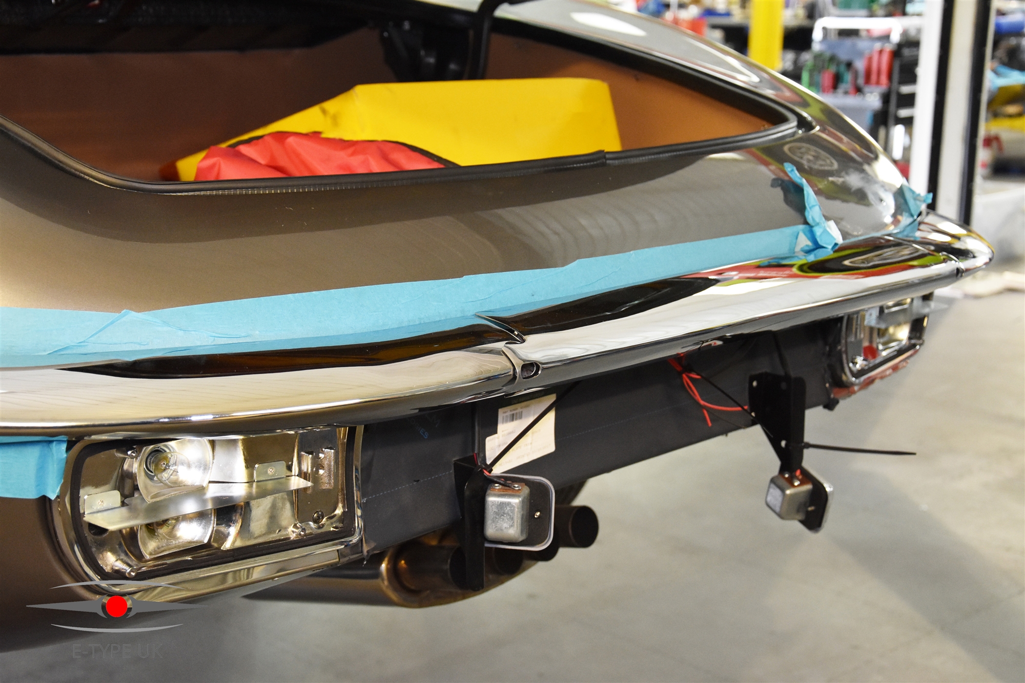 The rear light clusters are wired up, attached and tested before the newly chromed wrap-around rear bumper is fitted up. Chrome fitting is one of the most tense part of any classic restoration, it needs to line up perfectly using the adjusters behind the metal.