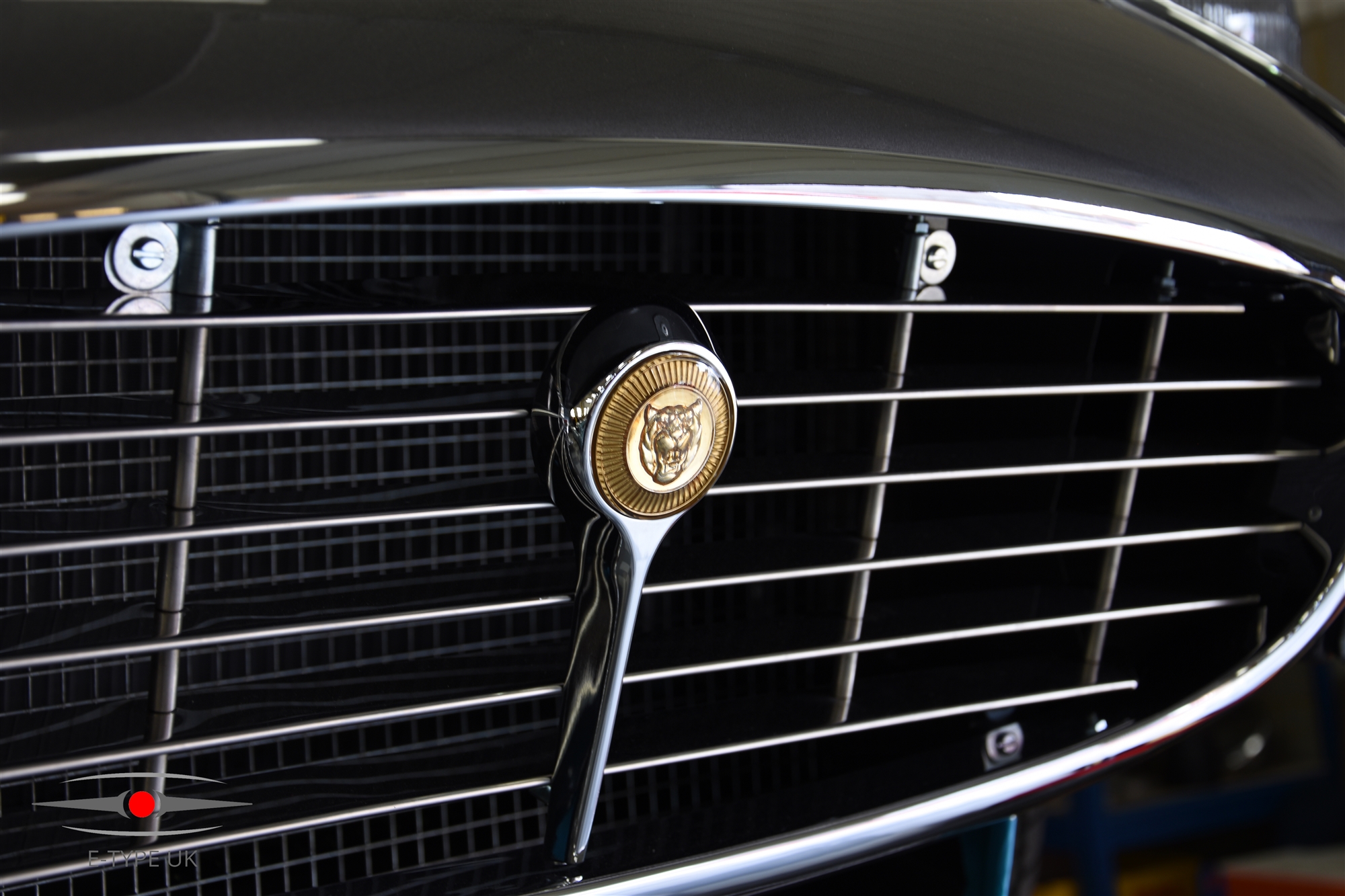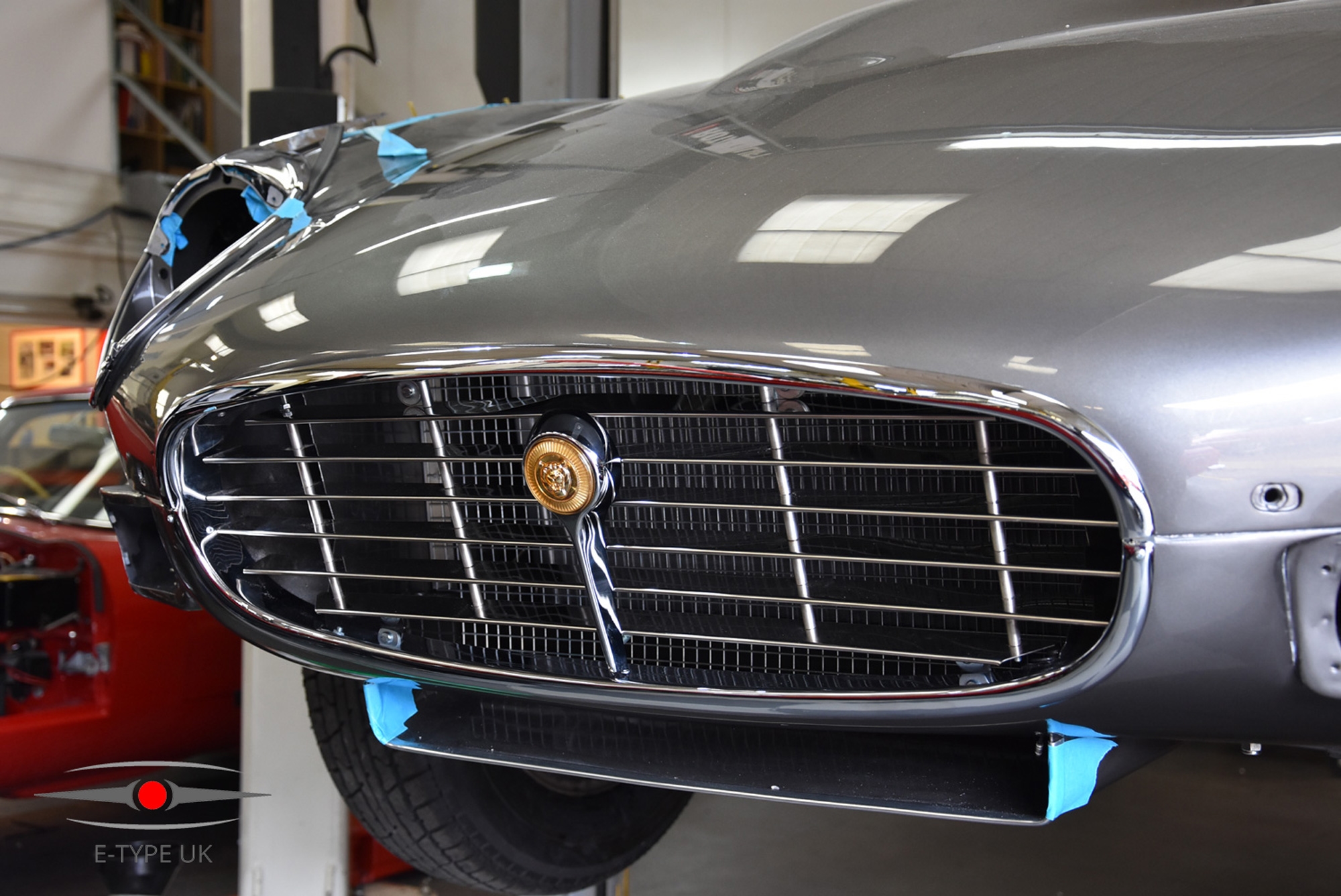 With the Series 3 now back from the trimmers the restoration has been storming ahead. Now back in the workshop in its new eye-catching Oxblood red interior and black mohair hood which ties the Opalescent Gun Metal Grey paintwork all together, the restoration moves onto installing the bonnet and external chrome fittings.