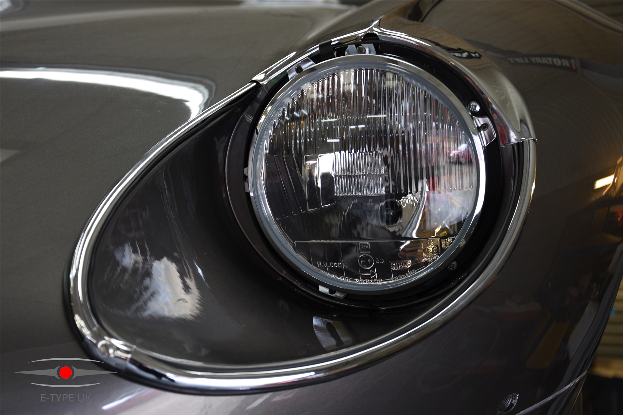 With the bonnet safely attached, the workshop team spends plenty of time installing the freshly re-chromed fittings as everything needs line up perfectly and look the part. Each piece of chrome needs to be fitted as close as possible without touching but still maintaining even gaps all round that ensures we get that desirable and original 70’s iconic look. The rear bumpers, bonnet beading, headlight chrome, grille and surrounding chrome have now fitted, with the most recent installation being the headlights – you can now really start to see the face of the car coming together.